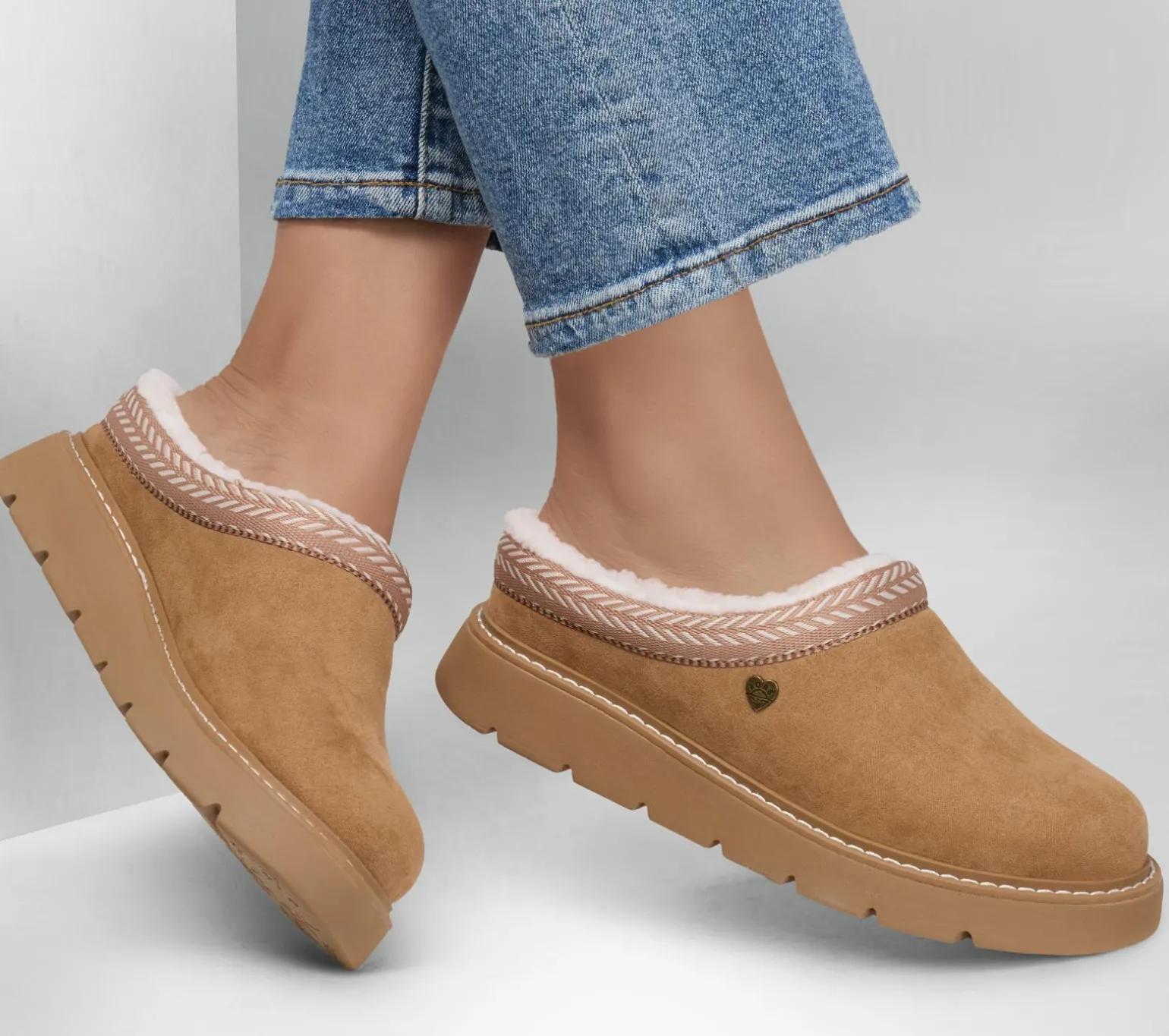 Spend the season in cozy comfort wearing BOBS® from Skechers® Keepsakes Lite – Cozy Fest. This casual mule style features a vegan suede upper with a tapestry ribbon collar trim, faux shearling lining and footbed, plus a Skechers Memory Foam cushioned comfort insole. For every BOBS® purchase, a donation is made to animals in need.