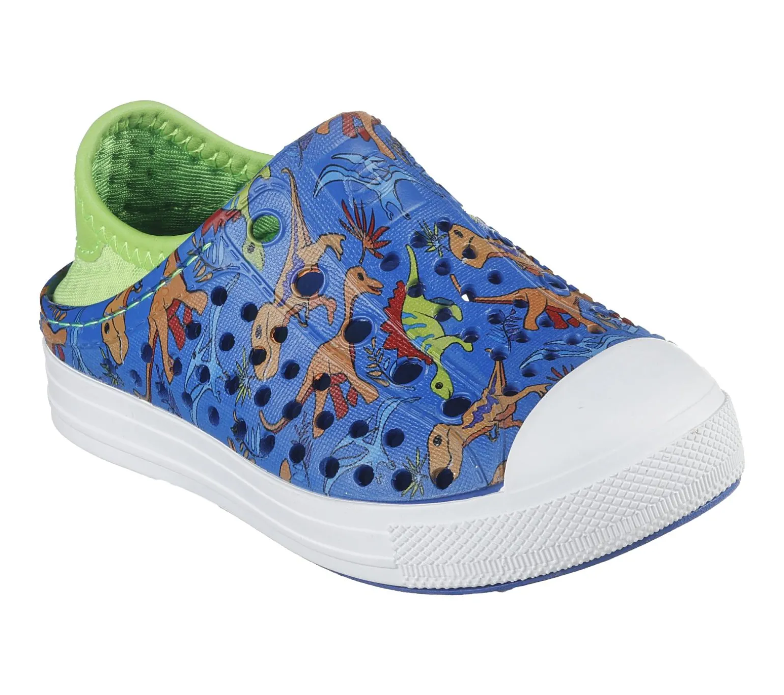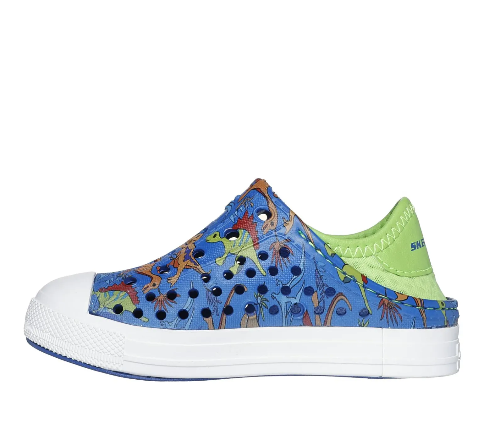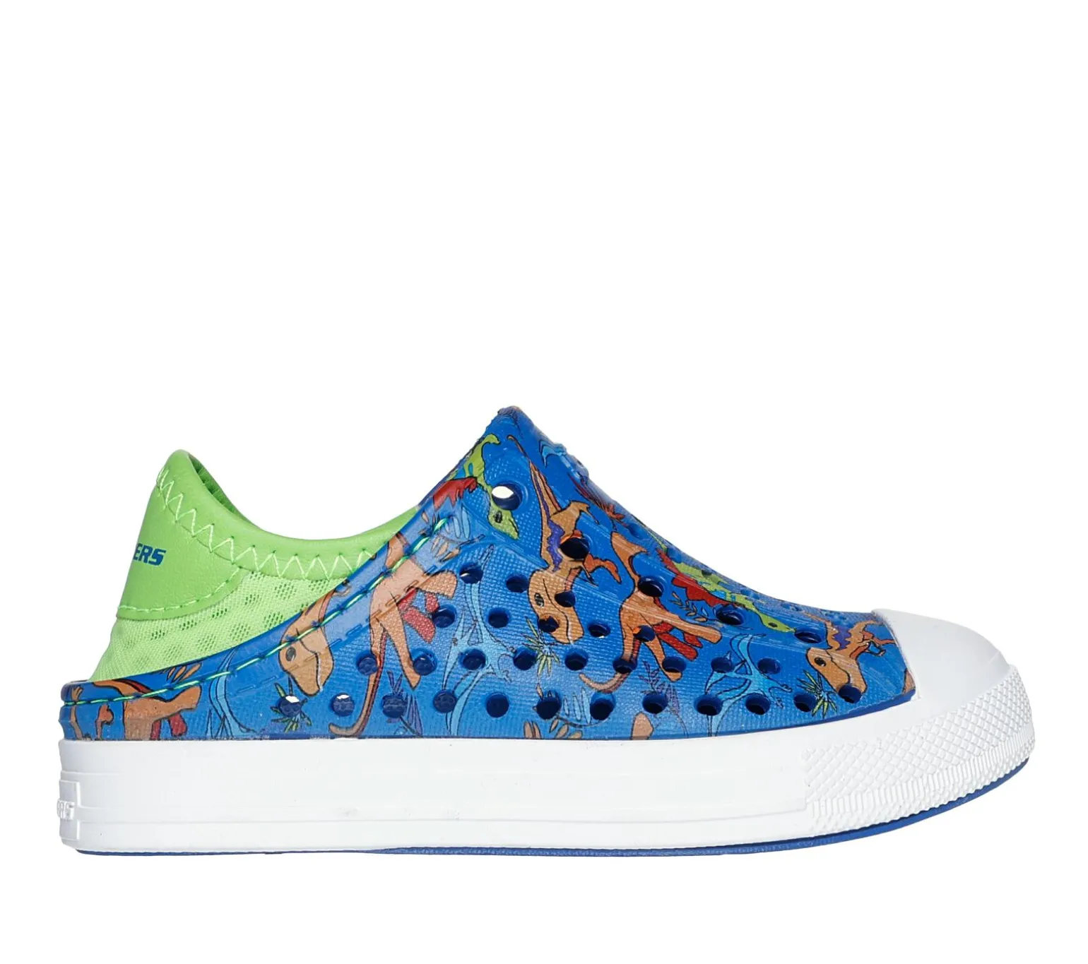 Skechers Squishables Colorful fun of Jurassic proportions comes in Skechers Foamies®: Guzman Steps – Lil Dino. Featuring a dinosaur printed perforated EVA sculpted design and a soft collapsible neoprene heel.