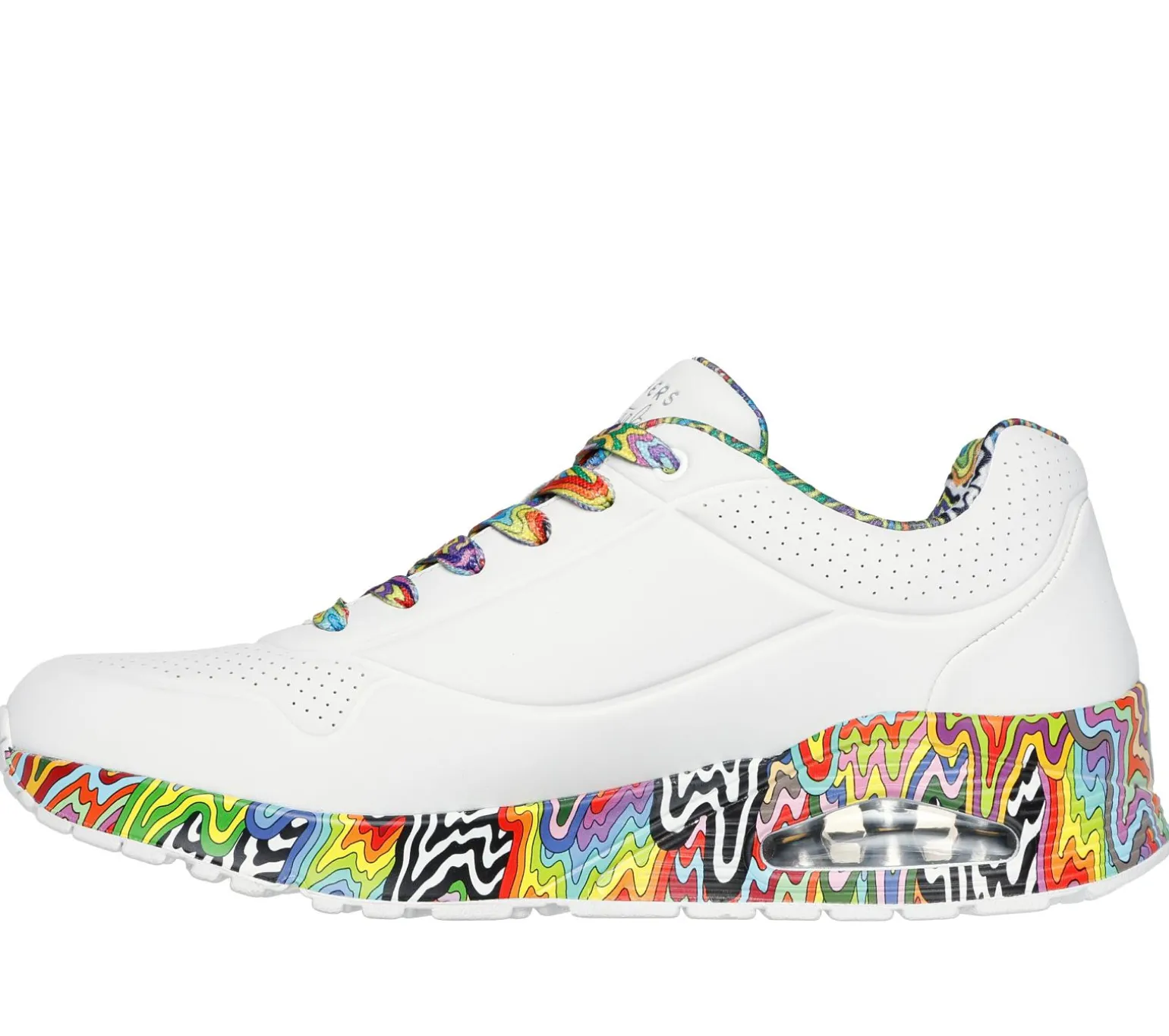 Jen Stark brings her hypnotic and captivating colorful patterns to Skechers Street in this creative collaboration. The eye-catching Skechers Street x Jen Stark: Uno – Stark Mini Drip features a smooth durabuck upper with the artist’s signature drip design printed on the midsole, lining, and laces. This design is complete with a Skechers Air-Cooled Memory Foam® insole, and visible Skech-Air® airbag midsole.