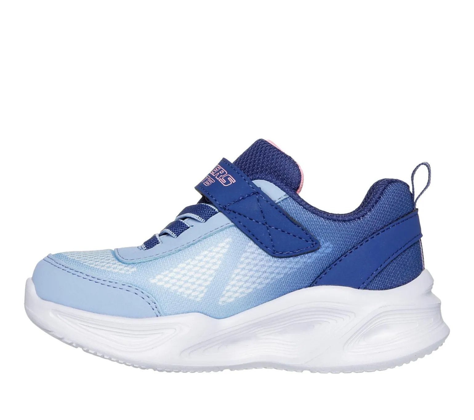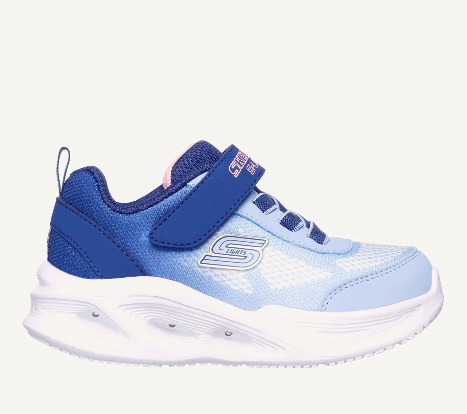Bring the fun in sporty fashion wearing Skechers S-Lights®: Sola Glow – Ombre Deluxe. This active multi-colored lights design features an ombre mesh and synthetic upper with stretch laces, adjustable instep strap, and well-cushioned light-up midsole.