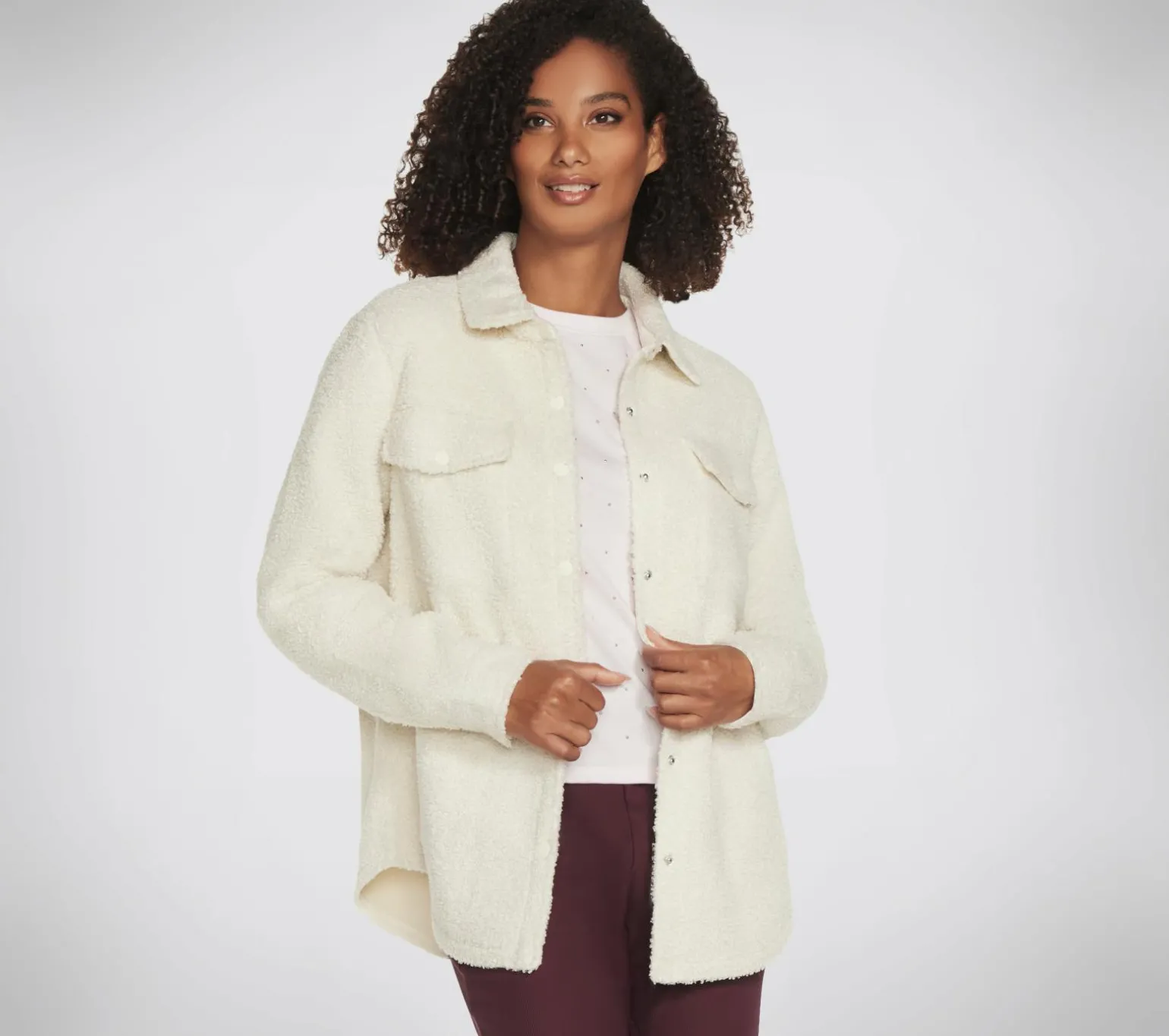 Relax in easy-going comfort and style with the cozy Skechers Sherpa Shacket. This shacket features a snap button front closure, long sleeves, classic collar, and front chest pockets.