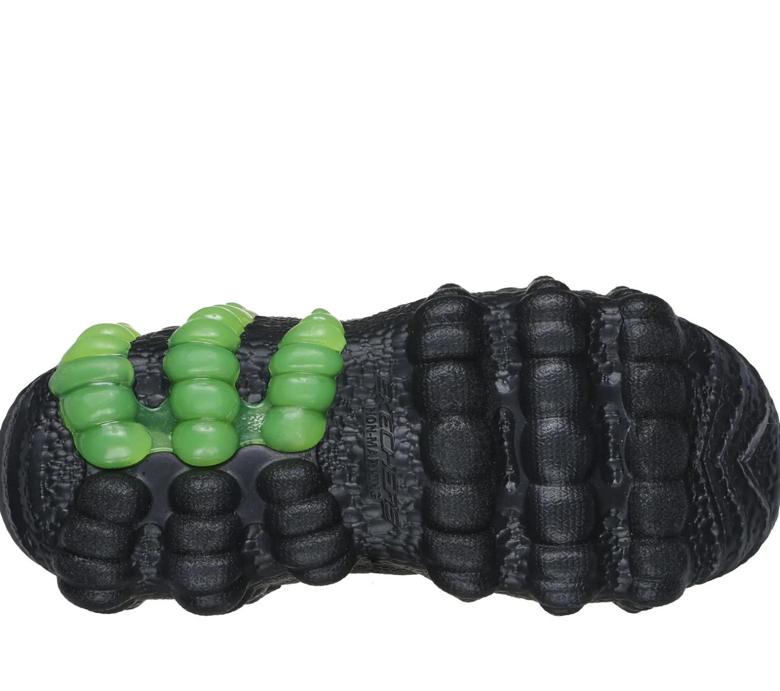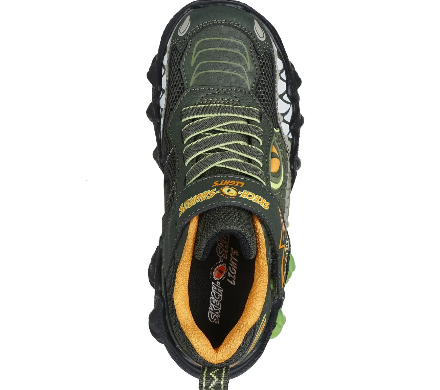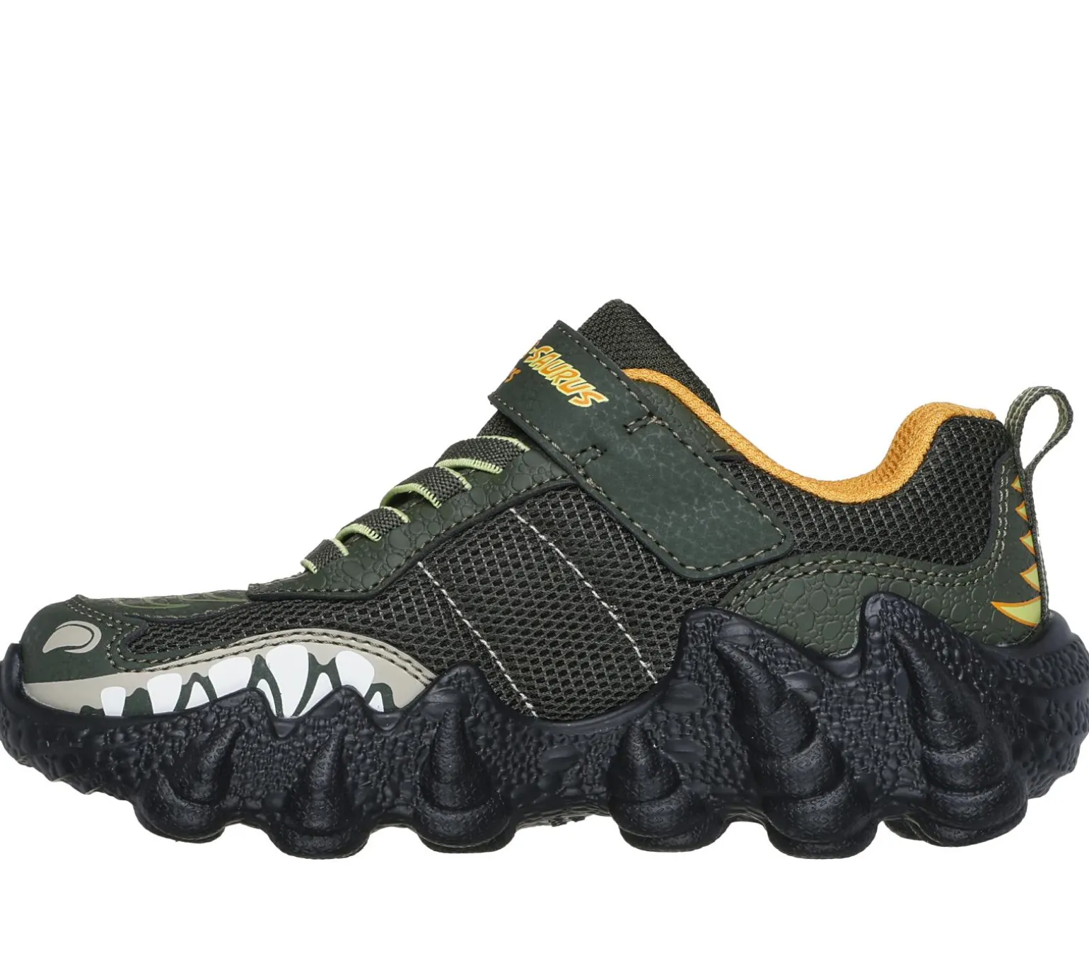Stomp in roar-some fun and comfort wearing Skechers Skech-O-Saurus Light 2.0. This light-up dinosaur theme design features a reptilian style mesh and synthetic upper with stretch laces, Skechers Adaptive Closure and a T-Rex claw midsole.