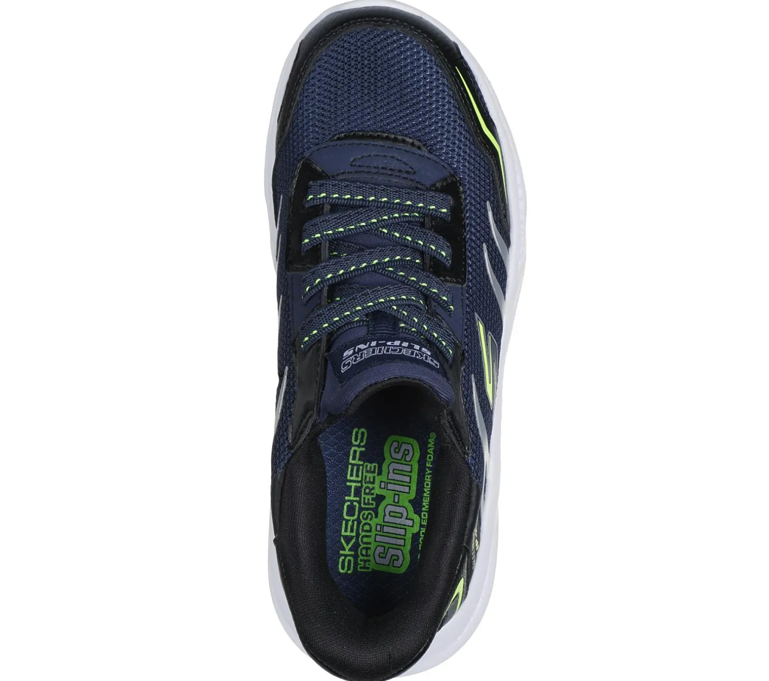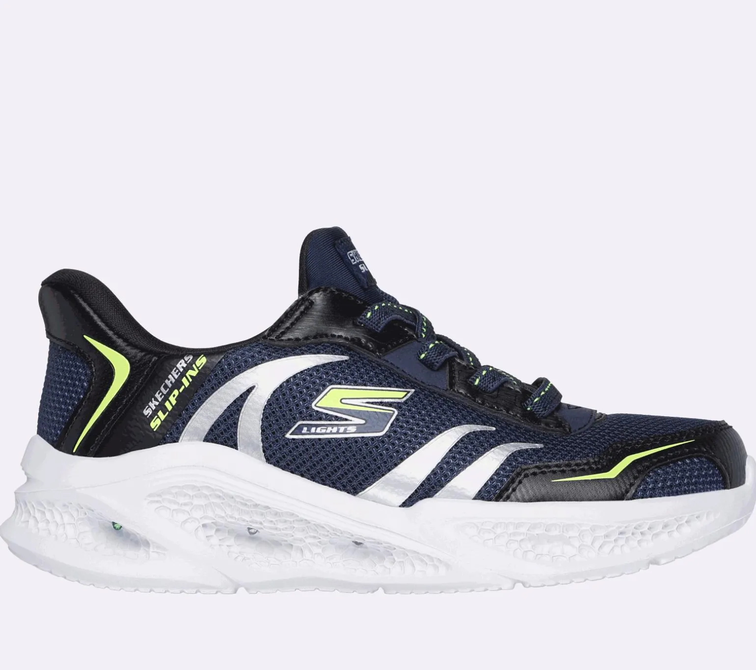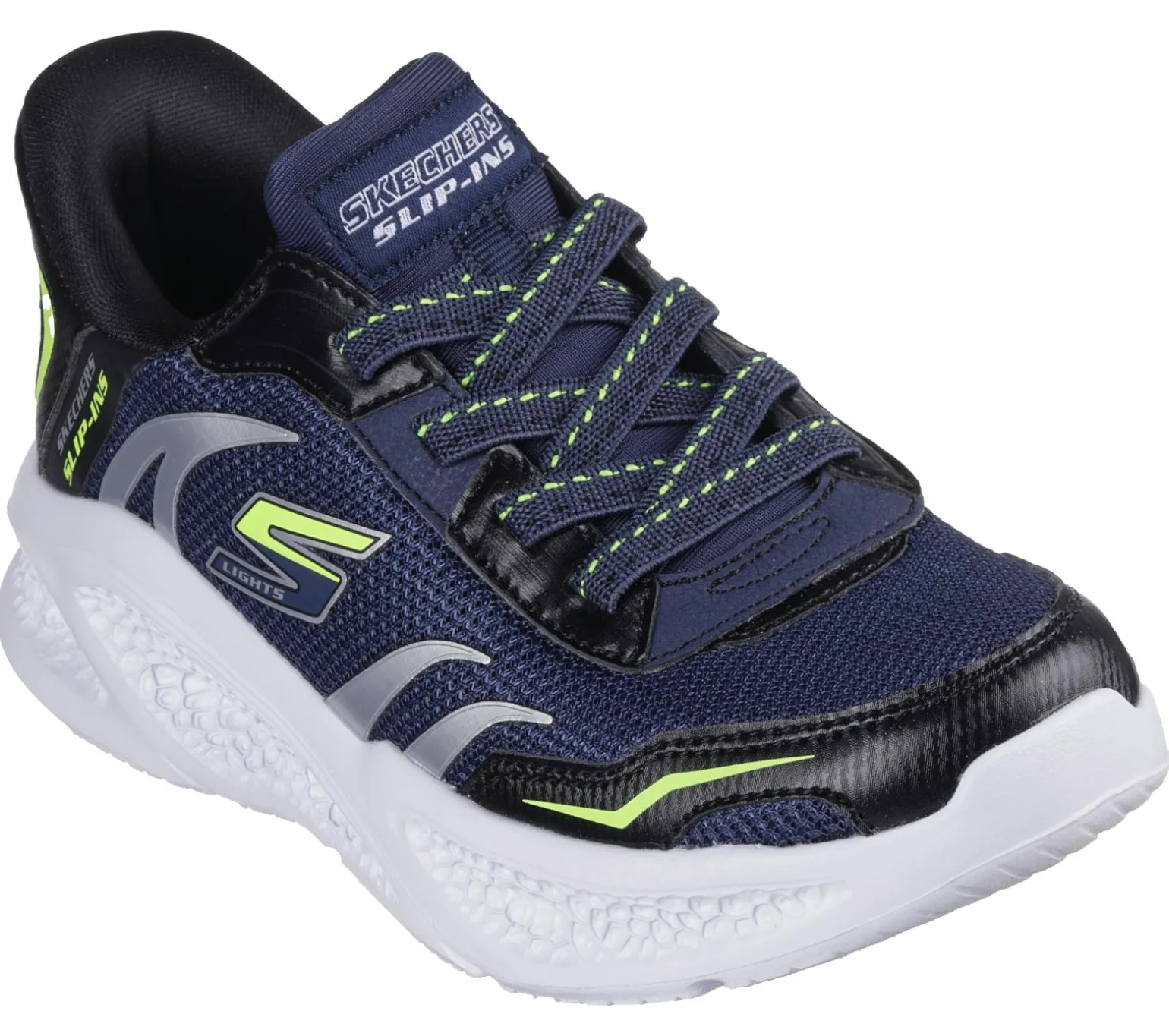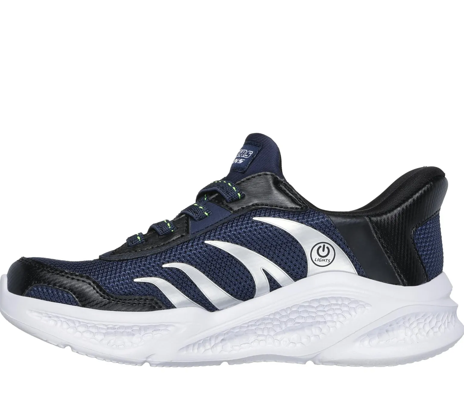 Illuminate your steps in sporty style and comfort with Skechers Hands Free Slip-ins® S-Lights®: Meteor-Lights – Brisk-Beams. Designed with our exclusive Heel Pillow, this light-up slip-on features a mesh and metallic hotmelt overlay upper with stretch laces, Skechers Air-Cooled Memory Foam® insole, and a shock-absorbing light-up midsole.