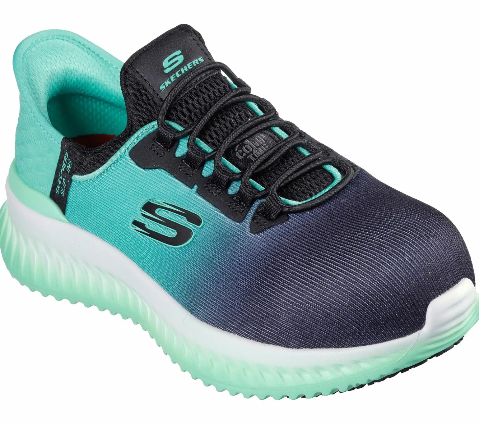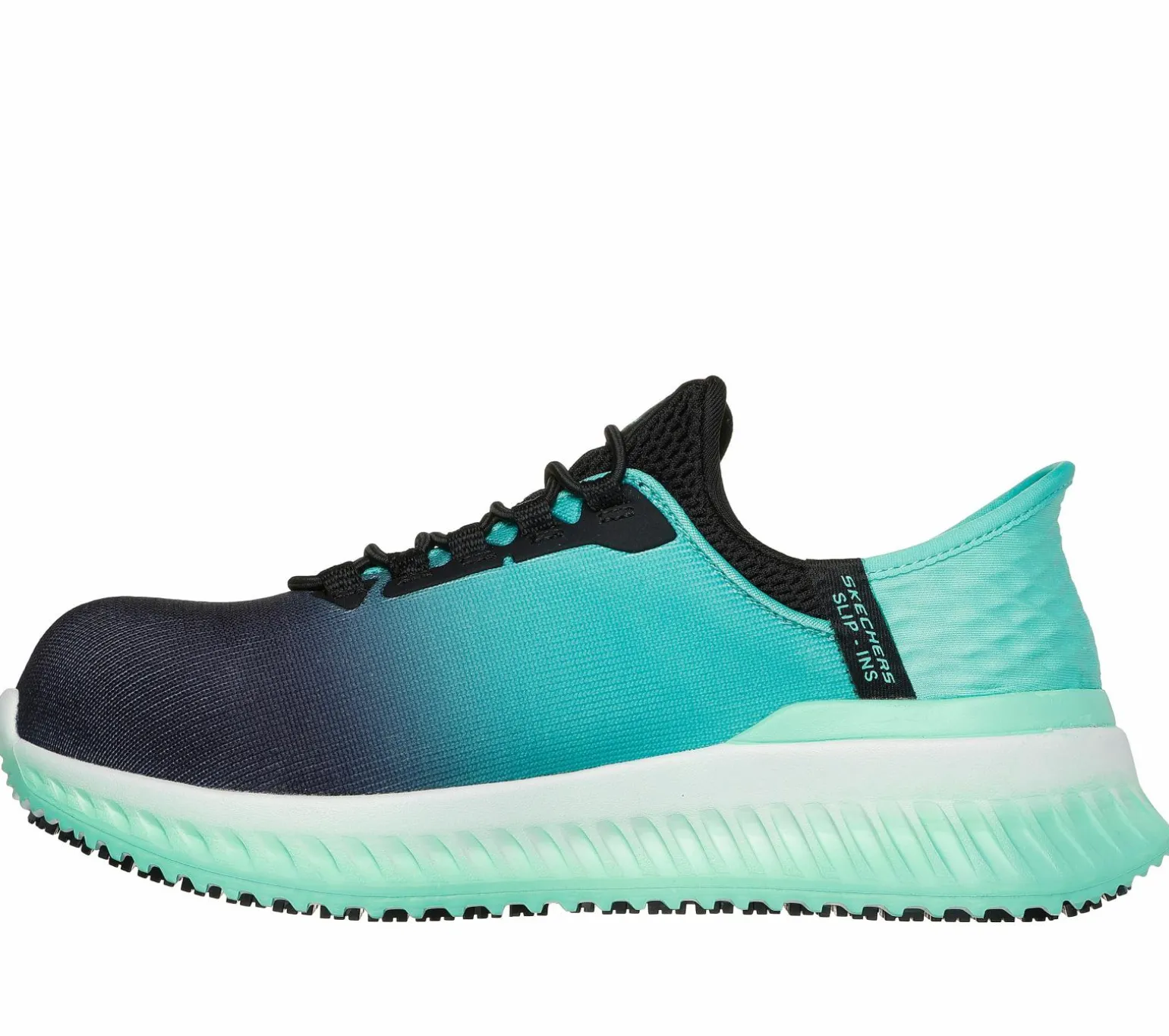 Bring your A-game to work with convenience, comfort, and safety wearing Skechers Hands Free Slip-ins® Work: Tilido – Ombray. This slip-on work design features a mesh and synthetic upper with a stretch-lace front, a unique Skechers Slip-ins® molded heel panel, our exclusive Heel Pillow, composite safety toe, and a cushioned Skechers Air-Cooled Memory Foam® insole.