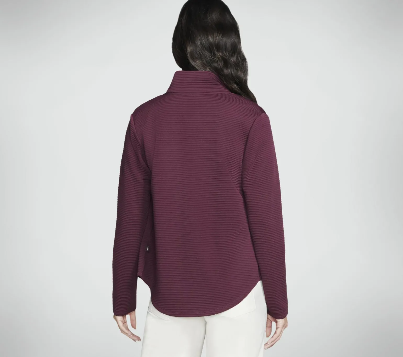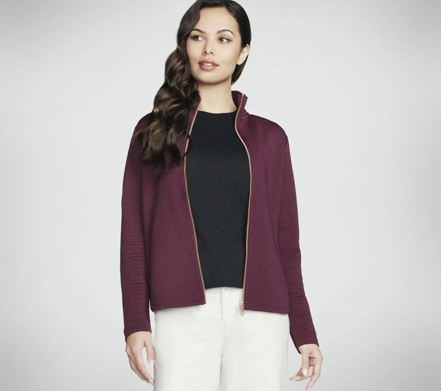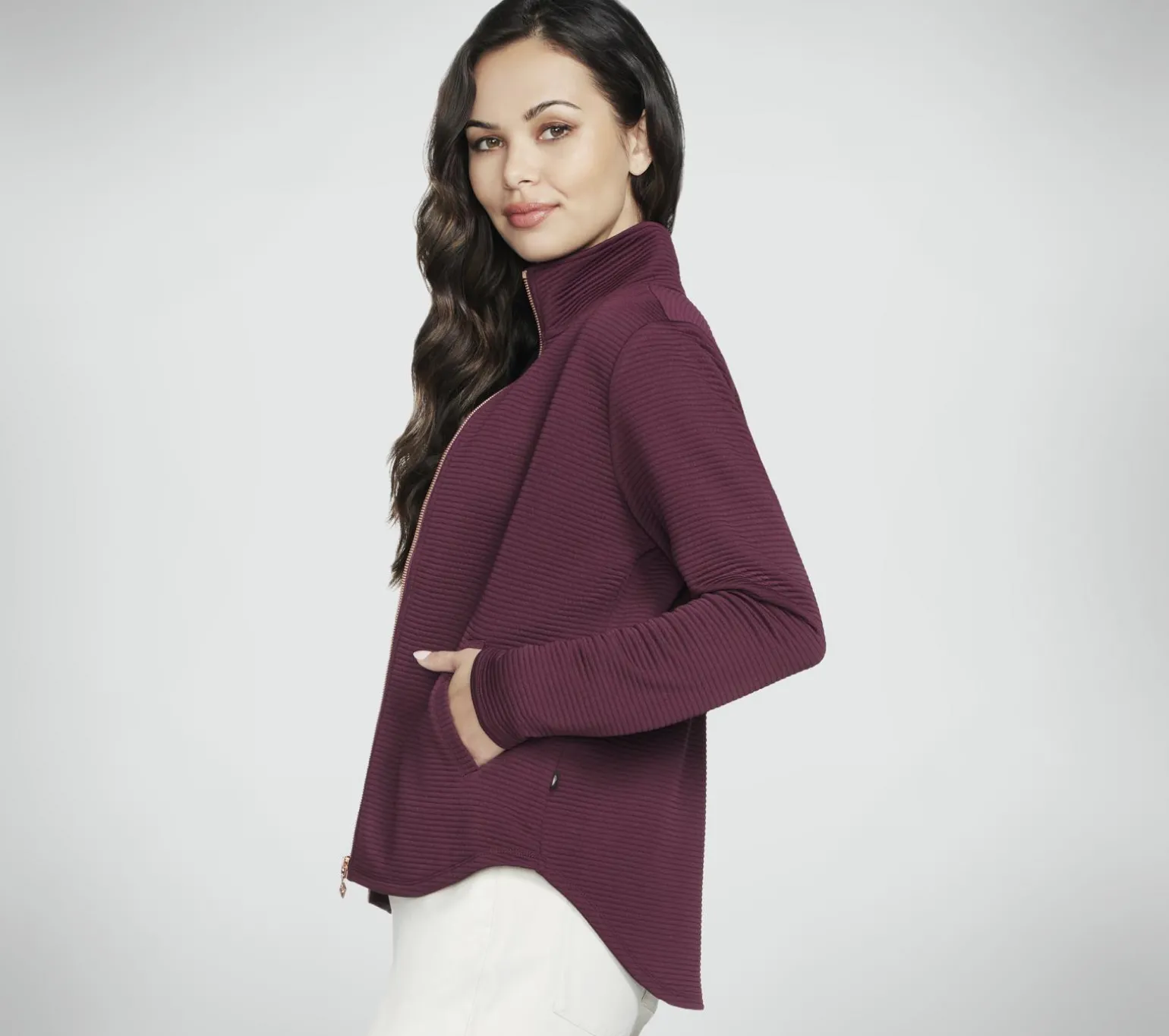 Stay active throughout the day in earth-friendly comfort wearing Skechers Hoodless Hoodies GO WALK Wear Shine Jacket. This ottoman jacket is made with recycled sheen-finished material and features a mock neck, rose gold zipper and pull, plus two hand pockets. Our Planet Matters®: Good for your body. Good for the world.