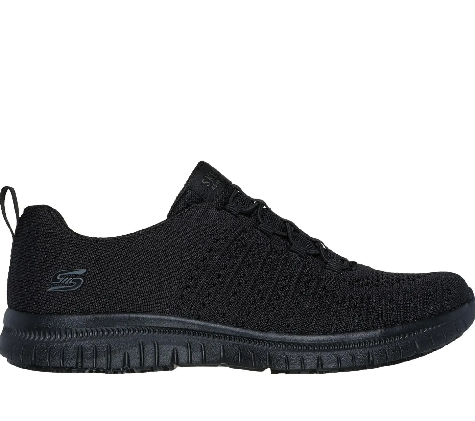 Enjoy slip-resistant safety with easy-on convenience wearing Skechers Work Slip-Resistant: Virtue. This athletic, low-profile work style features an engineered knit upper with fixed stretch laces, a Skechers Memory Foam cushioned comfort insole, and a slip-resistant outsole.