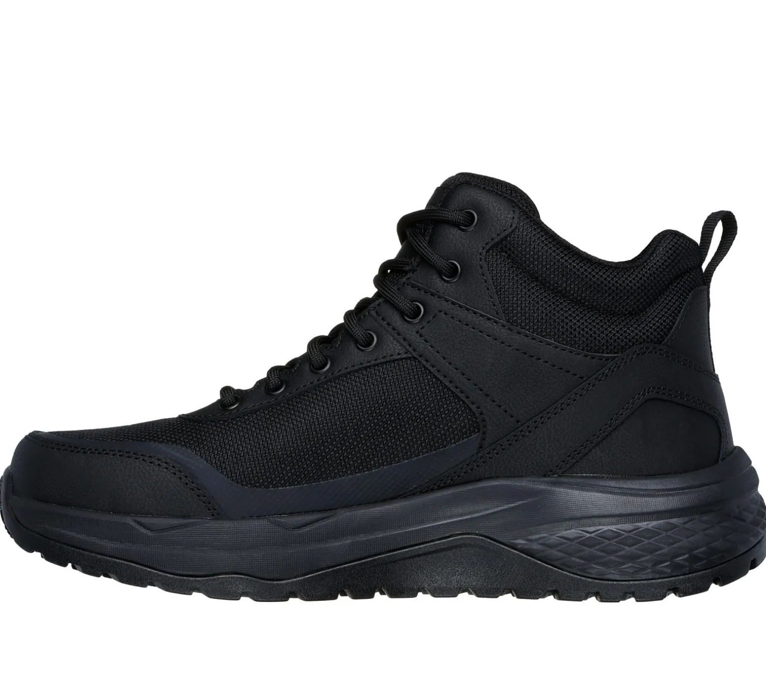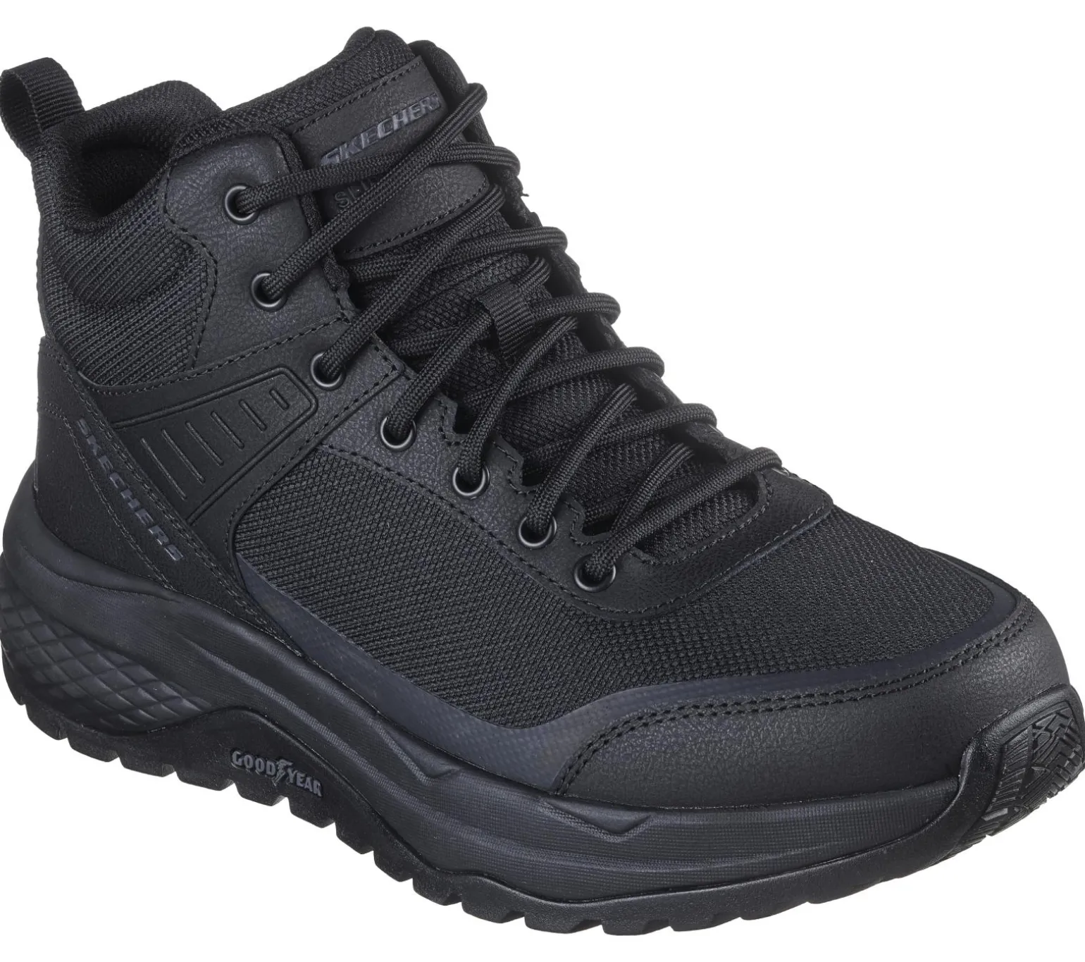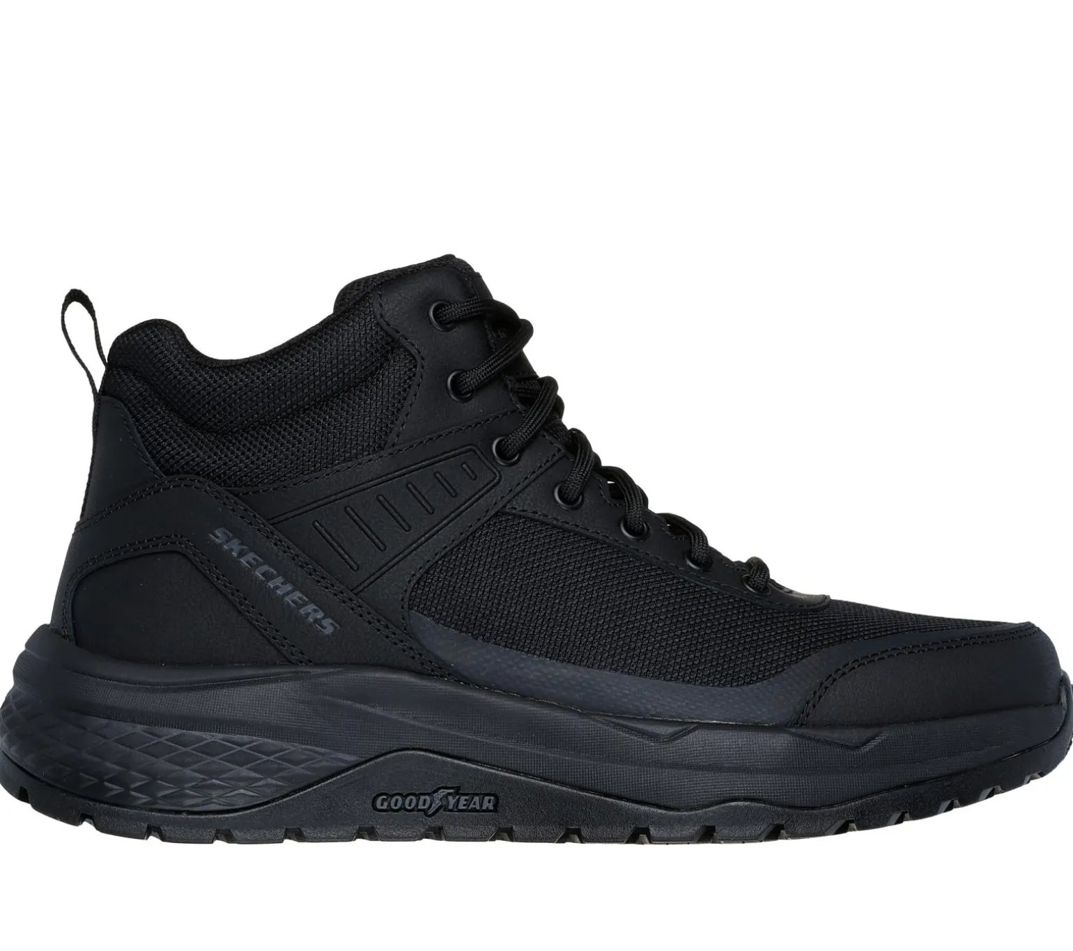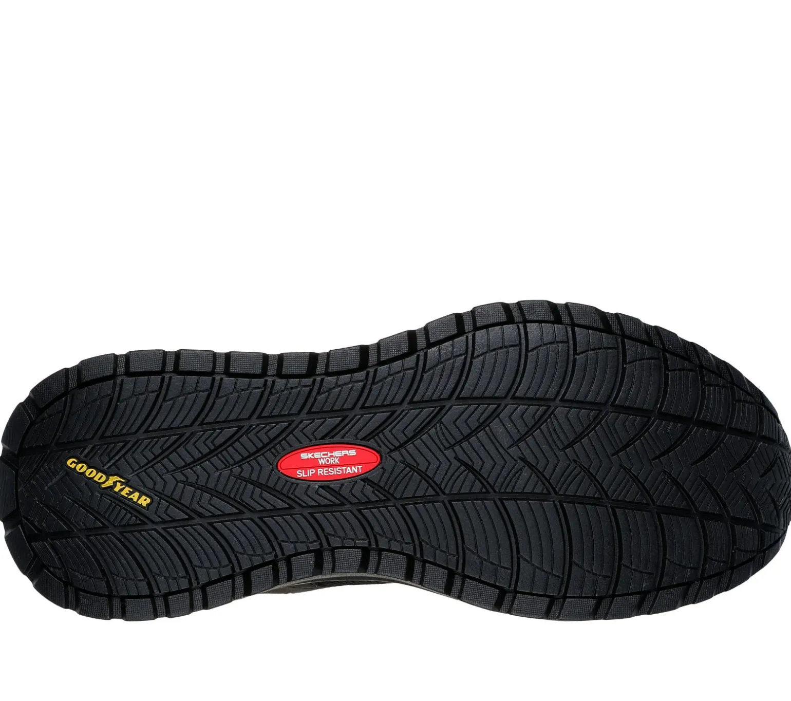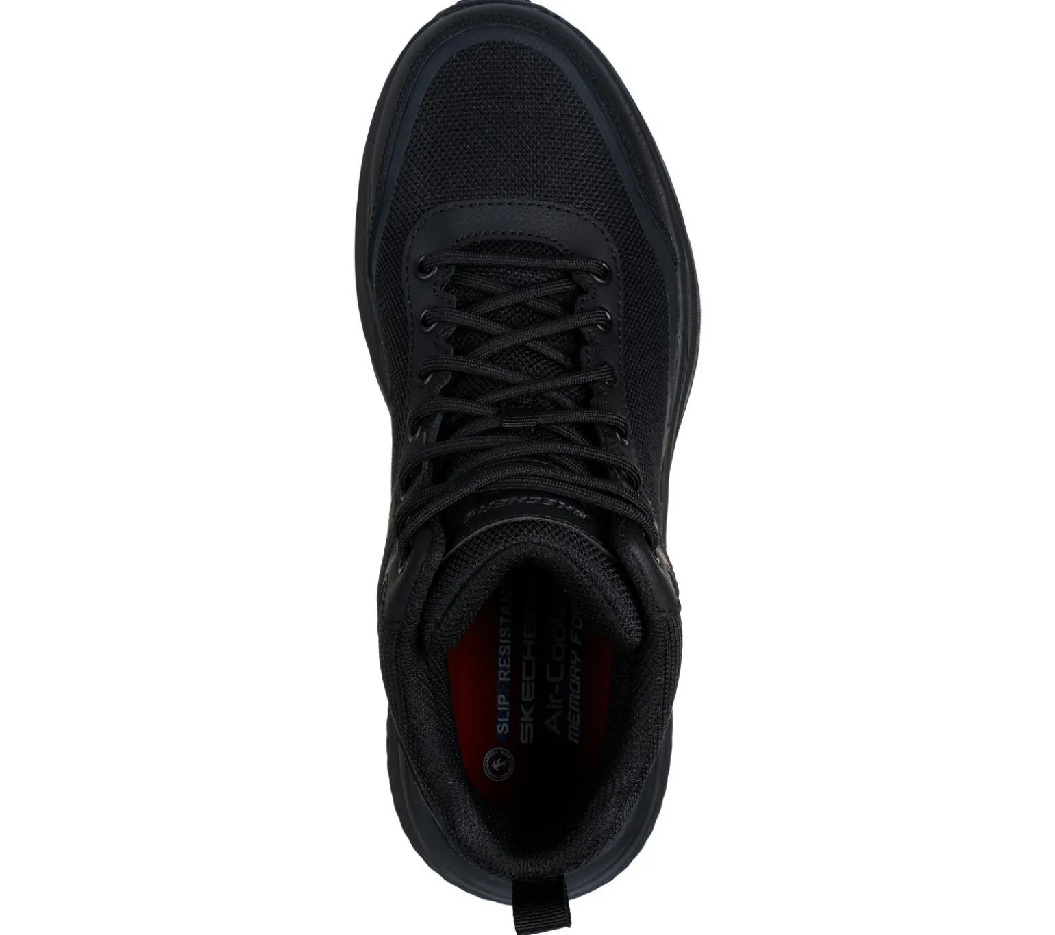 Gear up for your shift in exceptional traction and supportive comfort with Skechers Work: Street Treader – Scorron. This slip-resistant lace-up features a high-top leather, synthetic and mesh upper with a cushioned Skechers Air-Cooled Memory Foam® insole, and a highly durable Goodyear® Rubber Outsole.