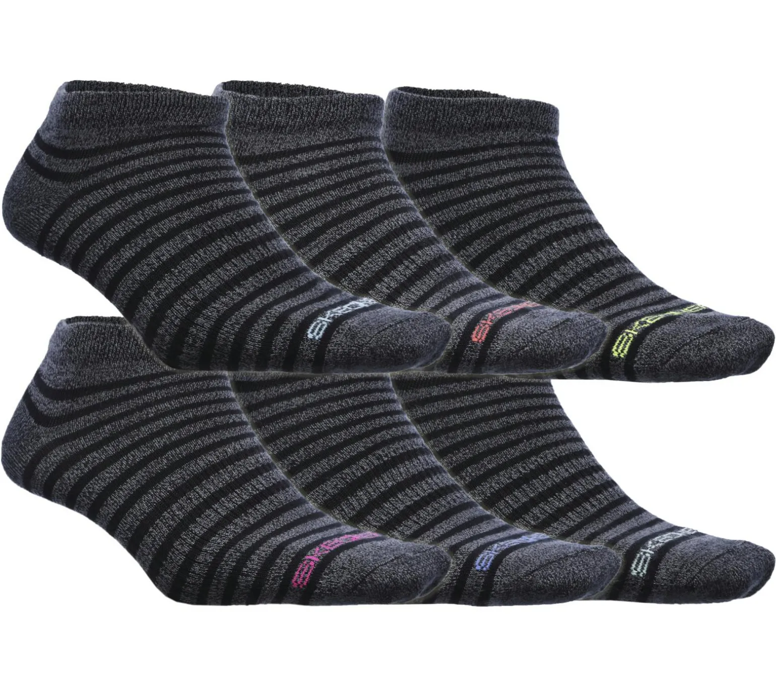 Smooth everything out in style with the Skechers Accessories 6 Pack of Women’s Low Cut Stripe Socks. Soft poly blend fabric in an ankle height sporty comfort sock with comfort stretch and stripe design.