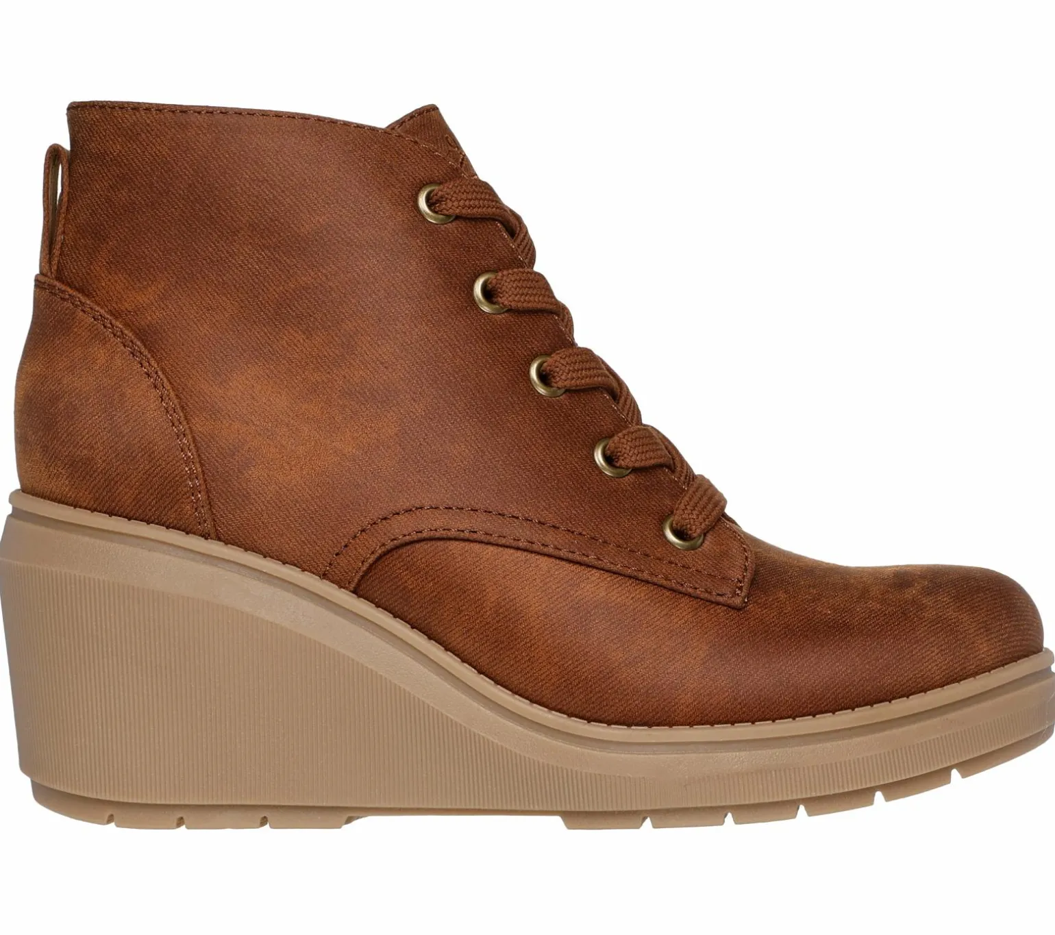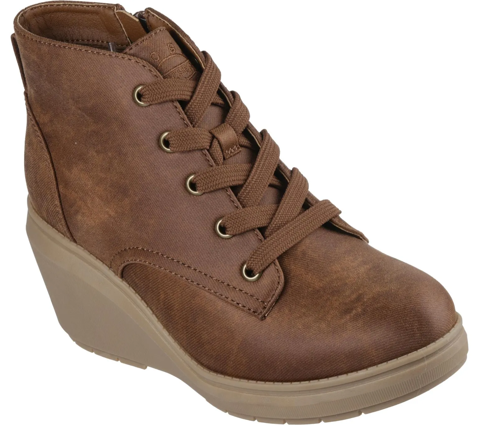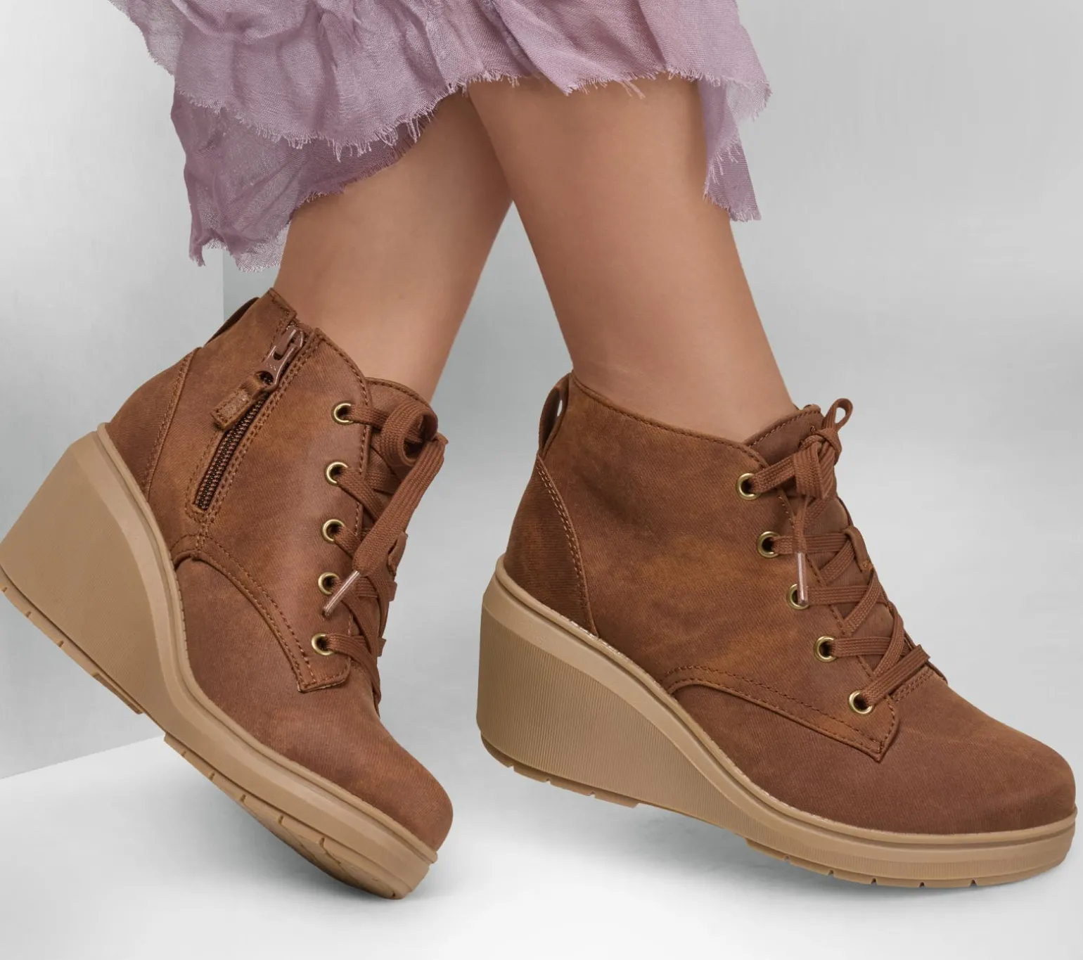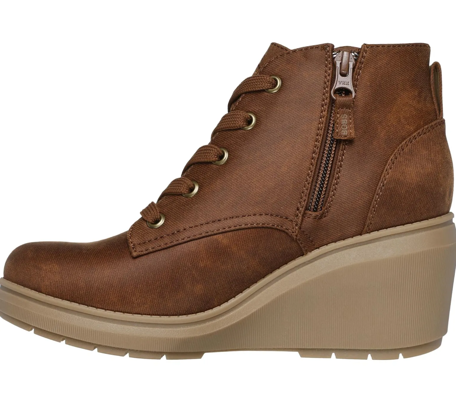 Step out in style wearing BOBS® from Skechers® BOBS Gala. This vegan ankle bootie features a vegan leather upper with a lace-up front, side-zip closure, cushioned Skechers Memory Foam insole, and a classic wedge midsole. For every BOBS® purchase, a donation is made to animals in need.