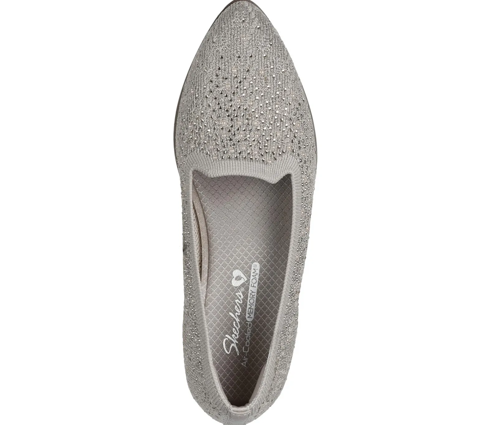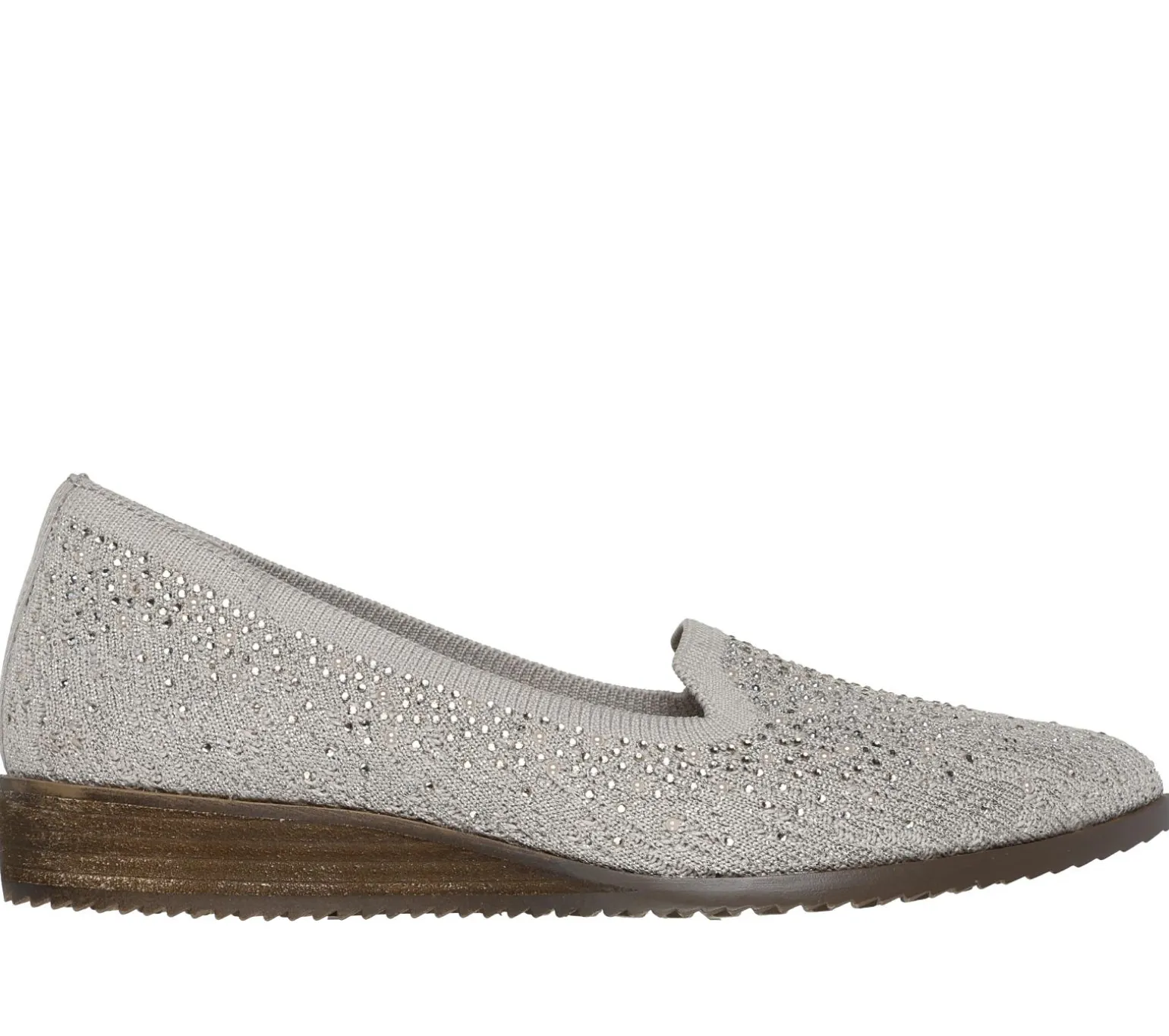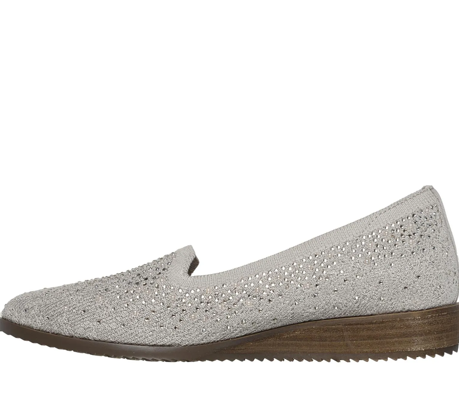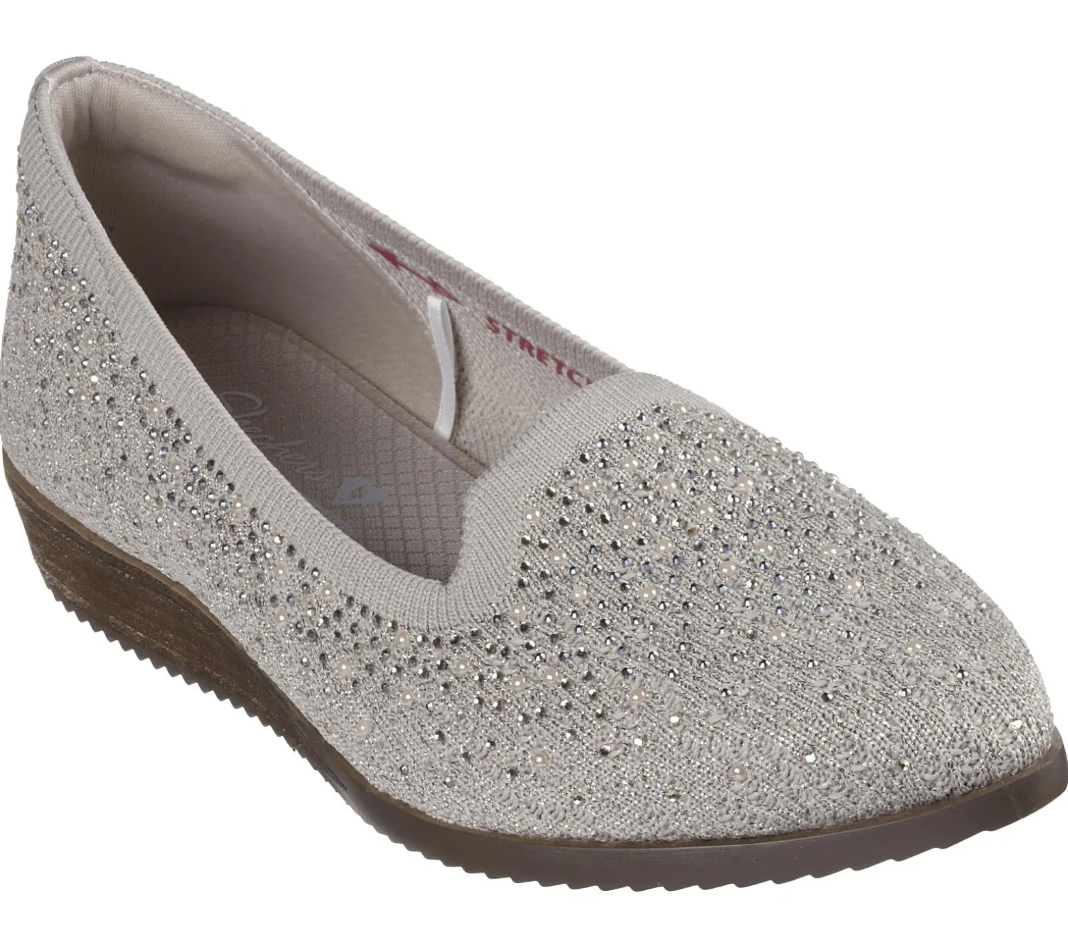Sparkling style mixes with stretchable comfort in Skechers Cleo® Sawdust – Twinkle. Designed with recycled materials, this fashion skimmer features a Stretch Fit® sparkle knit upper with rhinestone detail, a cushioned Skechers Air-Cooled Memory Foam® insole, and a low wedge heel. Our Planet Matters®: Good for your feet. Good for the world.®