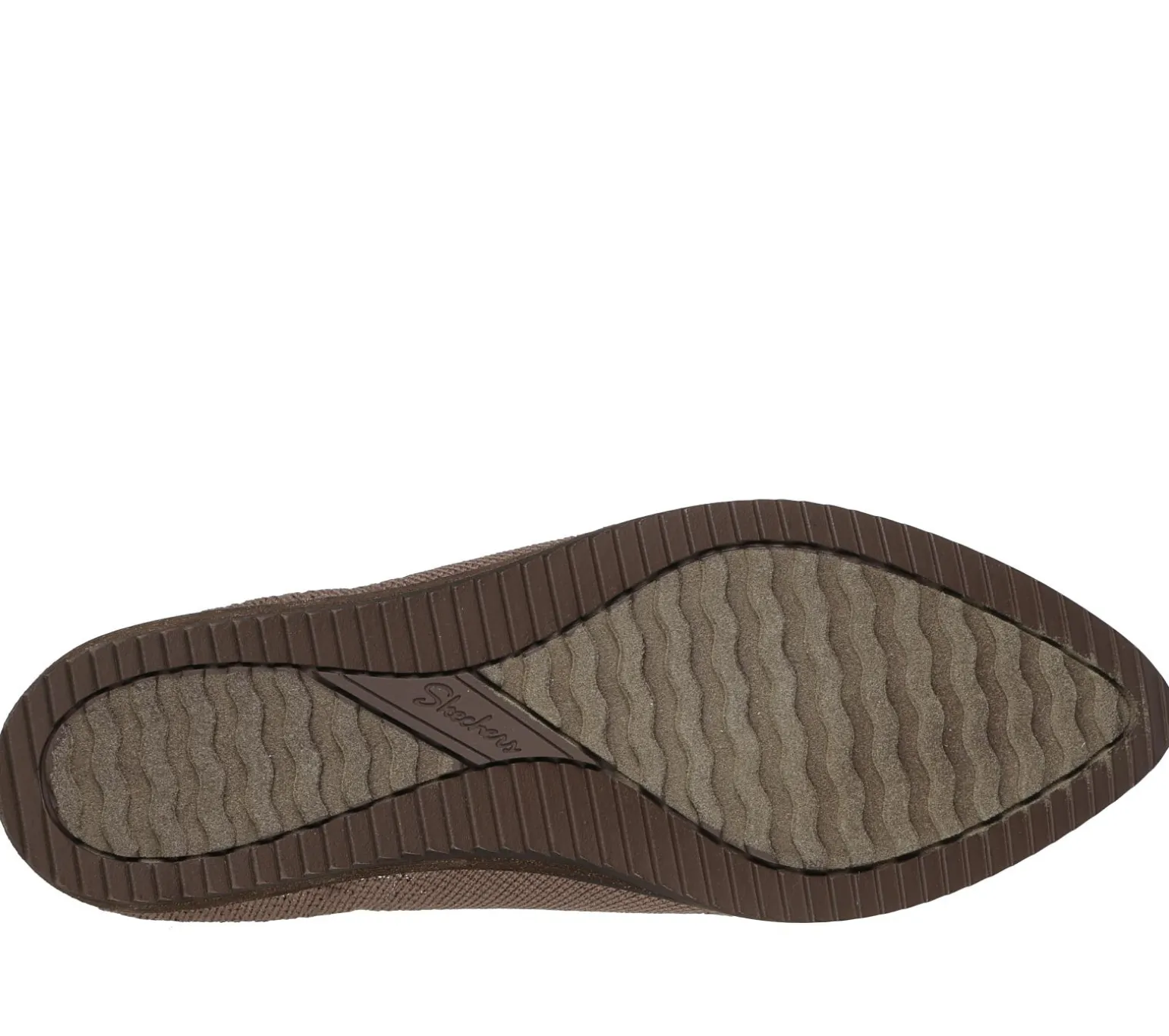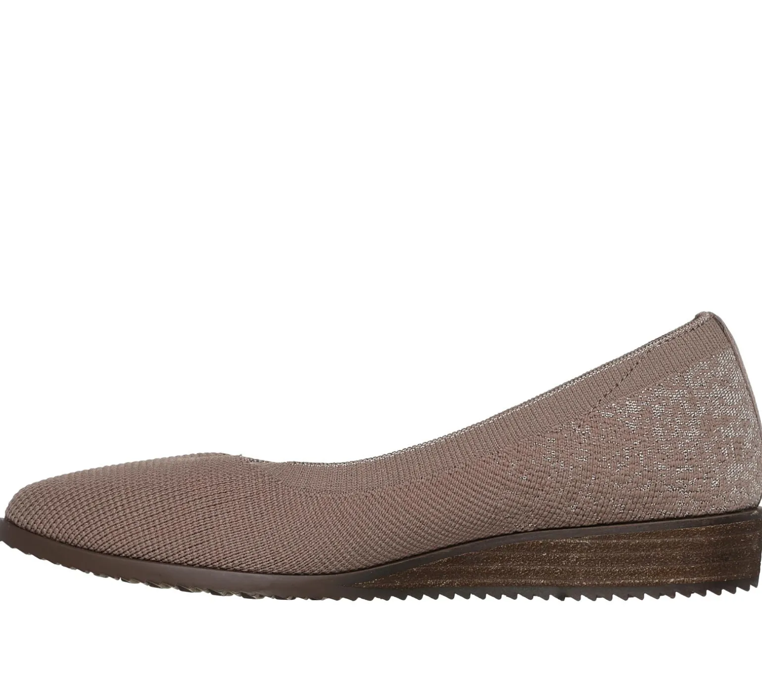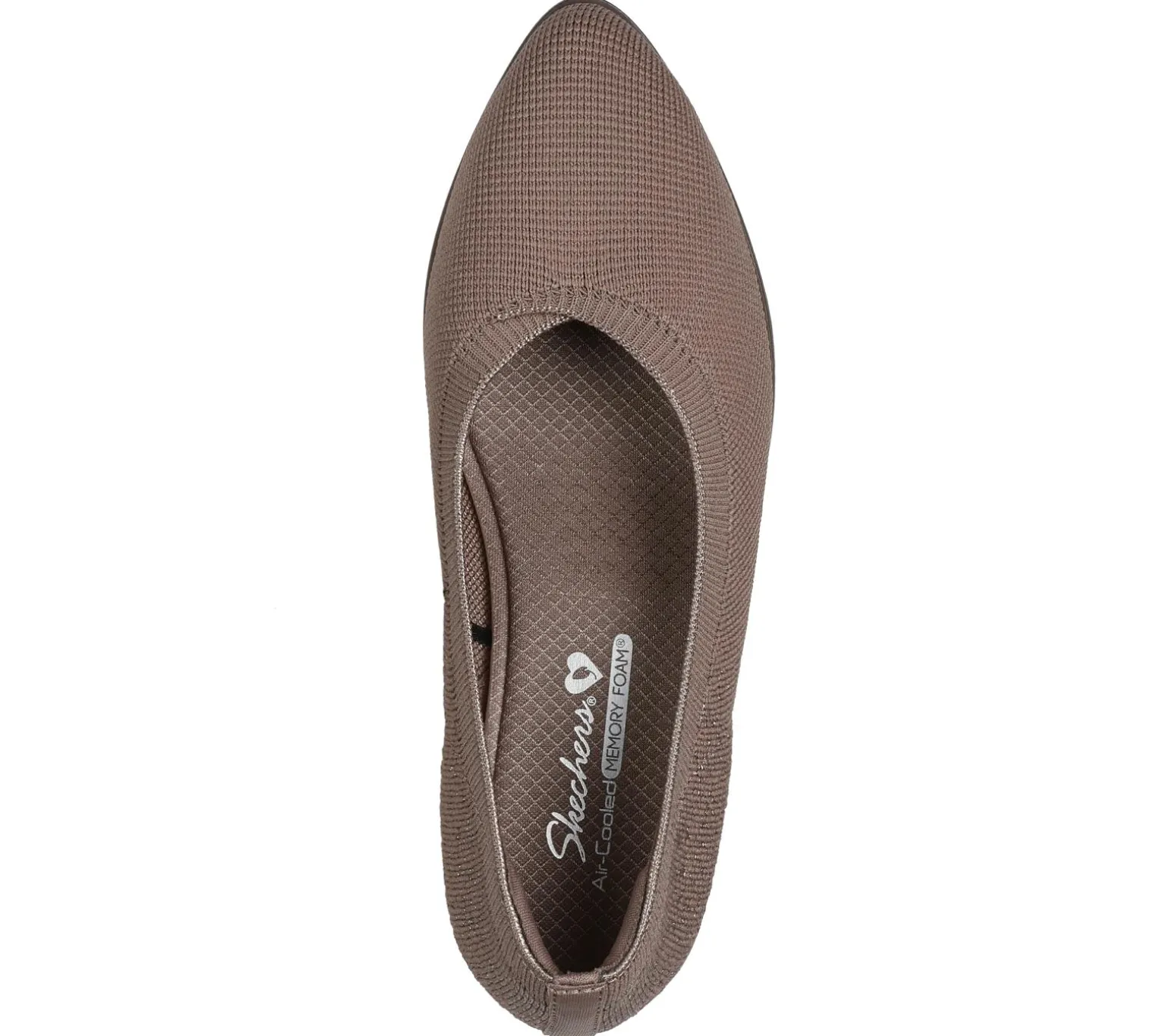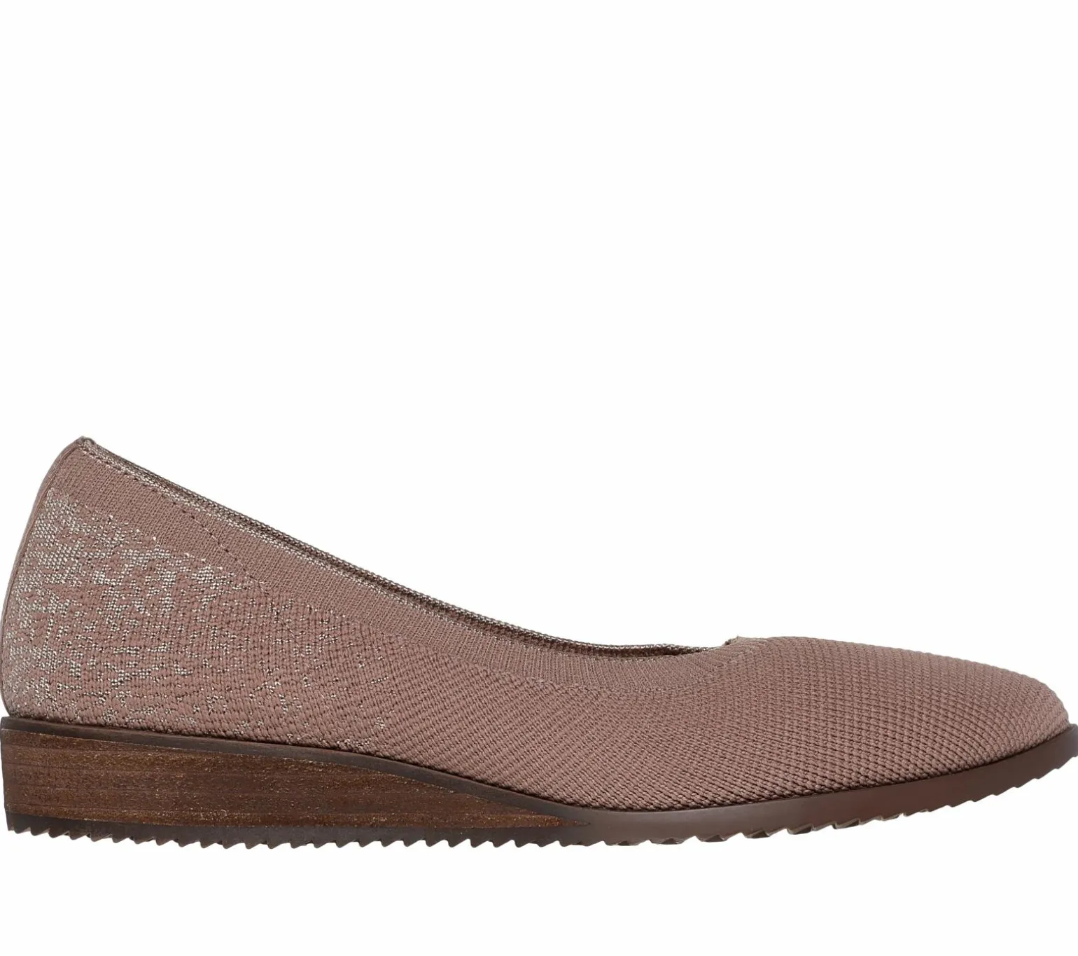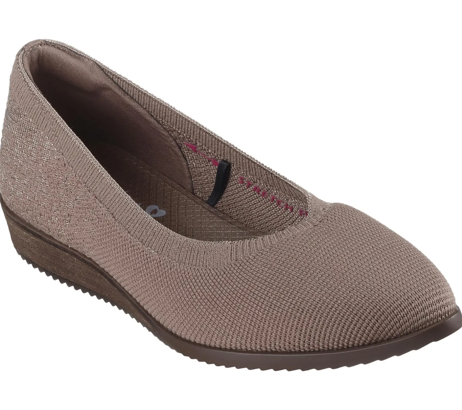 Versatile style mixes with stretchable comfort in Skechers Cleo® Sawdust – Wishful. Designed with recycled materials, this skimmer features a Stretch Fit® knitted upper with a cushioned Skechers Air-Cooled Memory Foam® insole and a low wedge heel. Our Planet Matters®: Good for your feet. Good for the world.®