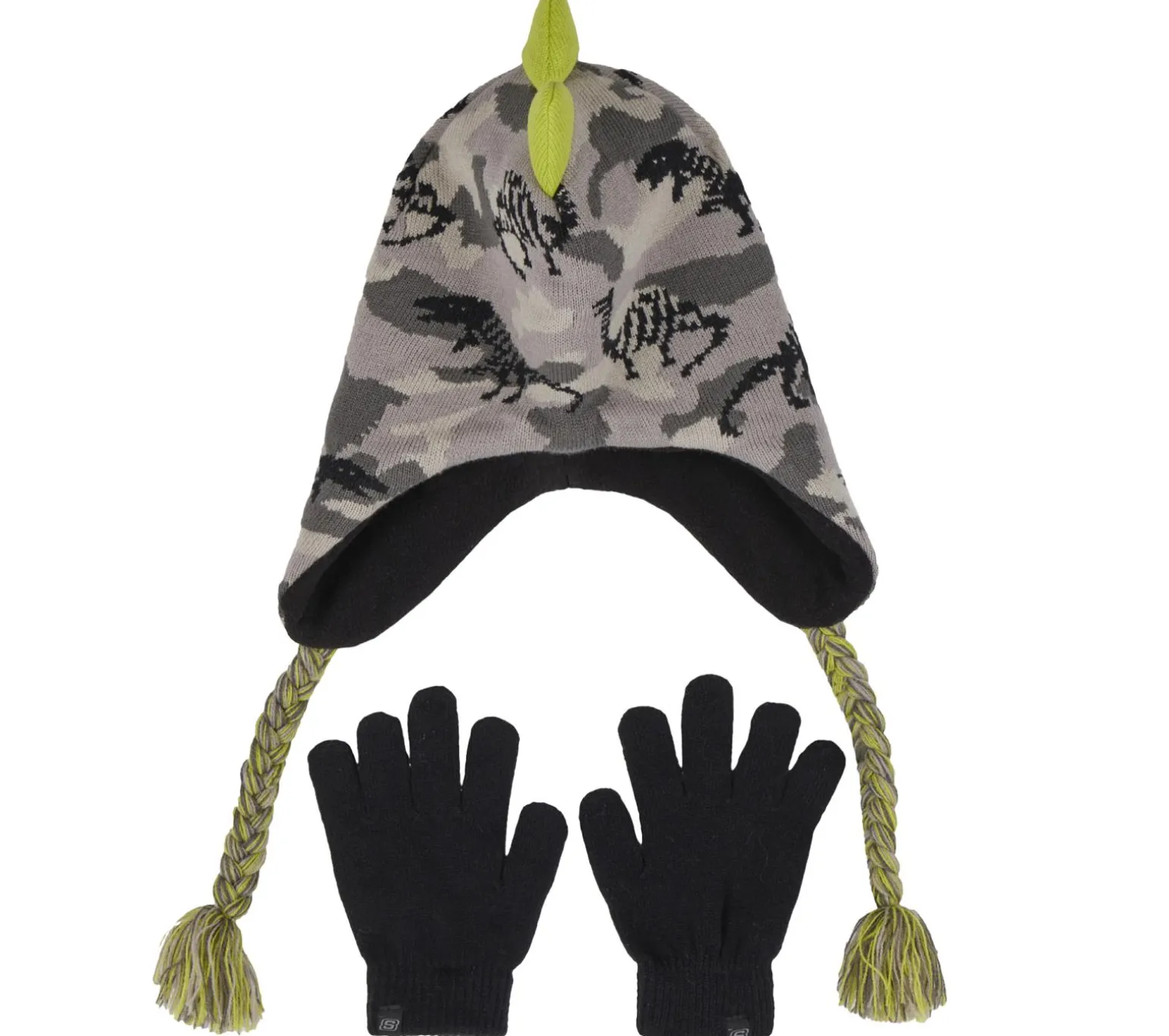 Cold weather can’t stop a good adventure with Skechers Dino Camo Jacquard Hat and Glove Set. This jacquard knit alpine style hat features plush poly lining, braided tassel pulls, dino-themed 3D detail, plus a pair of coordinating solid color gloves.