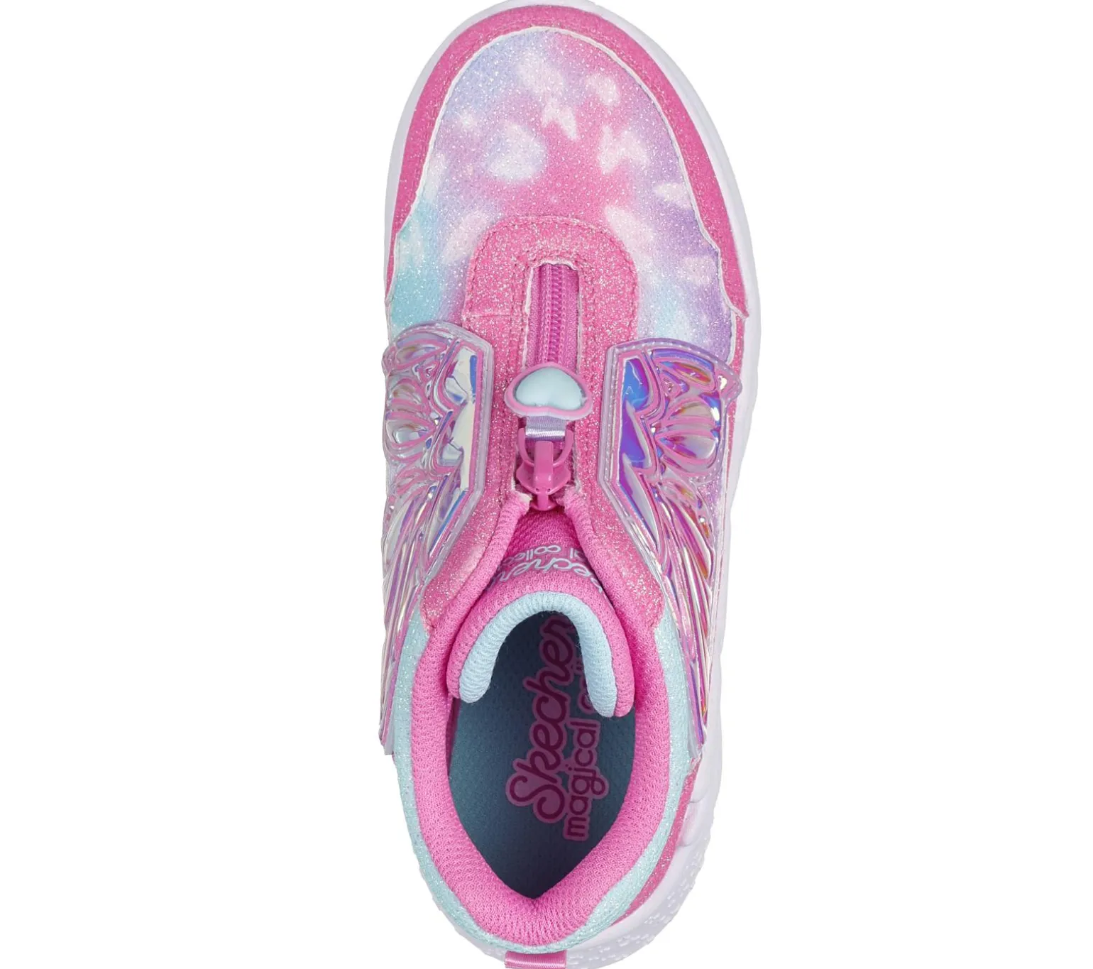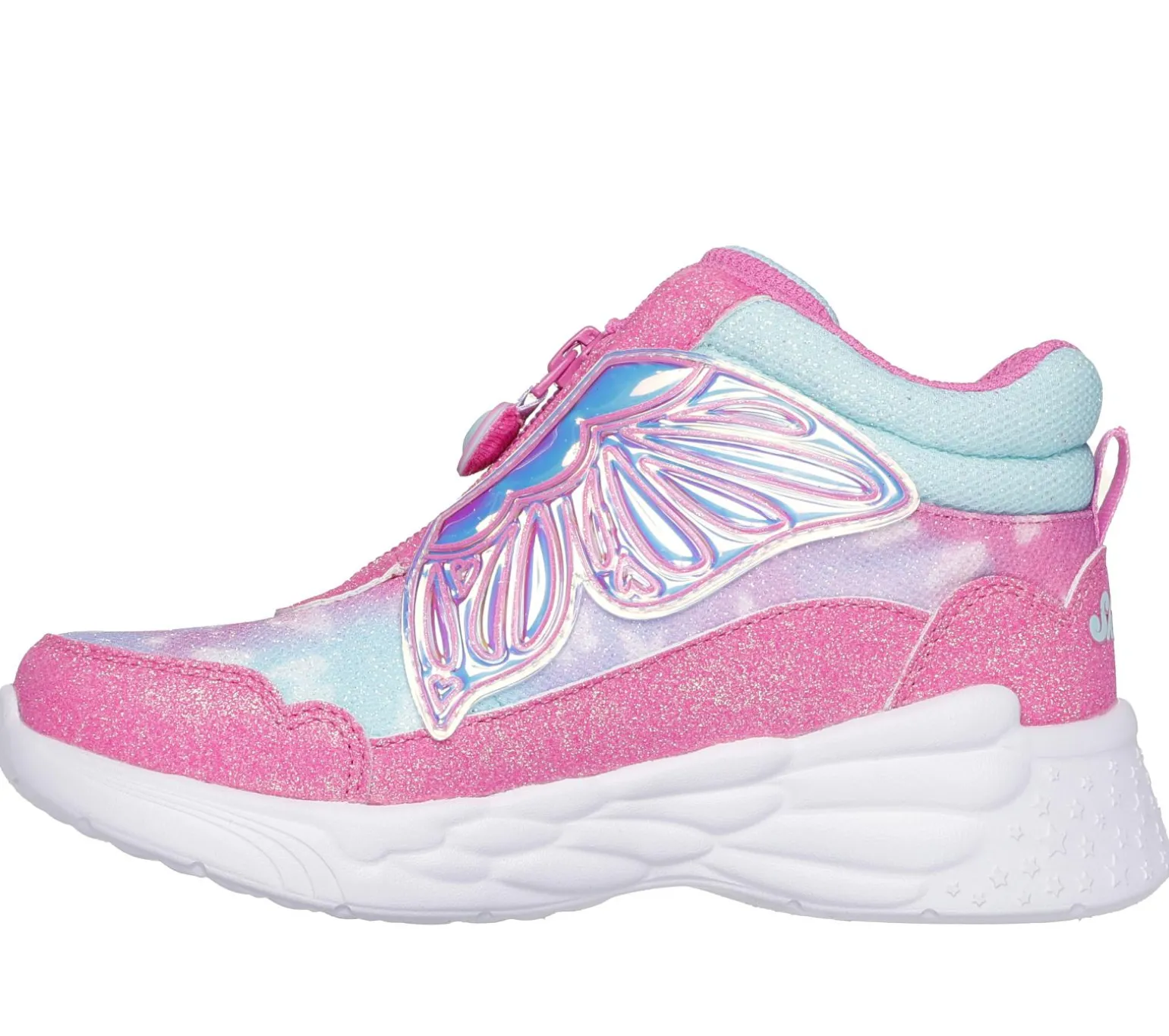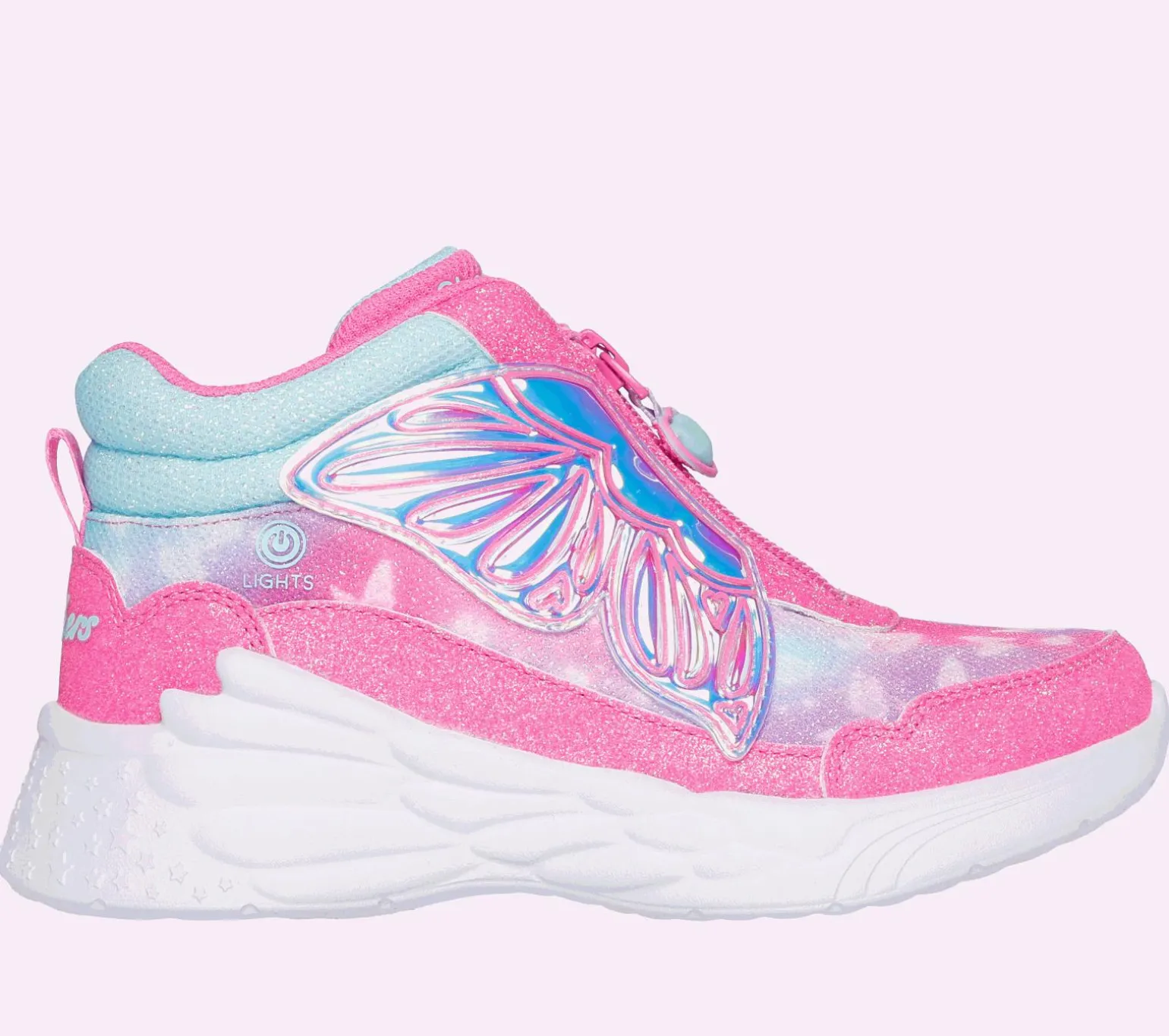 They will sparkle, shine, and look oh-so bright wearing Skechers Dream Racer – Butterfly Express. This lighted butterfly-themed sneaker boot from our Magical Collection® features a sparkle mesh upper with glittery overlays, a zippered front with Skechers Adaptive Closure, and a cushioned comfort insole. Bonus gift with purchase.
