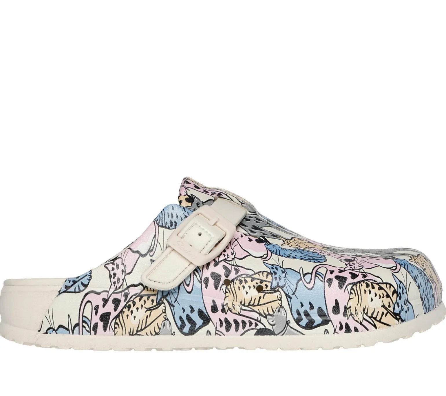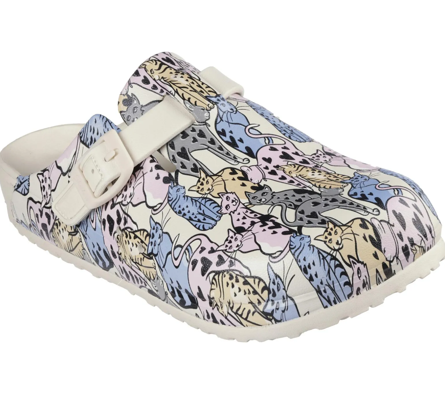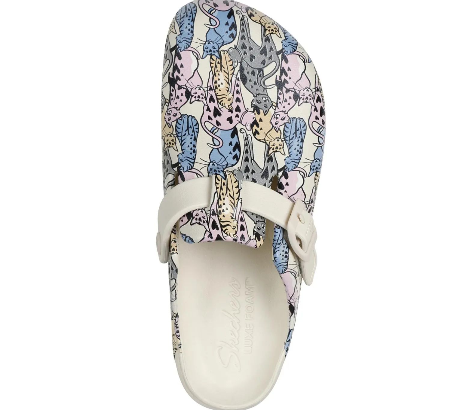 Feline-friendly style combines with long-lasting comfort in Skechers Foamies®: Cali Breeze 2.0 – Whiskers. This backless clog-style sandal features a sculpted Foamies® lightweight EVA upper with allover ‘Hearts On Hearts’ print, deco buckle, and a Luxe Foam® contoured cushioned footbed. For every BOBS® purchase, a donation is made to animals in need.