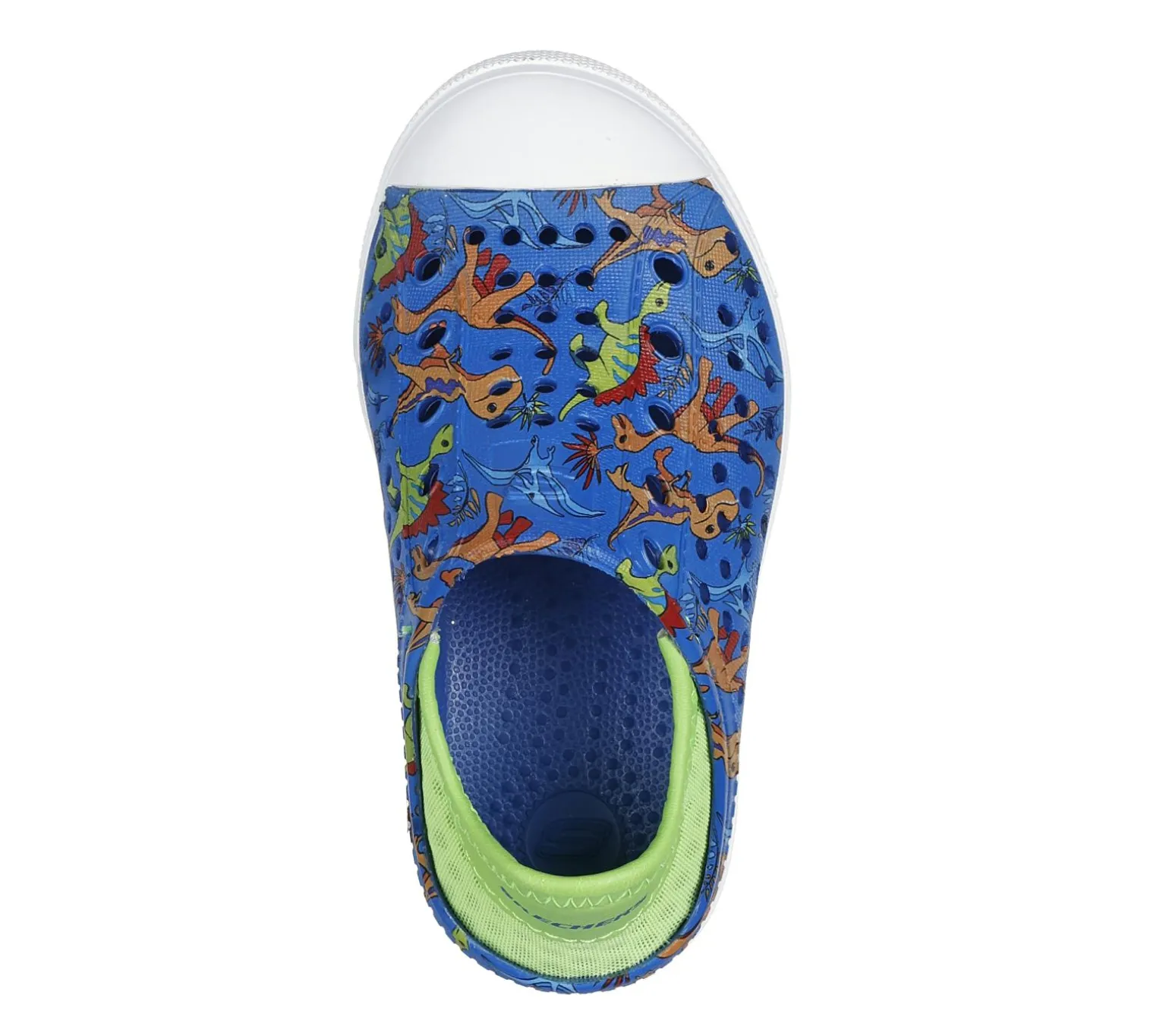 Skechers Squishables Colorful fun of Jurassic proportions comes in Skechers Foamies®: Guzman Steps – Lil Dino. Featuring a dinosaur printed perforated EVA sculpted design and a soft collapsible neoprene heel.
