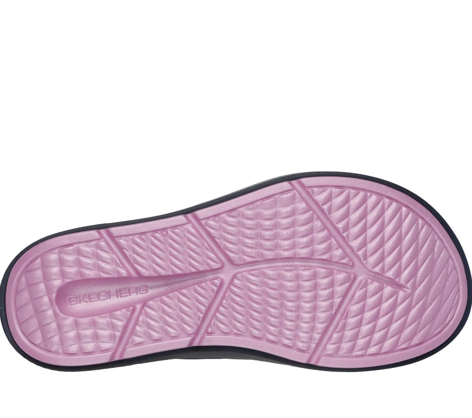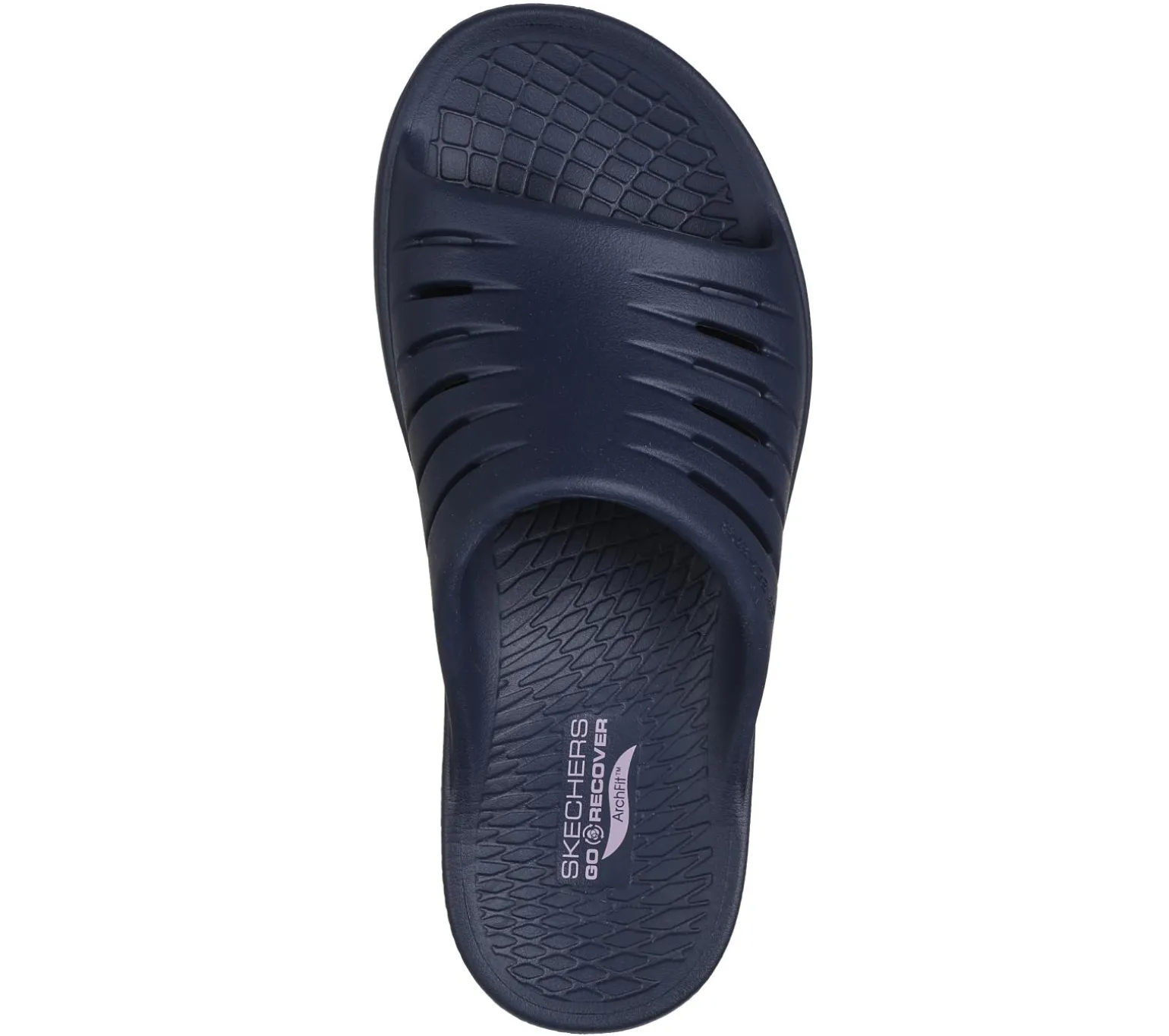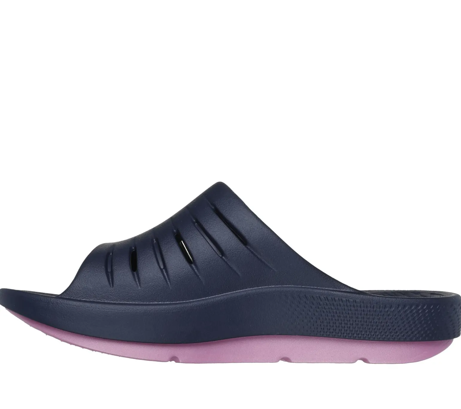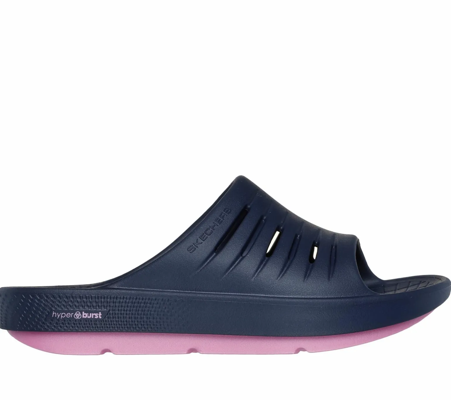 Relax in specialized comfort and style wearing Skechers GO RECOVER® Refresh. his athletic recovery slide sandal has been granted the APMA Seal of Acceptance and features a synthetic upper with linear perforations and premium HYPER BURST® foam with Arch Fit® support that redistributes pressure for impact reduction.