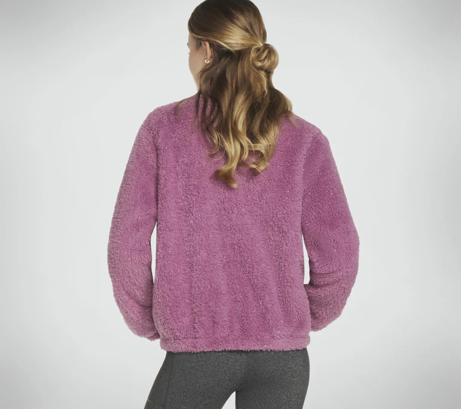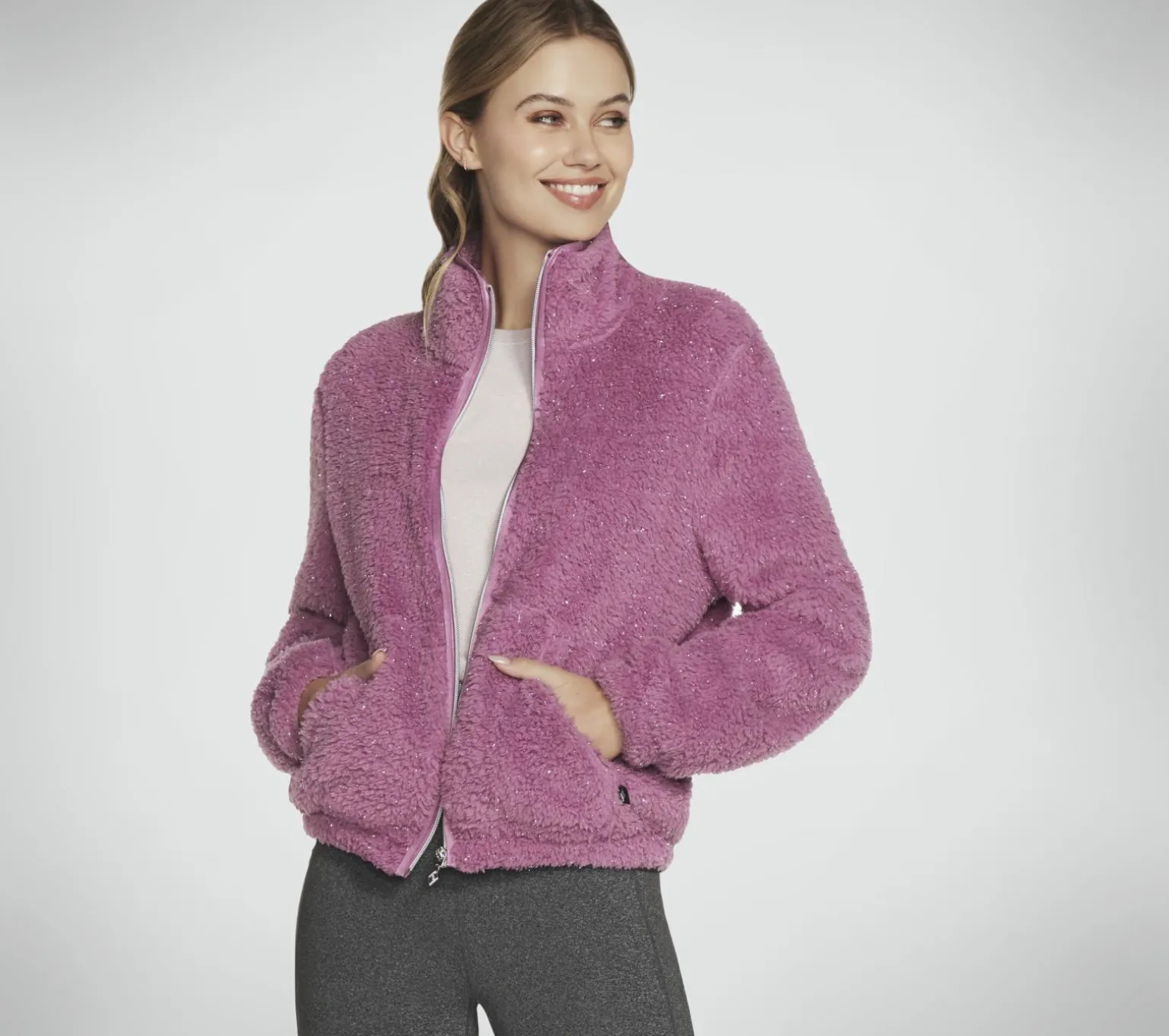 Relax in easy-going comfort and style with Skechers GO SNUGGLE® Shine Sherpa Jacket. This full-zip jacket features a soft faux-shearling fleece fabric with subtle lurex shimmer, on-seam pockets, and a mock neck.