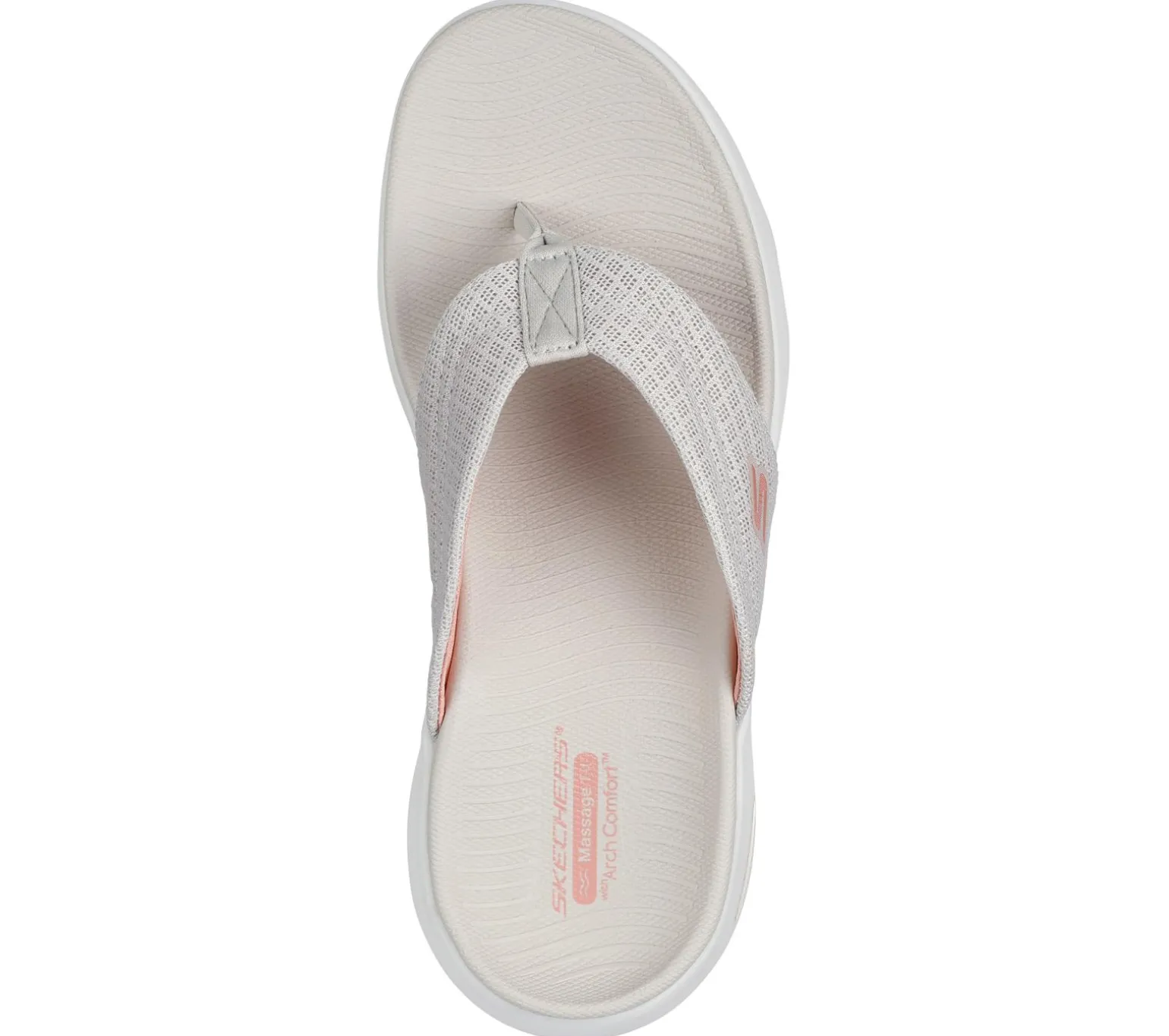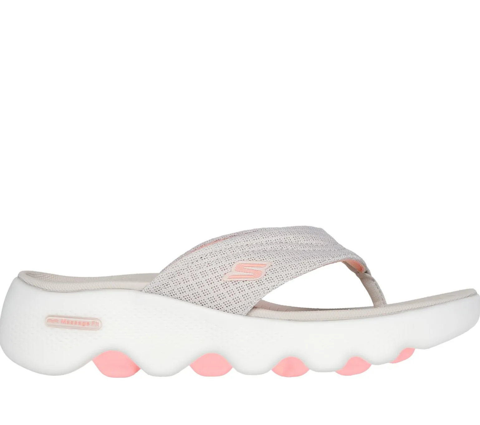 Enjoy casual style and supreme massaging comfort with Skechers GO WALK® Massage Fit® Sandal – Dawn. This innovative thong sandal features a mesh upper, an ultra-lightweight, responsive HYPER BURST® cushioned midsole, and a contoured Goga Mat® footbed with Arch Comfort® for added support.