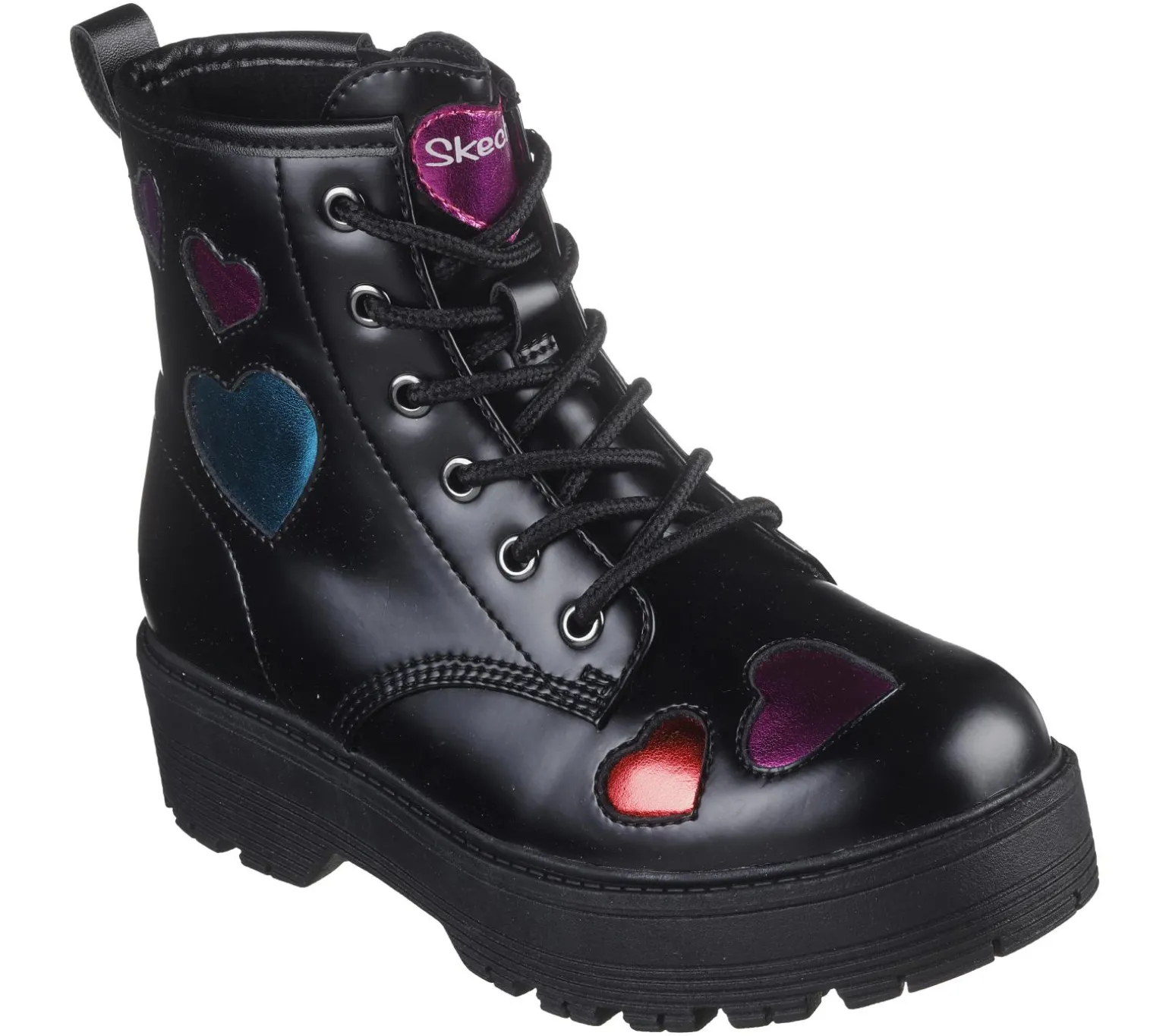 Have them looking oh-so-cool wearing Skechers Gravlen Hi – Metallic Heart. This mid-calf lace-up boot is embellished with metallic cut-out hearts and features a smooth faux-leather upper, side-zip closure, and a rugged, platform midsole.