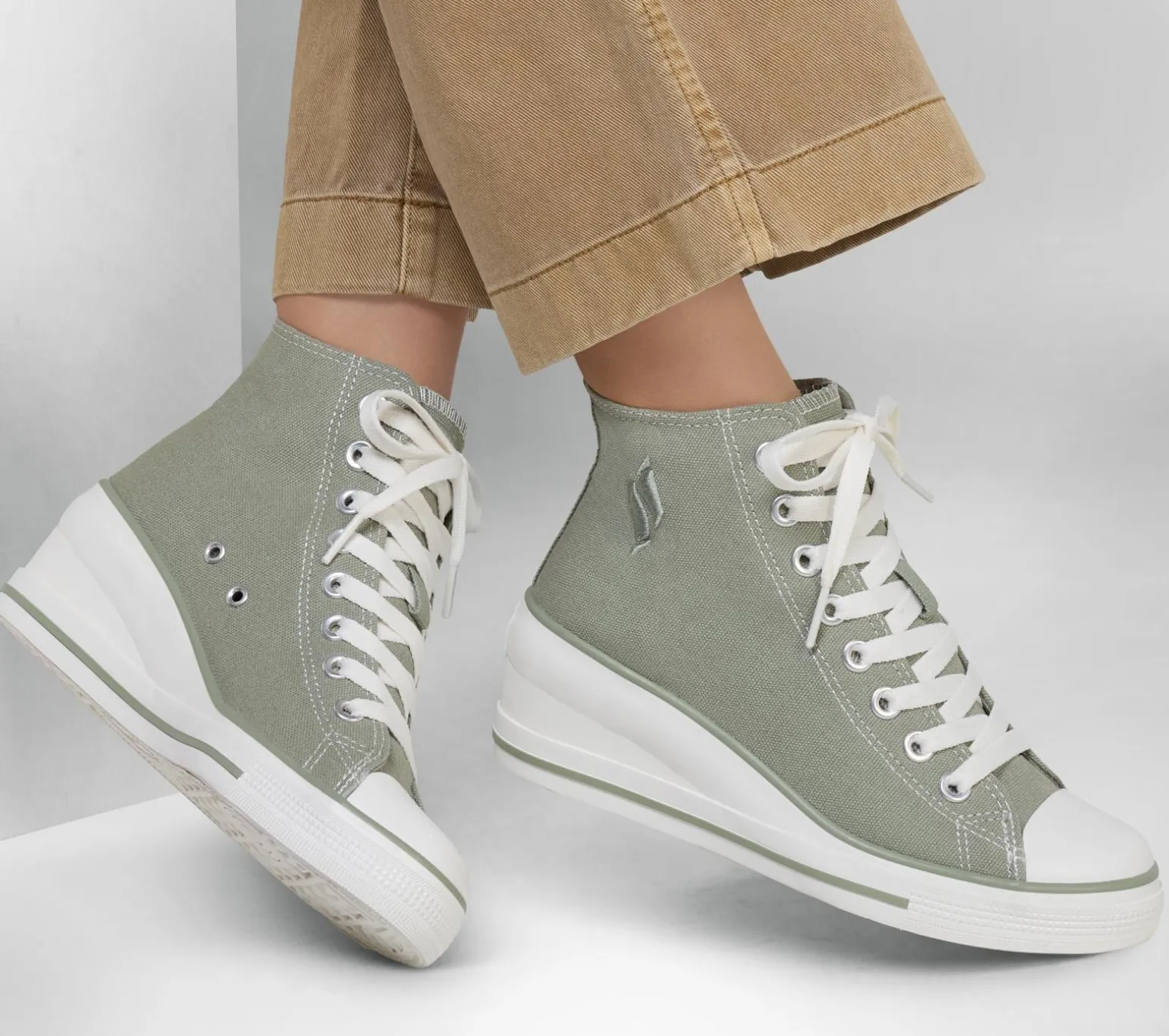 Lace into a lifted classic wearing Skechers Street Happi – Elevated Steps. This vegan high-top fashion sneaker features a laced canvas upper with a synthetic toe cap, wedge midsole, and a Skechers Air-Cooled Memory Foam® insole.