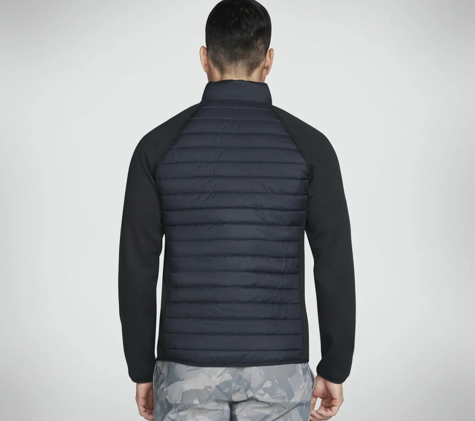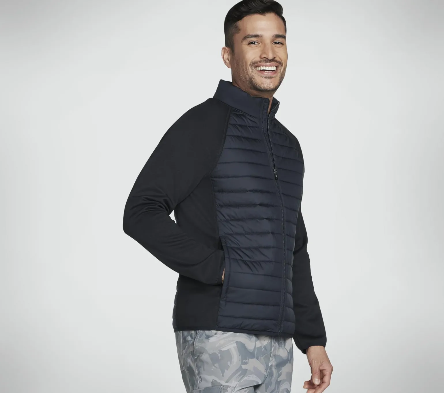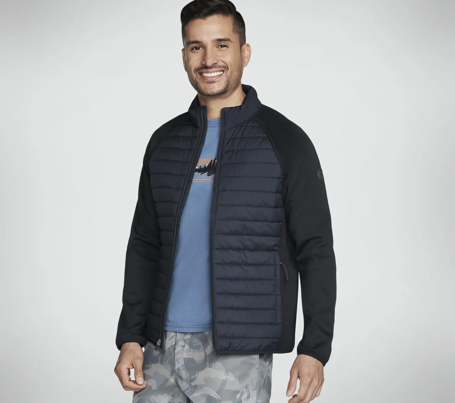 Add a layer of cloud-like softness to an outerwear favorite with Skechers Hoodless Hoodies Hybrid Jacket 2.0. This full-zip puffer jacket features an insulated GO SHIELD body with raglan Skech Cloud thermal sleeves and zipped hand pockets.