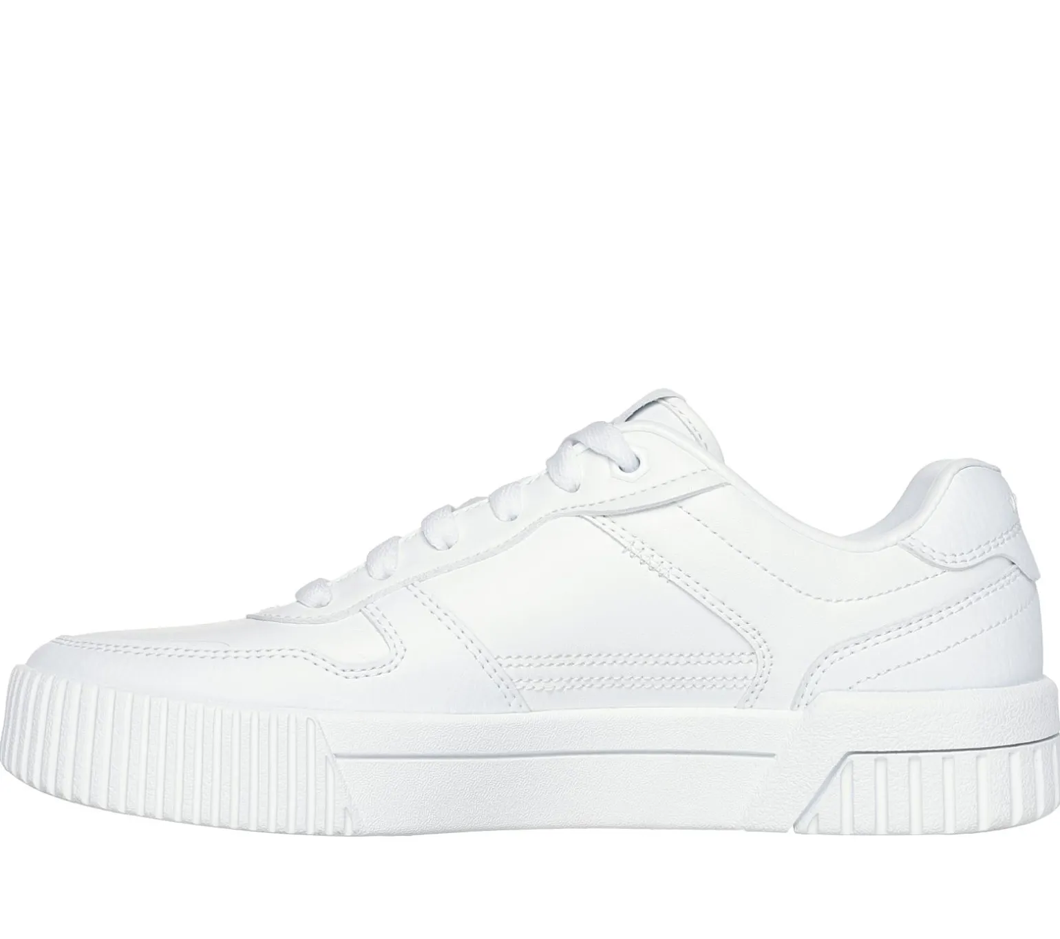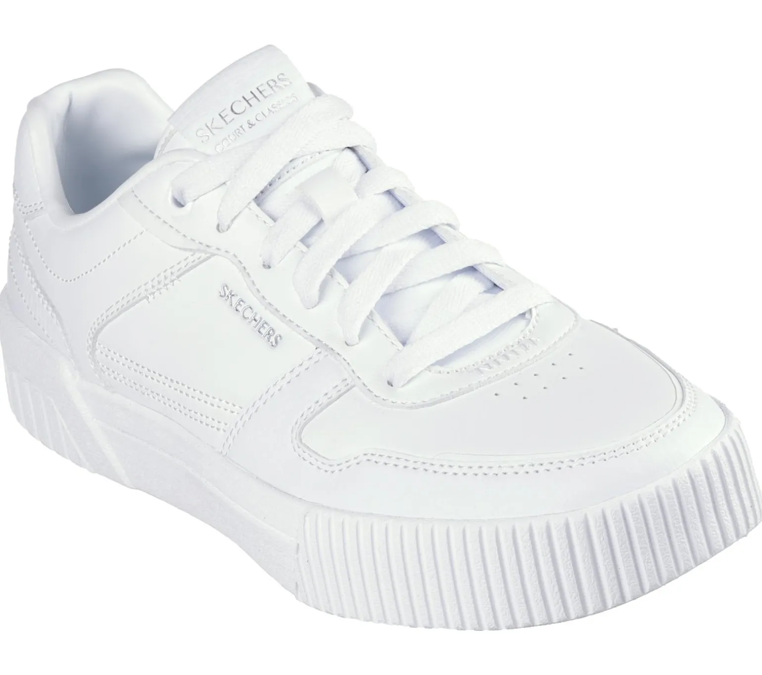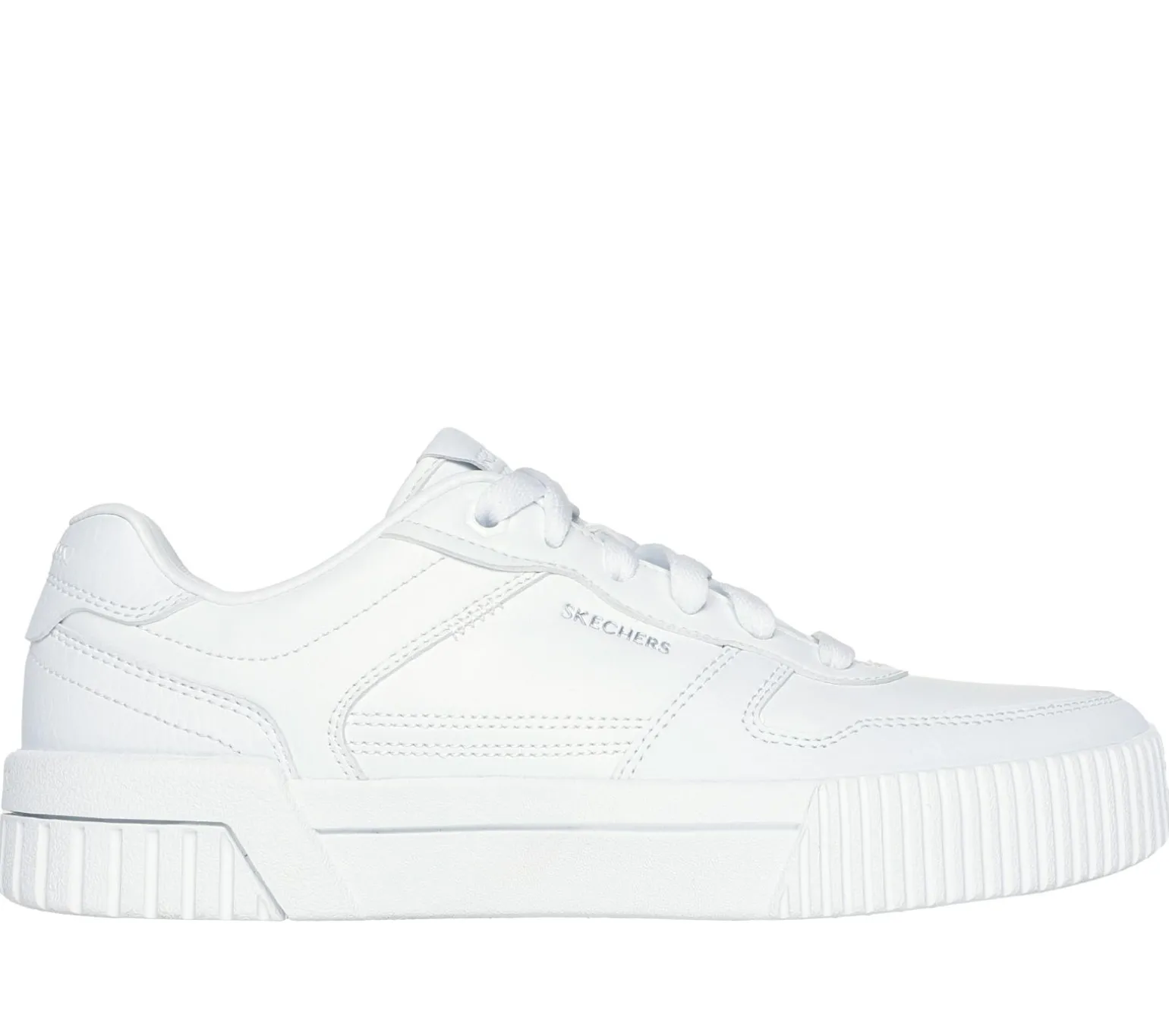 Enjoy classic court-style looks with Skechers Jade – Too Easy. This low-top lace-up features a duraleather upper with textured overlays, metallic stitching accents, and a cushioned Skechers Air-Cooled Memory Foam® comfort insole.