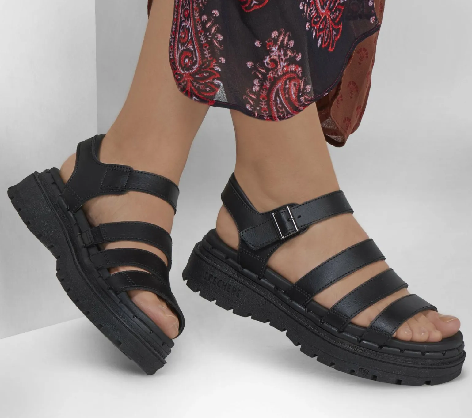 UIt’s the S®Get that perfect heritage look with Skechers Jammers – Poppin’. This casual open toe platform sandal features a leather upper with a Luxe Foam® comfort footbed.