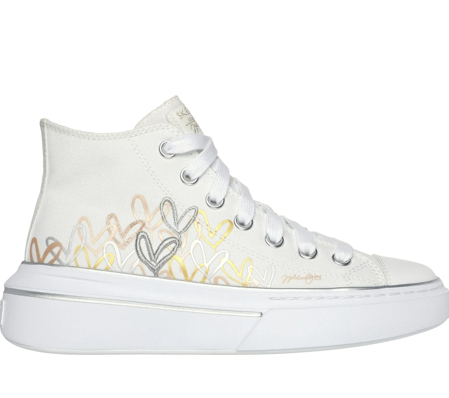 Internationally renowned muralist James Goldcrown brings his iconic #Lovewall heart designs to Skechers in this inspiring collaboration. Style yourself in love and walkable comfort with Skechers x JGoldcrown: Cordova Classic – Chic Love. This fashion lace-up features a metallic print of the artist’s signature heart design on a canvas upper with a Skechers Air-Cooled Memory Foam® insole.