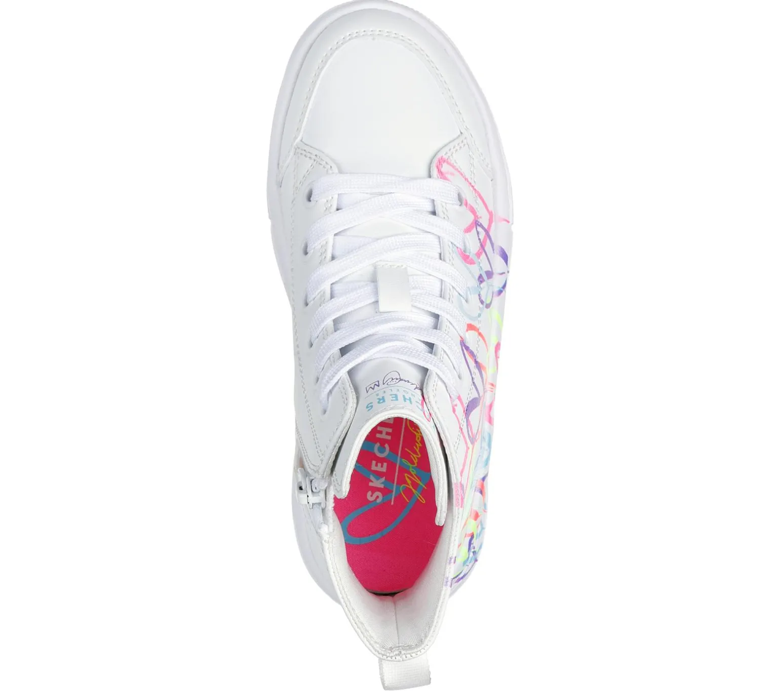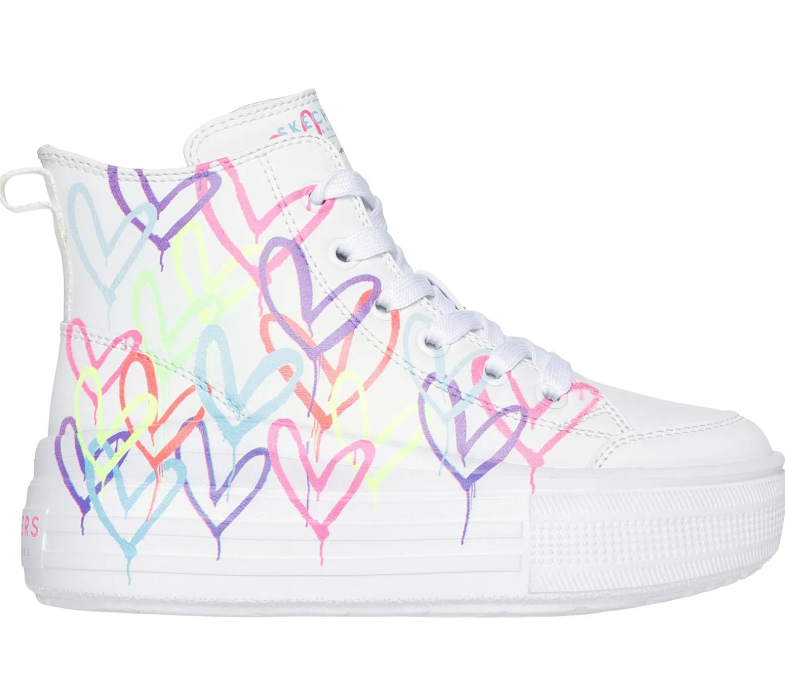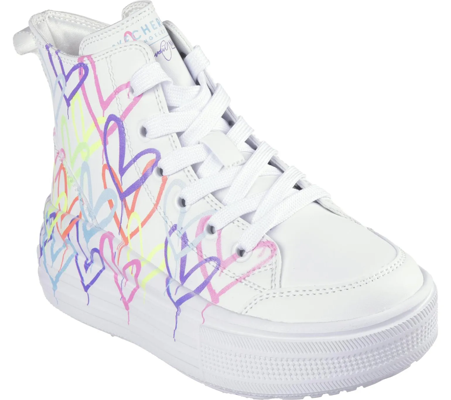 Internationally renowned muralist James Goldcrown brings his iconic #Lovewall heart designs to Skechers in this inspiring collaboration. Flaunt your love for love in Skechers Street™ x JGoldcrown: Hyperlift. This high-top fashion sneaker features the artist’s signature heart design on a canvas upper, lace-up front, Skechers Adaptive Closure, cushioned comfort insole, and a platform bottom.