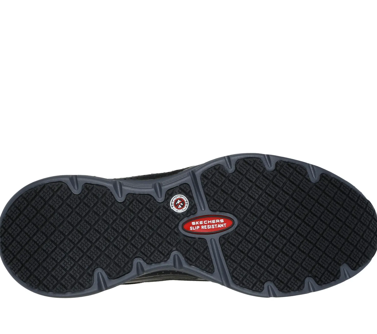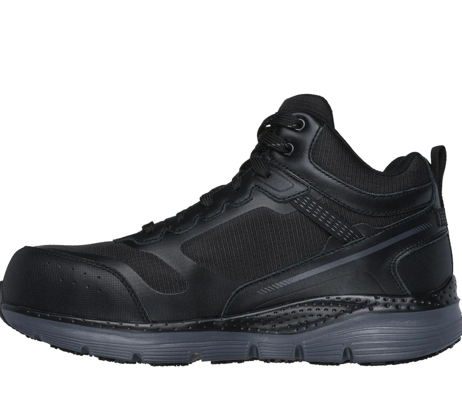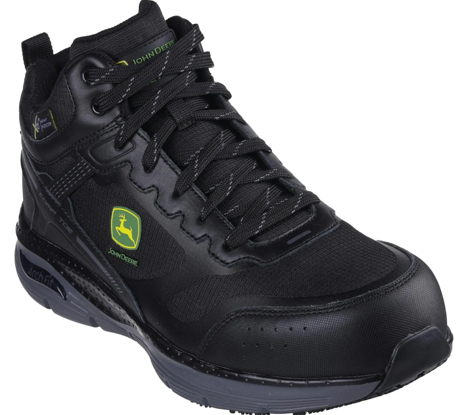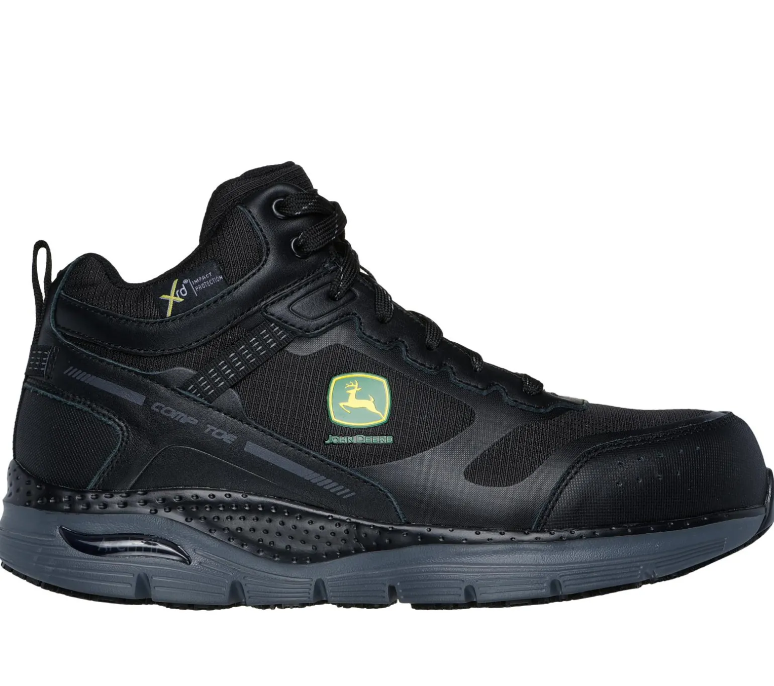 Stay supported in all-day comfort with Skechers Work x John Deere: Arch Fit SR – Onyx Cove. This athletic high-top features a synthetic mesh and leather upper, composite safety toe with an internal metatarsal guard, removable Arch Fit® insole and a slip-resistant traction outsole.