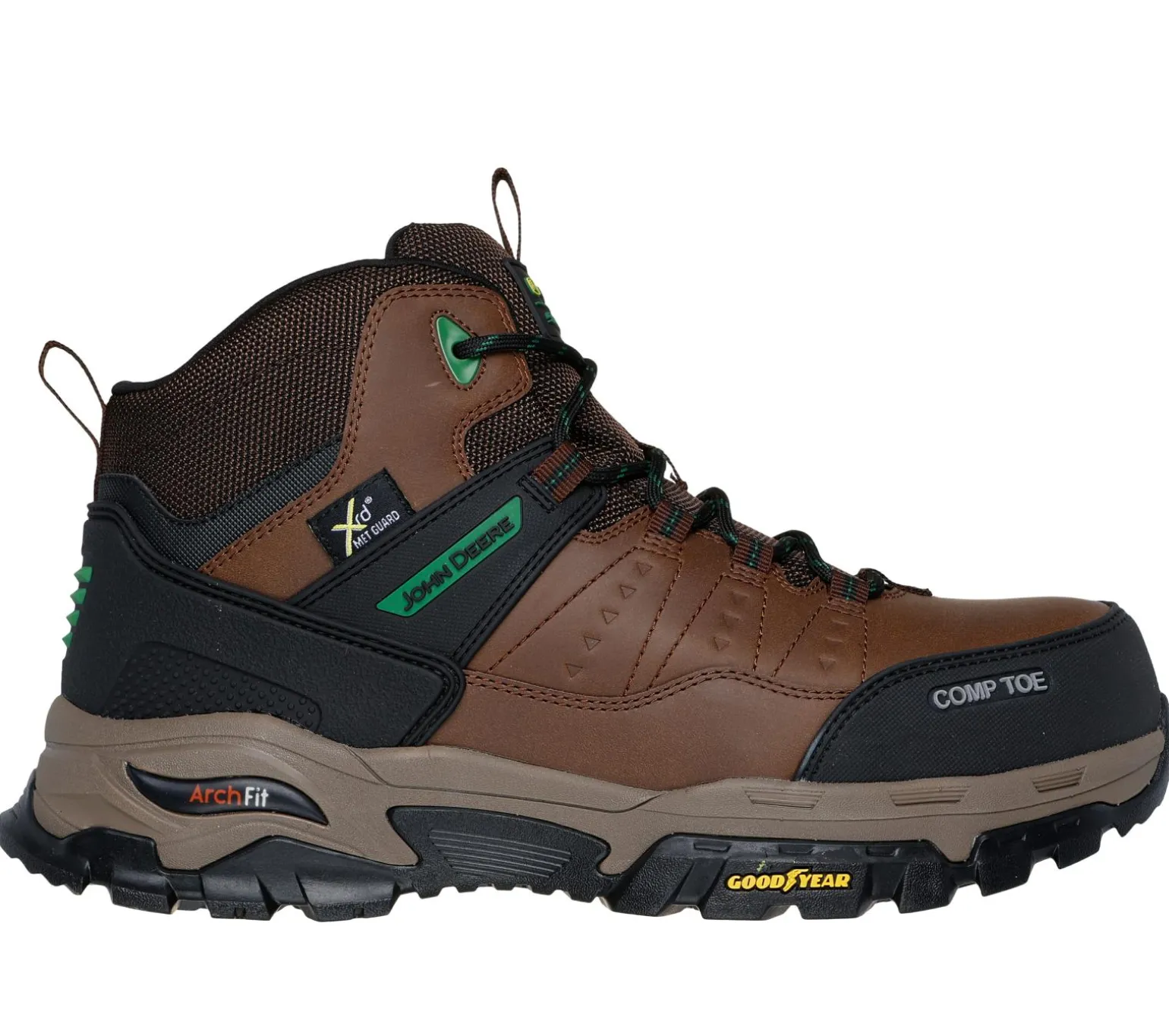Stay supported in all-day comfort with Skechers x John Deere: Arch Fit Tarver CT – Iron Forge. This boot features a lace-up leather and nylon mesh upper, composite toe with an internal metatarsal guard, removable Arch Fit® insole and Goodyear® Rubber Outsole.