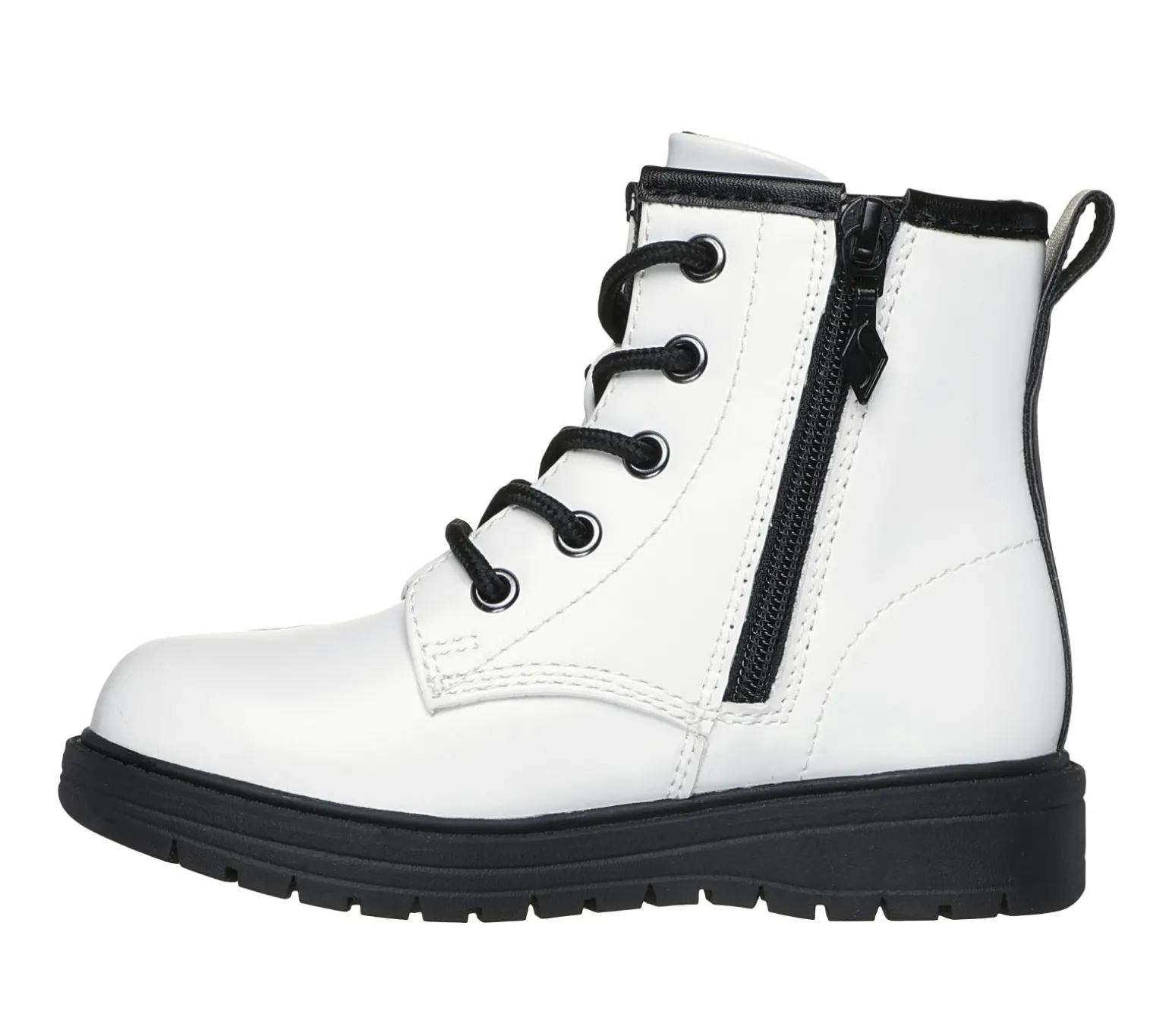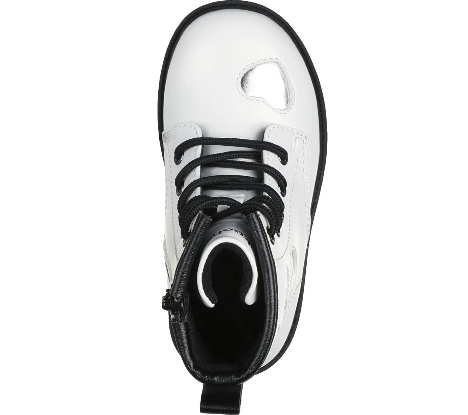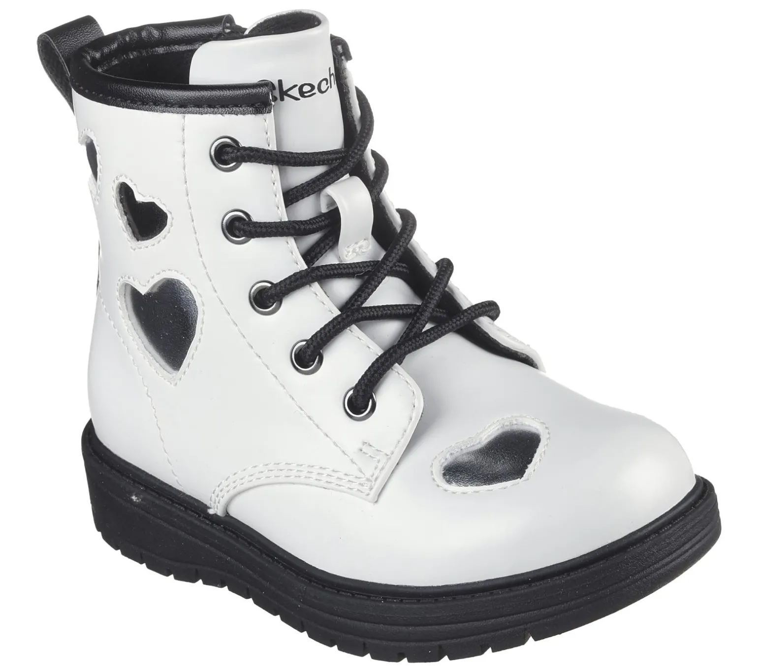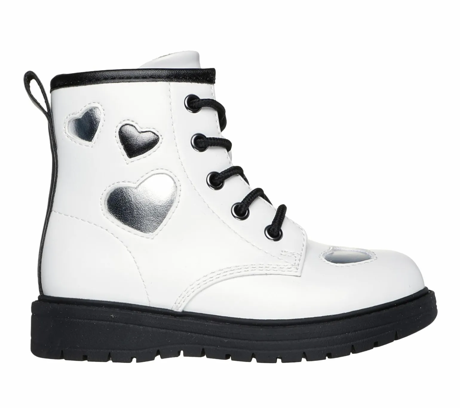 Have them looking cute and cool wearing Skechers Lil Gravlen – Metallic Amor. This mid-calf lace-up boot is embellished with metallic cut-out hearts and features a smooth faux-leather upper, side-zipper plus Adaptive Closure, and a cushioned comfort insole.