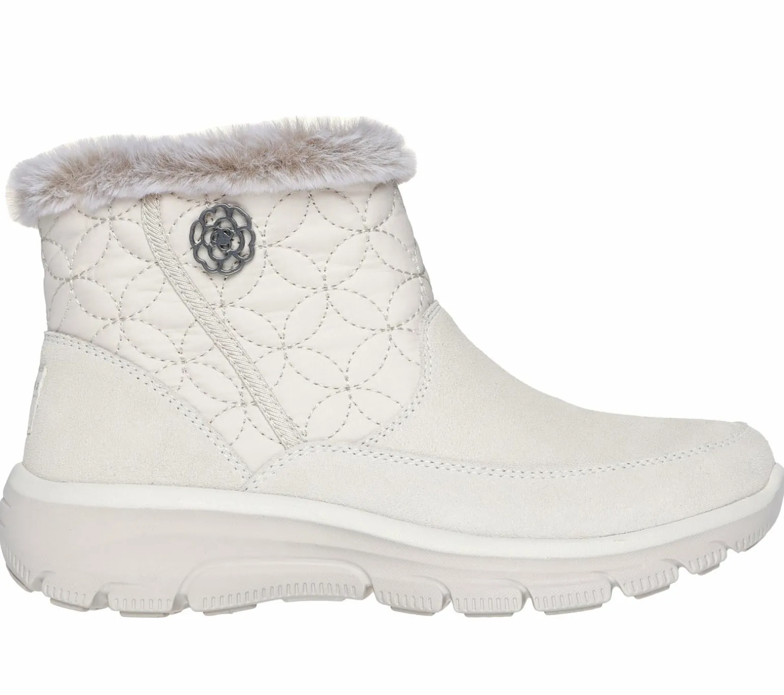 Celebrated lifestyle expert, Martha Stewart, delivers her one-of-a-kind touch to Skechers in this spirited collaboration. Start your garden walk-abouts in stylish roomy comfort wearing Martha Stewart x Skechers Relaxed Fit®: Easy Going – Darling Puffer. This casual boot features a 3M® Scotchgard® treated quilted textile and suede upper with side zip closure, faux fur trim, and a cushioned Skechers Air-Cooled Memory Foam® insole.
