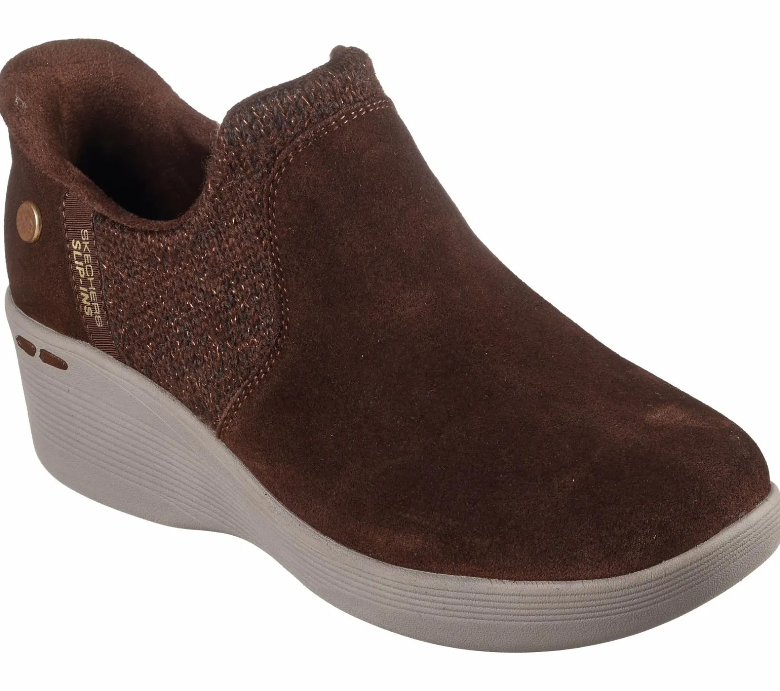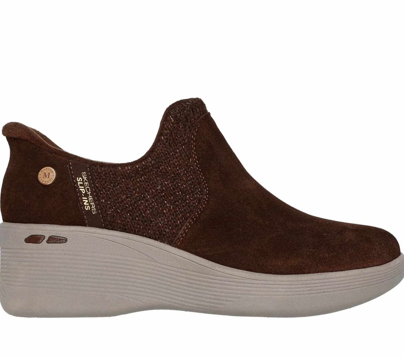 Celebrated lifestyle expert, Martha Stewart, delivers her one-of-a-kind touch to Skechers in this spirited collaboration. Heighten your steps in style wearing Martha Stewart x Skechers Hands Free Slip-ins®: Pier-Lite – Lovely Autumn. Designed with our exclusive Heel Pillow, this casual wedge bootie features a Scotchgard® treated suede and knitted upper, chenille lining, and a Skechers Air-Cooled Memory Foam® cushioned comfort insole.