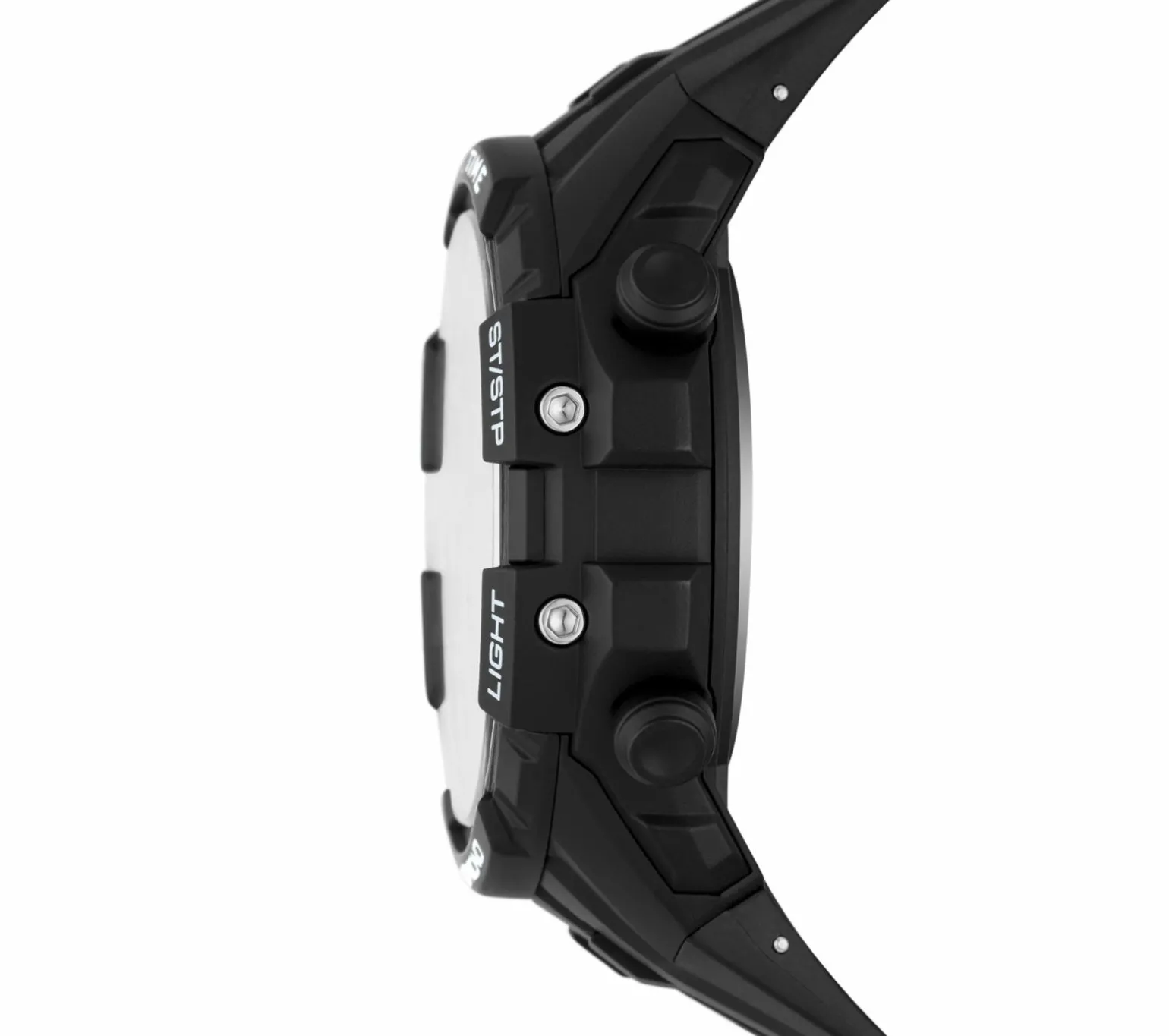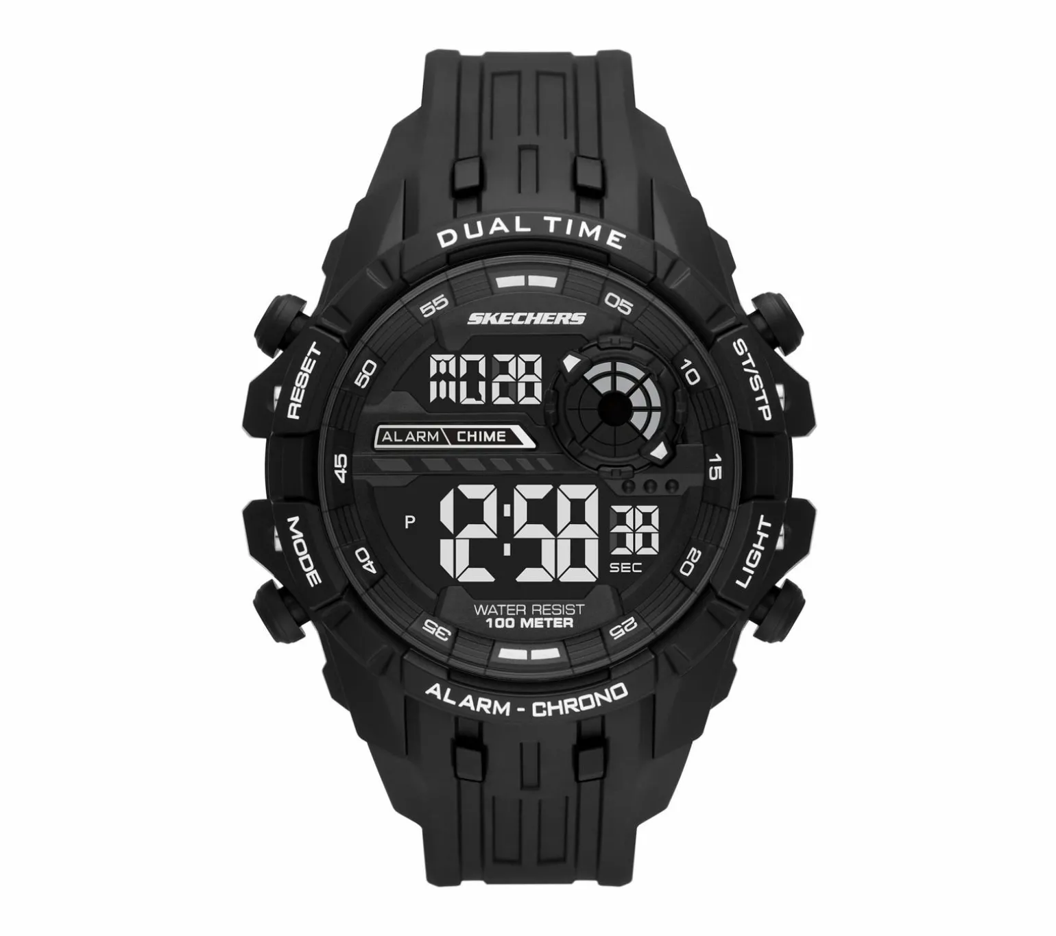 Keep time in sporty water-friendly style wearing Skechers McConnell Big Push Black Watch. Featuring a plastic and stainless steel case with a plastic band, dual time digital display, four-button control, compass function, and water resistance to 100 meters.