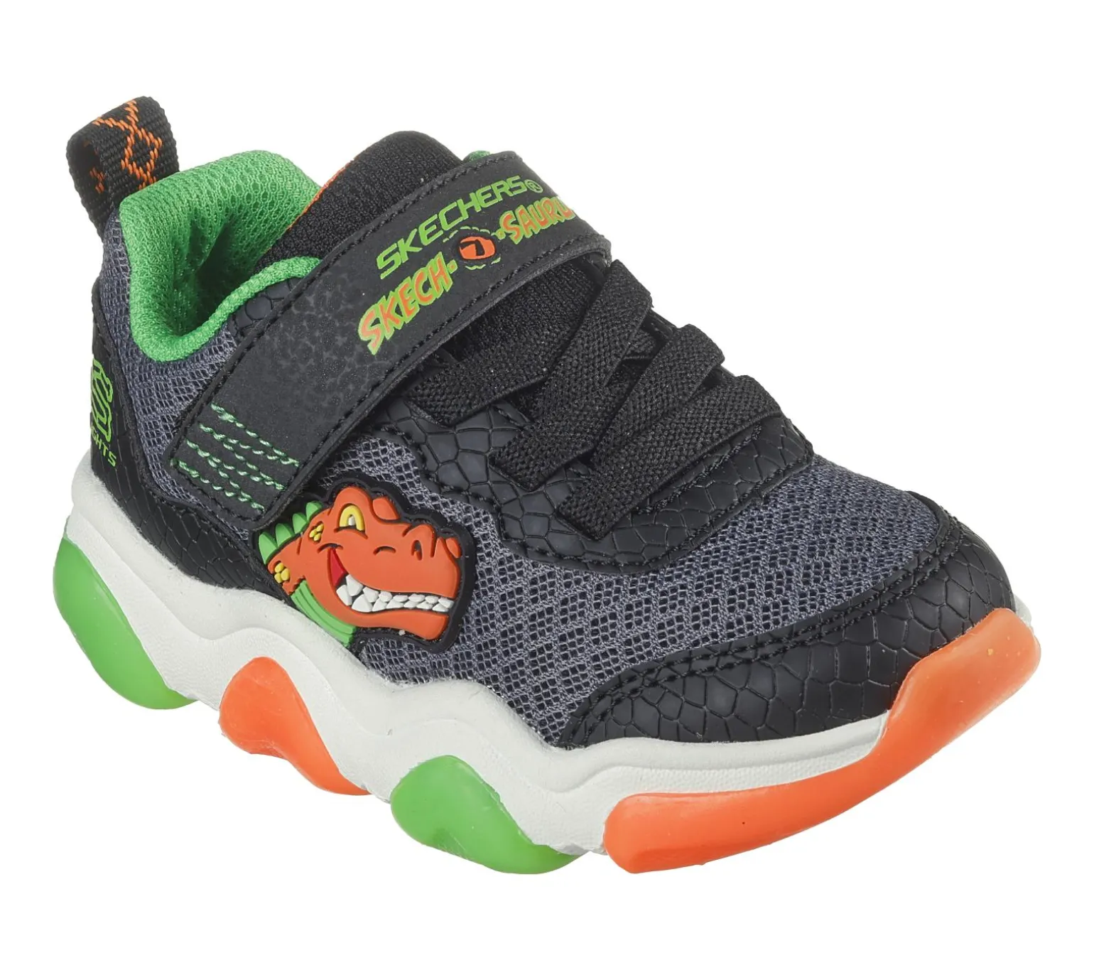 Stomp in roar-some fun and comfort wearing Skechers Mighty Glow 2.0 – Dino-Bolt. This lighted dinosaur themed design features a mesh and synthetic upper with stretch-laces, Skechers Adaptive Closure, and a cushioned comfort insole.