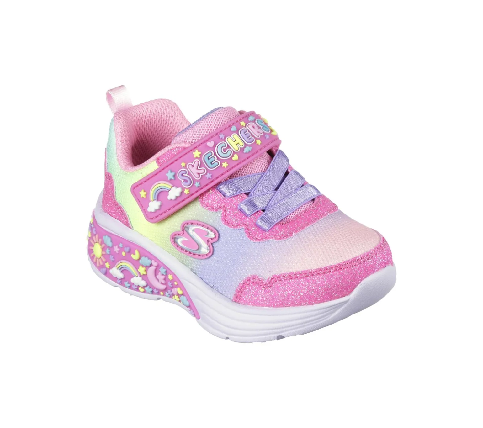 Playful lights and colorful fun combine in Skechers My Dreamers. This light-up sky-themed style features an ombre glitter mesh and synthetic upper with stretch laces, adjustable instep strap and a well-cushioned light-up midsole