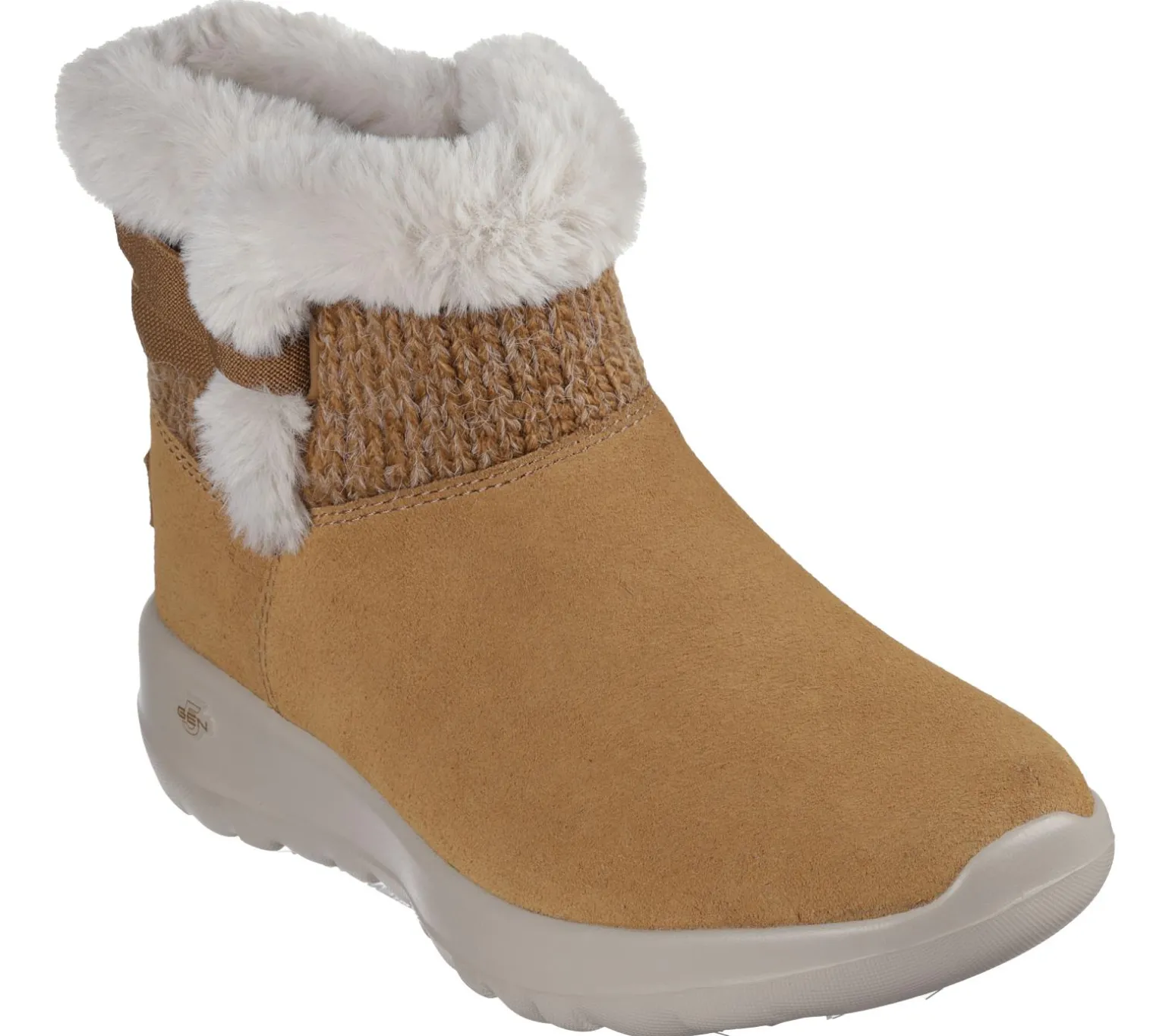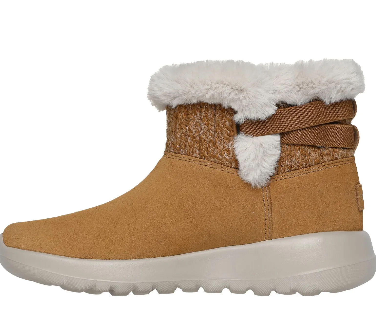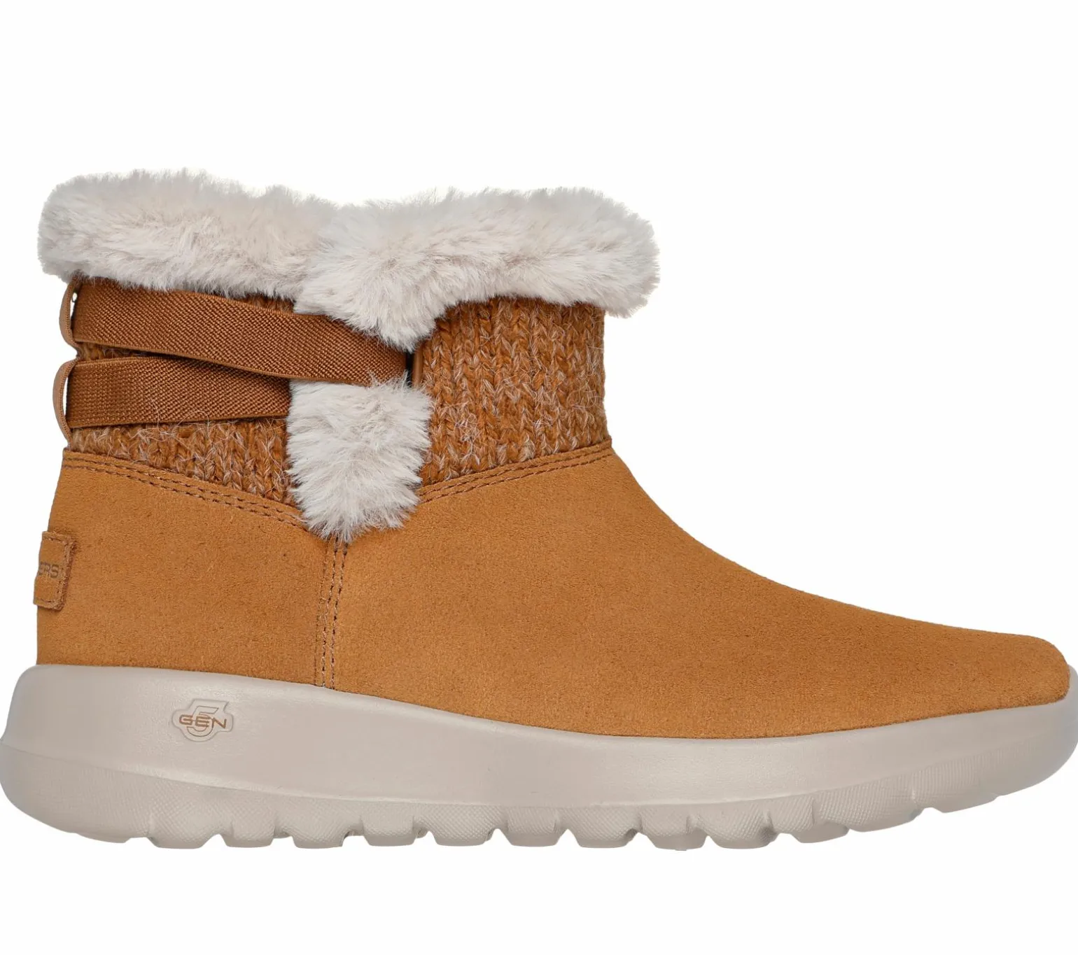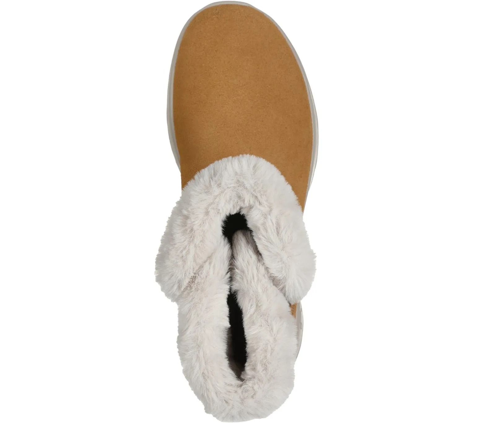 Comfy, warm, and cozy is how you’ll feel wearing Skechers On-the-GO® Joy – Whispering Willow. This pull-on ankle boot features a 3M® Scotchgard® treated suede upper with a sweater-knit shaft, faux-fur collar and lining, a Skechers Air-Cooled Goga Mat insole, and lightweight 5GEN® midsole cushioning.