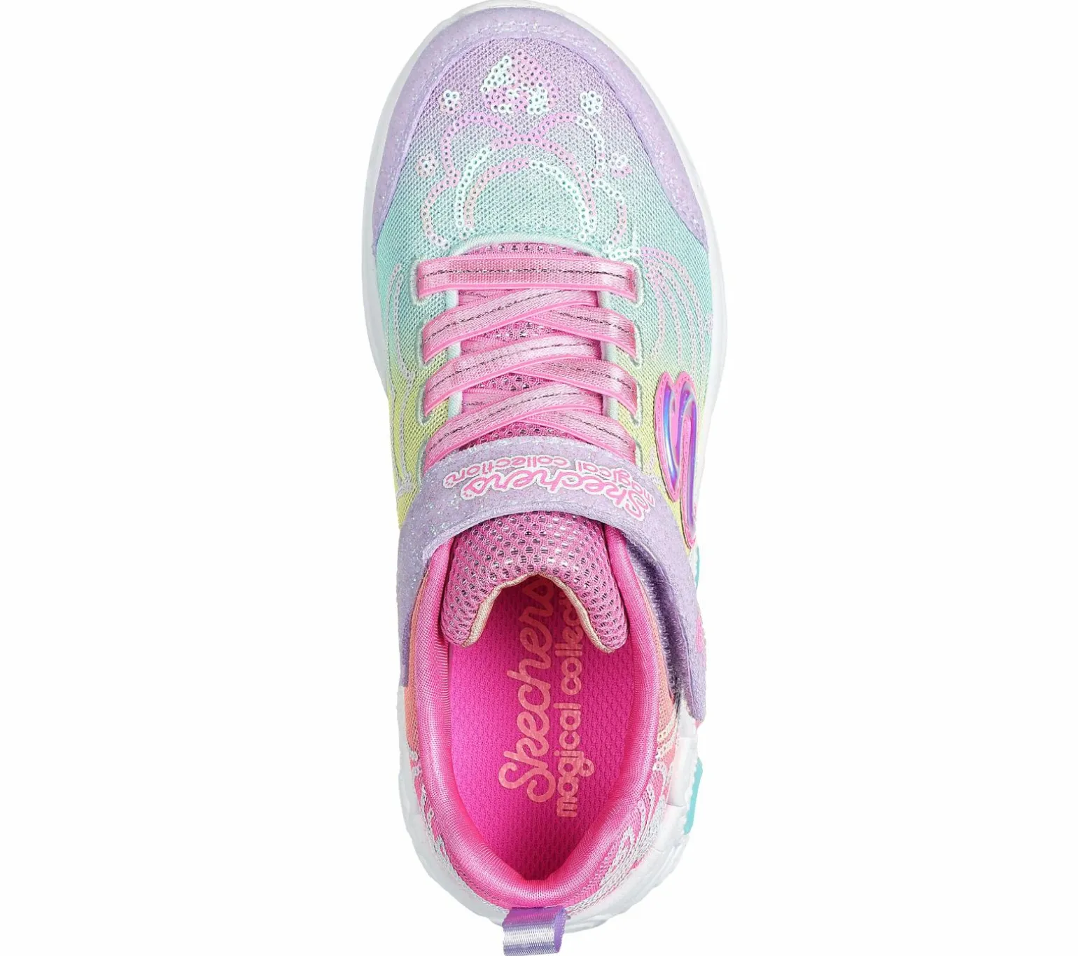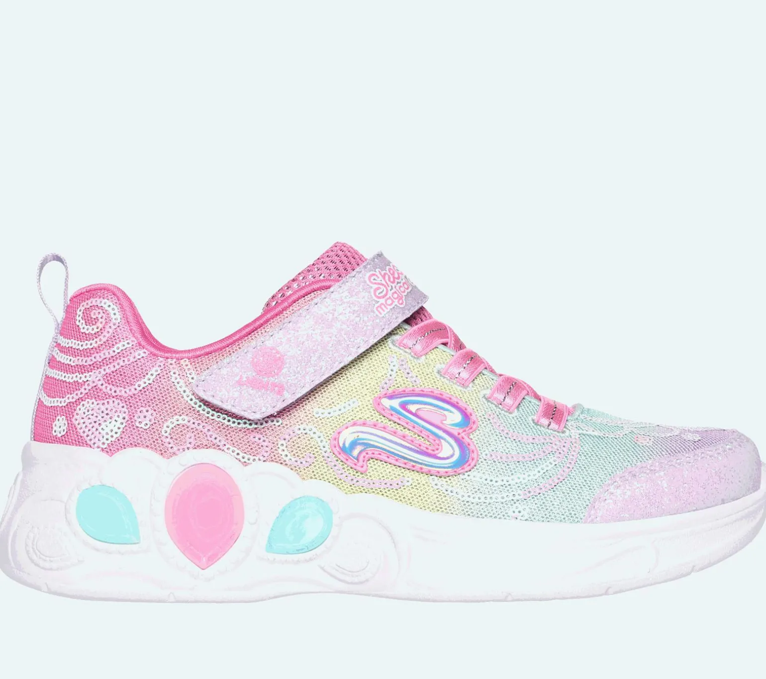 Light up your steps with royally cute style in Skechers S-Lights®: Princess Wishes. This sporty Magical Collection® themed design features a glittery mesh and sequin embellished upper with stretch laces, adjustable instep strap, cushioned comfort insole, and a light-up midsole. Bonus wand included as a gift with purchase.