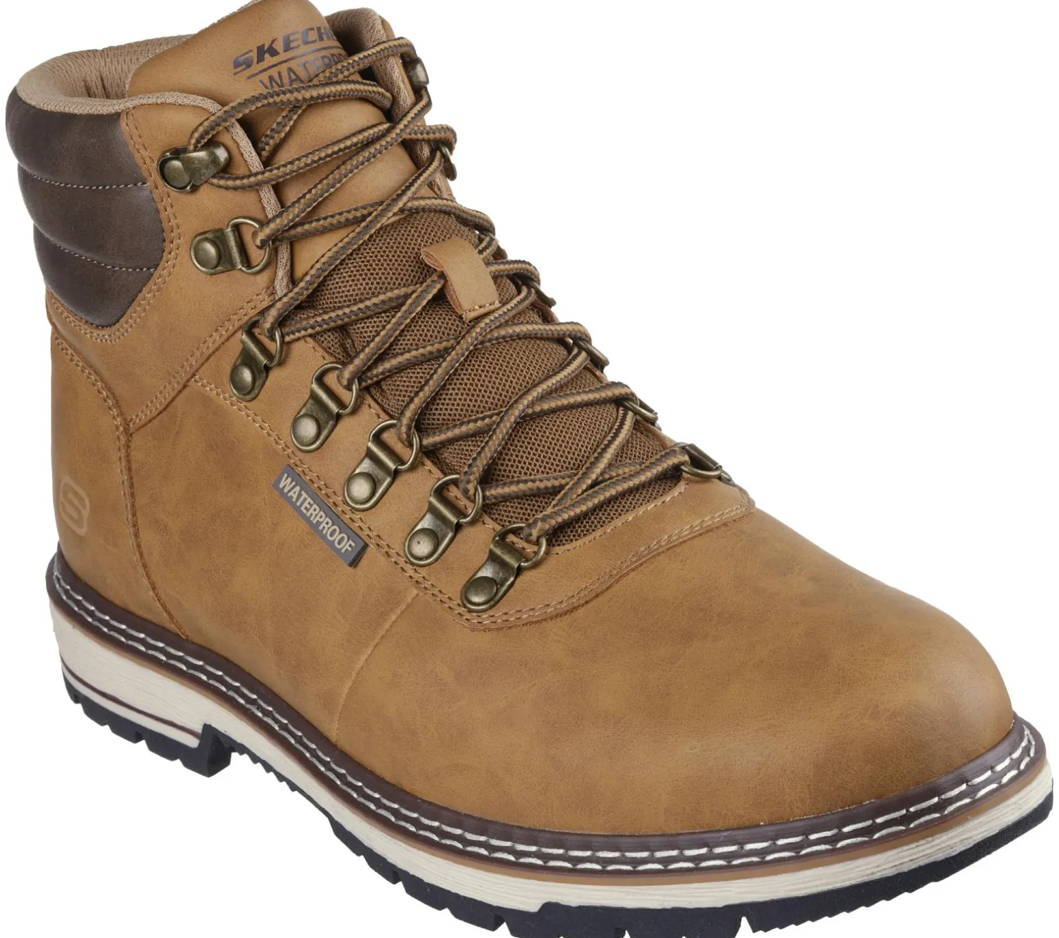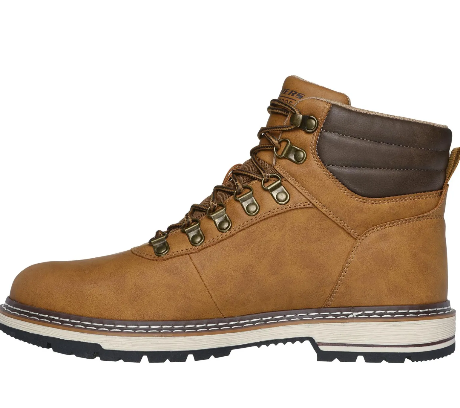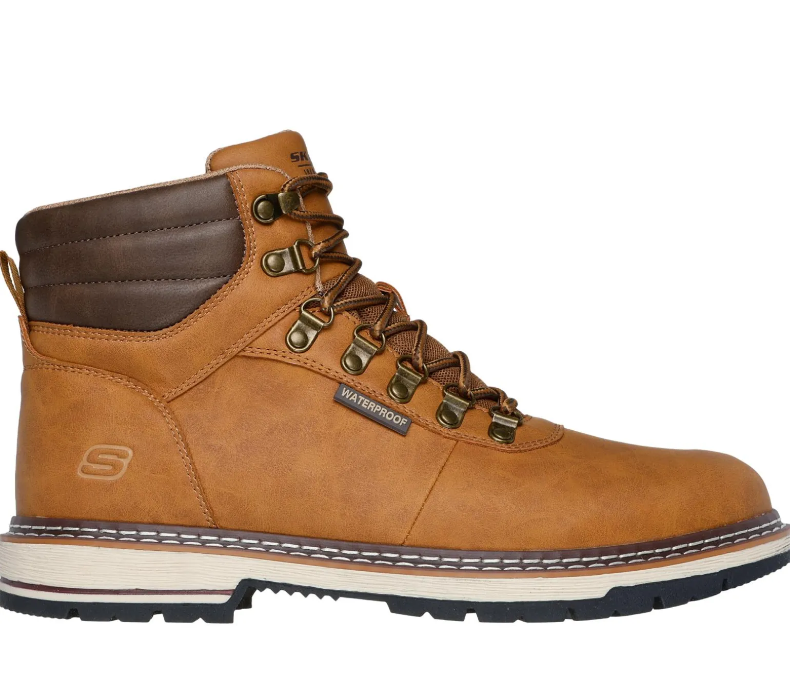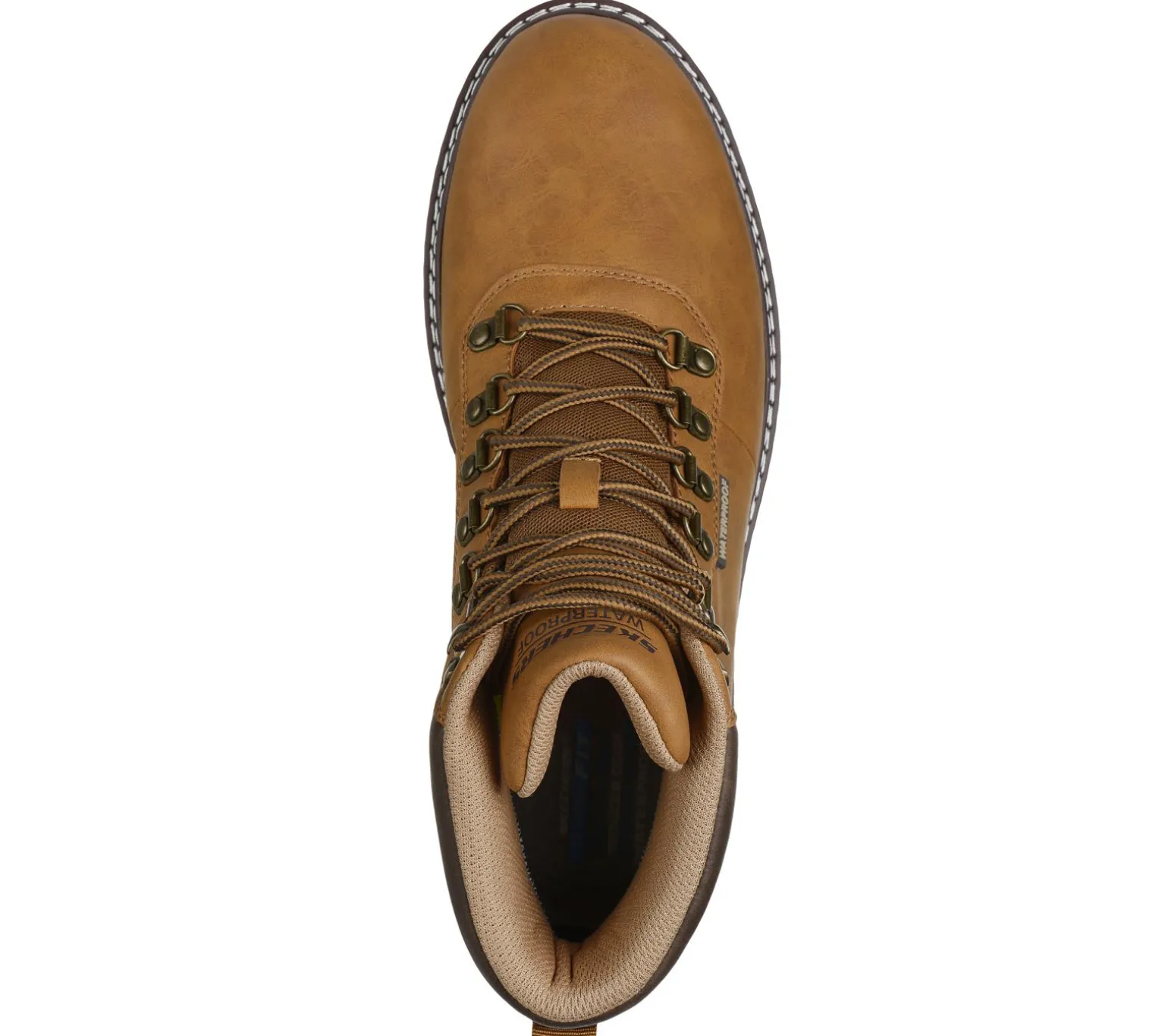 Head outdoors rain or shine wearing Skechers Relaxed Fit®: Corado – Jaxx. This classic trail-style boot features a smooth, waterproof faux-leather upper with padded collar, a charcoal-infused Skechers Air-Cooled Memory Foam® insole, and Goga Mat Arch cushioning for added support.