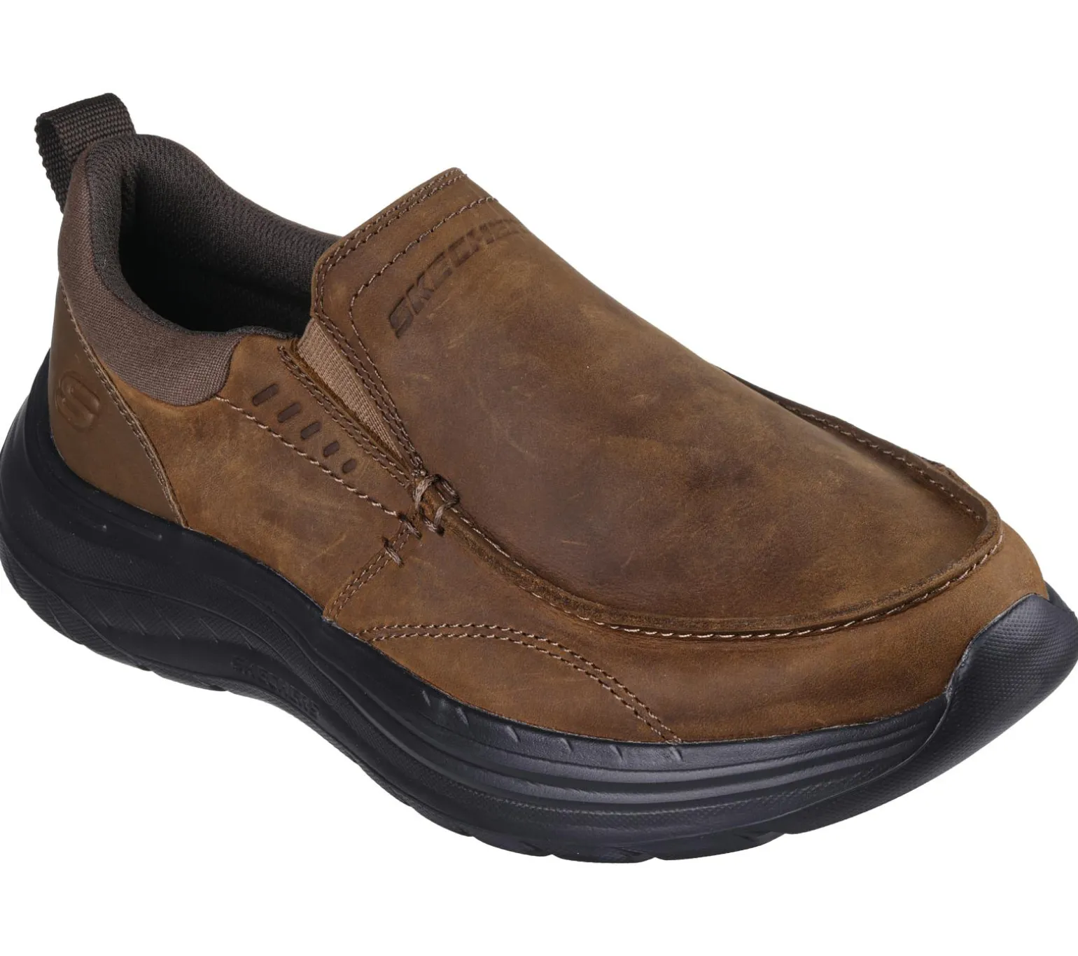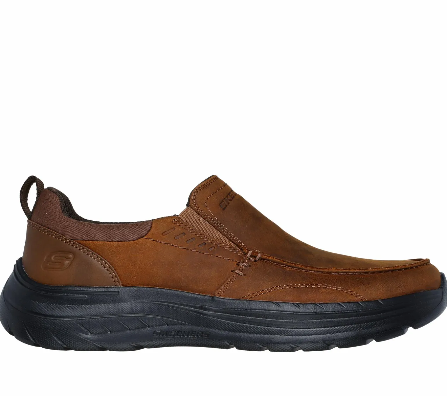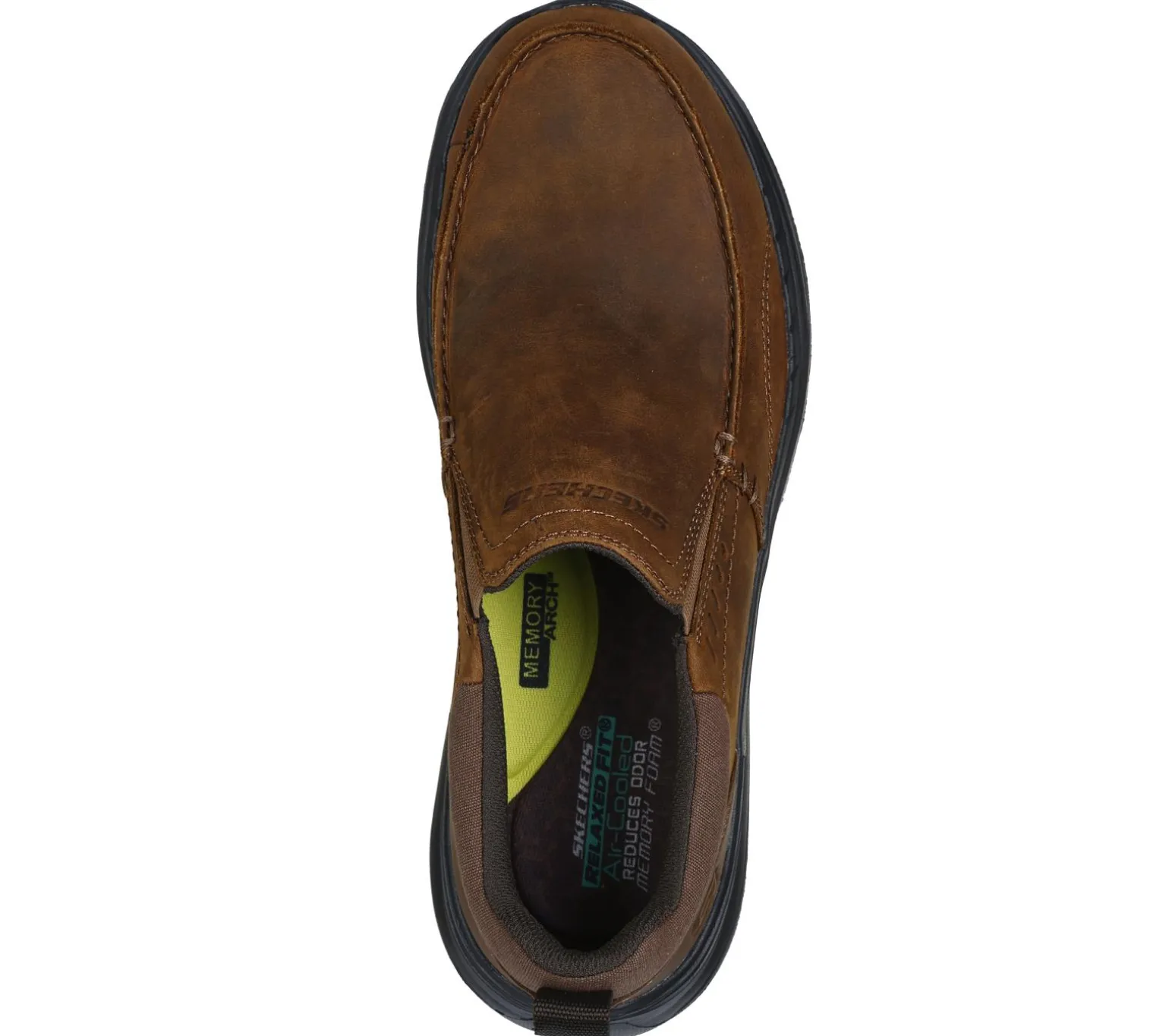 Enjoy casual style and comfort wearing Skechers Relaxed Fit® Decklan – Aldred. This moc toe loafer features a leather upper with dual gore panels, a charcoal-infused Skechers Air-Cooled Memory Foam® insole, and Skechers Memory Arch cushioning for added support.