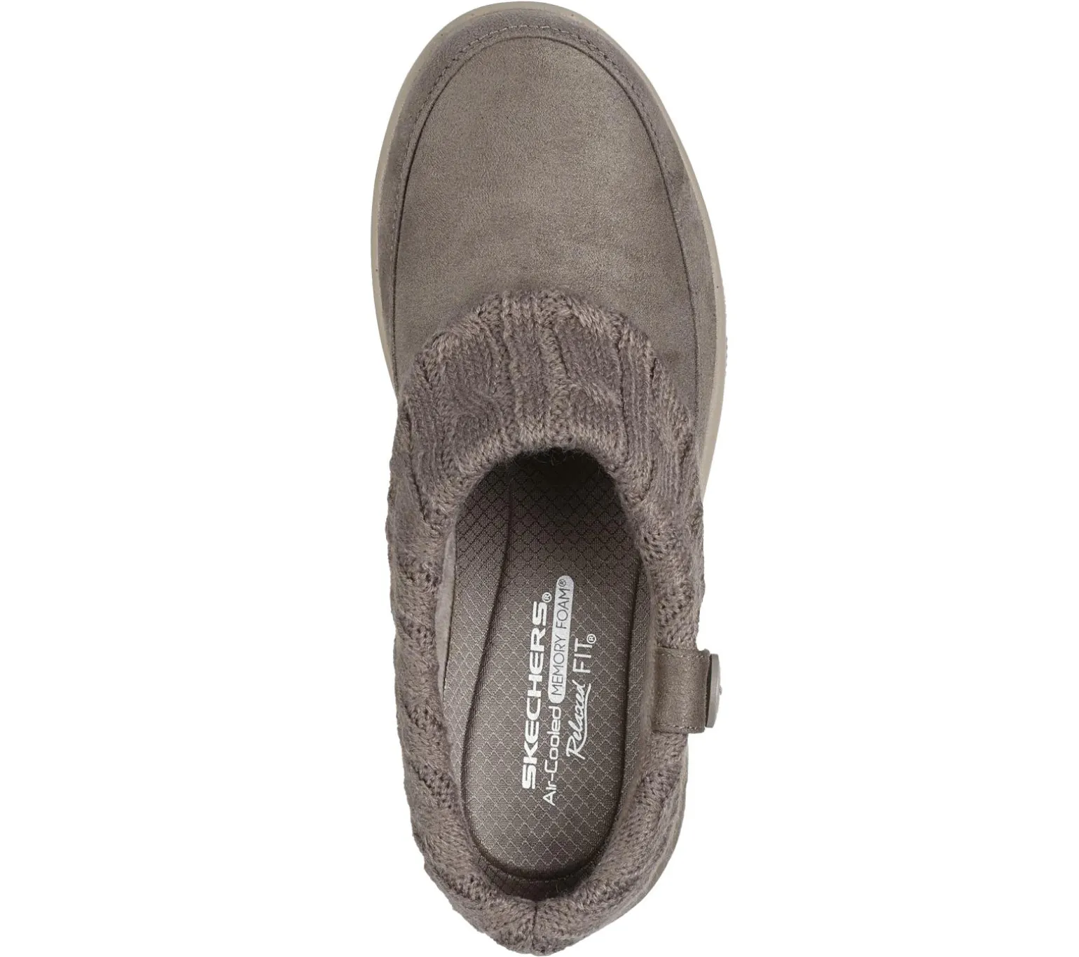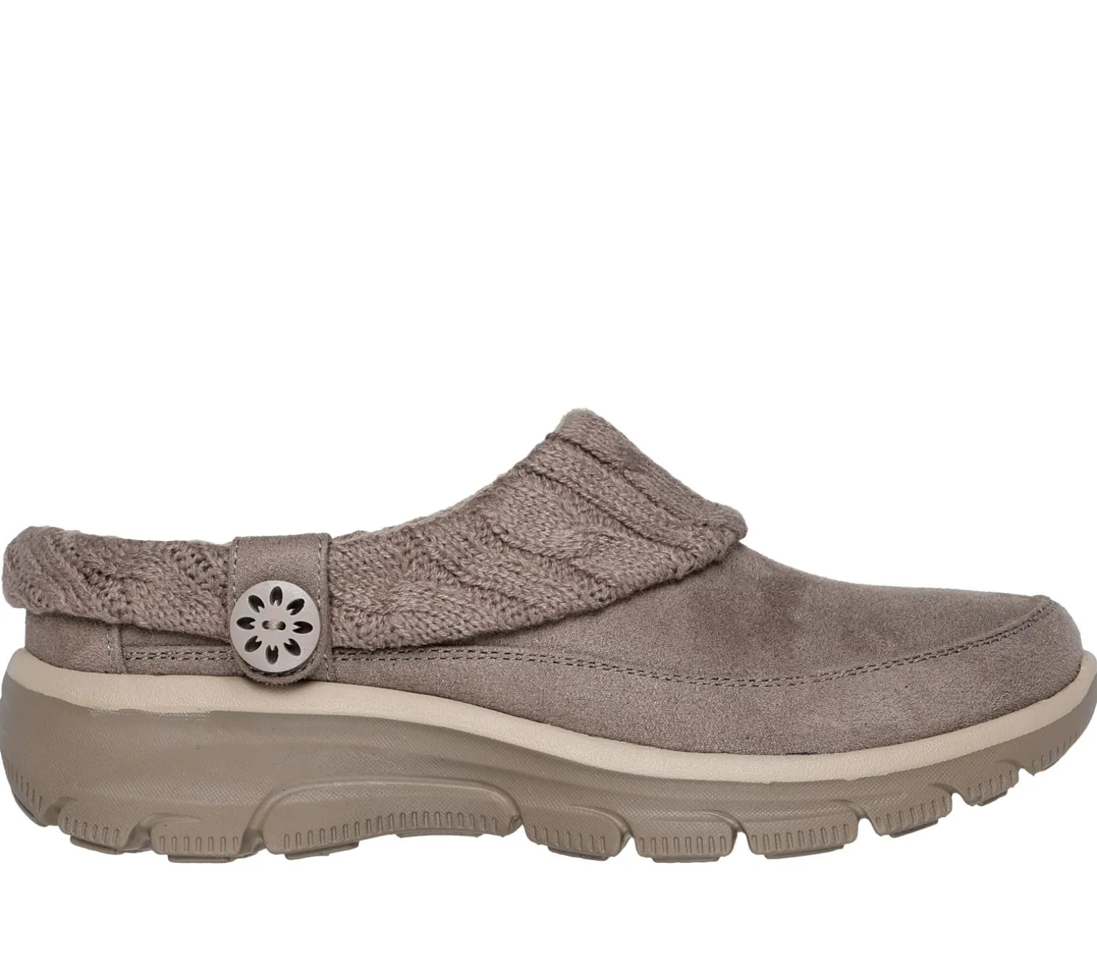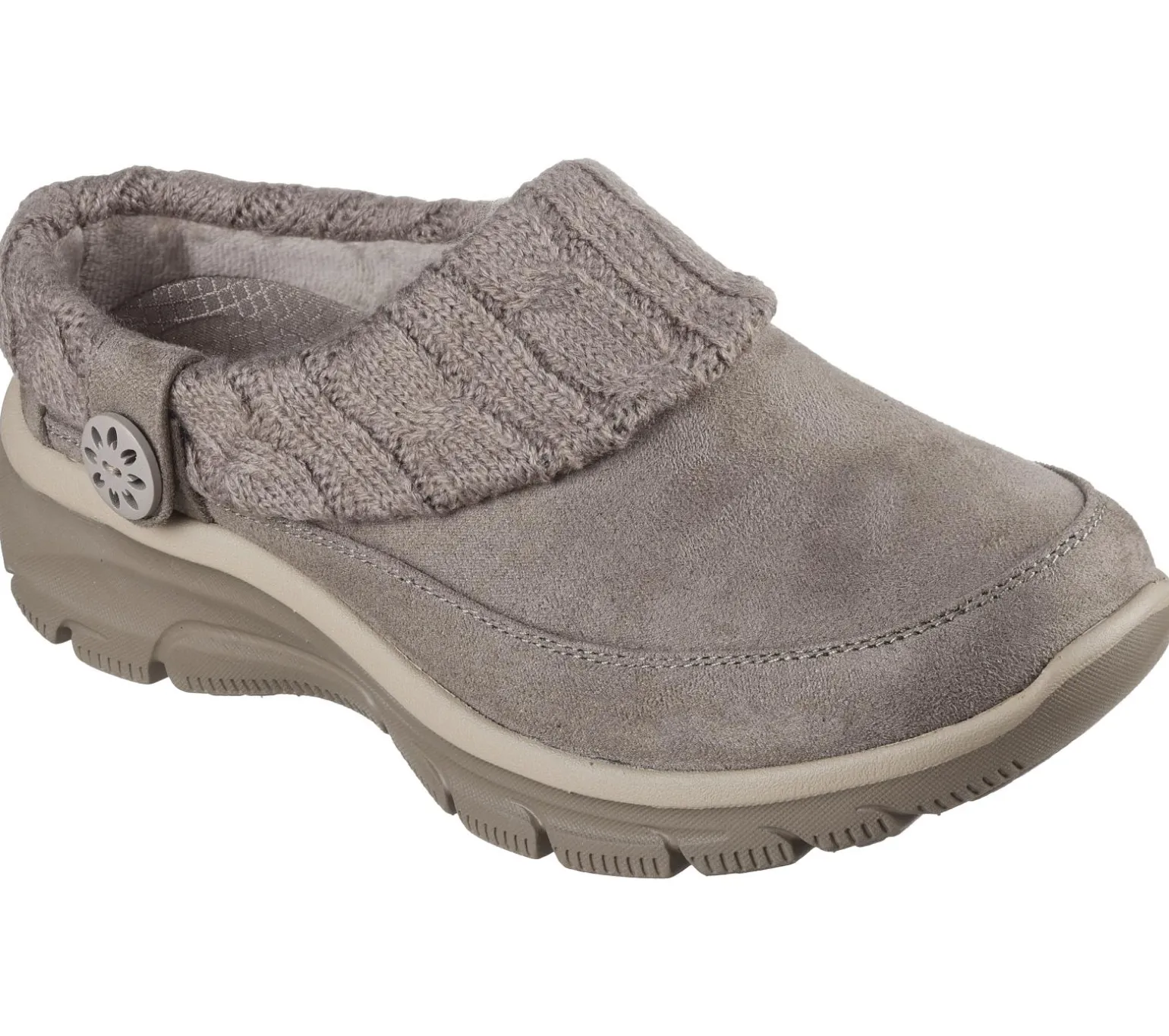 Step out in casual style and cozy comfort wearing Skechers Relaxed Fit®: Easy Going – Warm Duet. This vegan open-back mule design features a 3M® Scotchgard® treated suede-look upper with a buttoned, fold-over cable knit collar, chenille lining, and a cushioned Skechers Air-Cooled Memory Foam® insole.