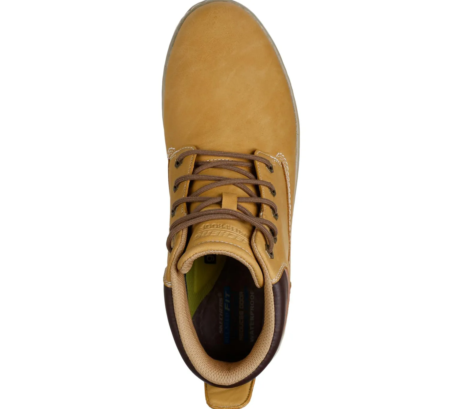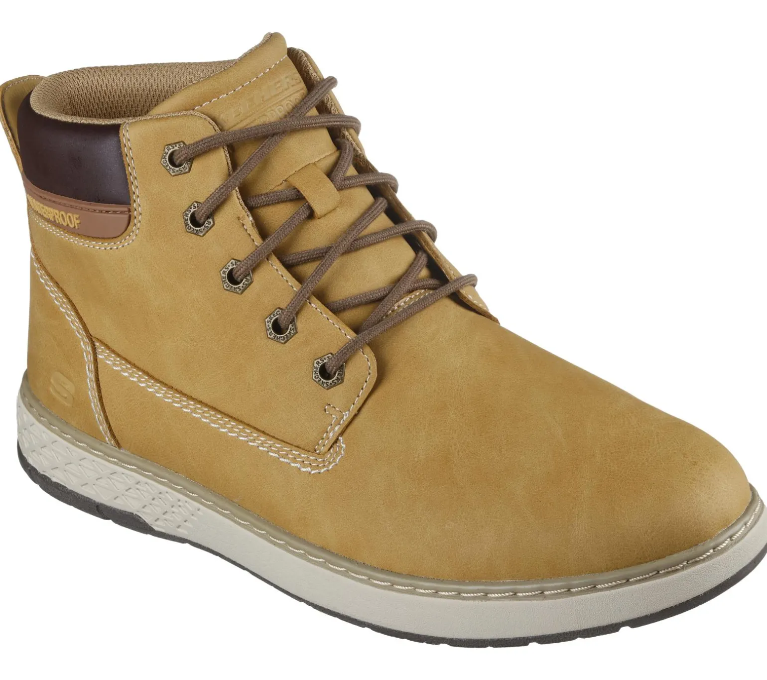 Enjoy classic comfort with Skechers Relaxed Fit®: Garlan – Deno. Featuring a waterproof lace-up vegan leather upper, a charcoal-infused Skechers Air-Cooled Memory Foam® insole, and Goga Mat Arch cushioning for added support.
