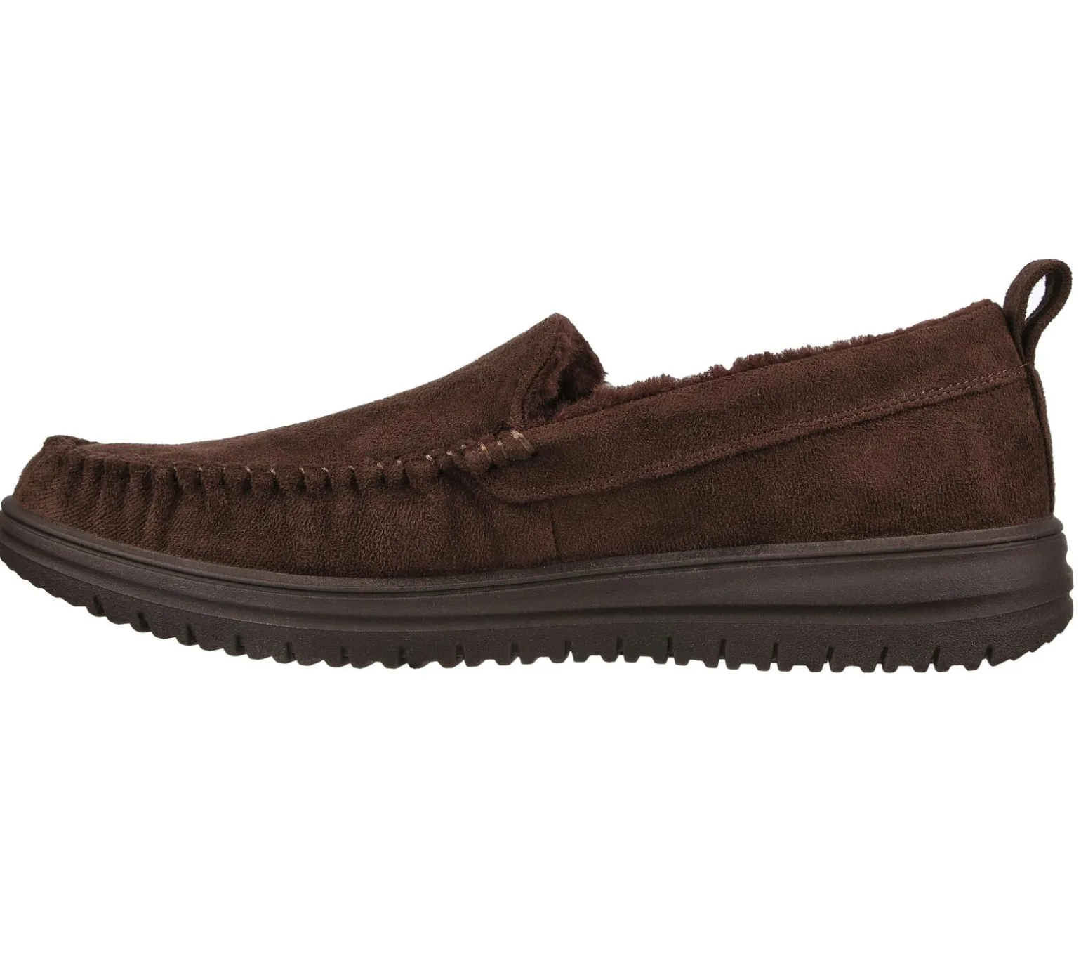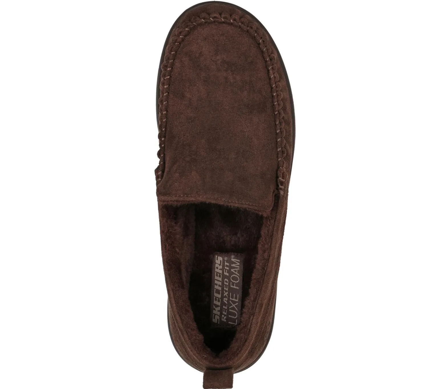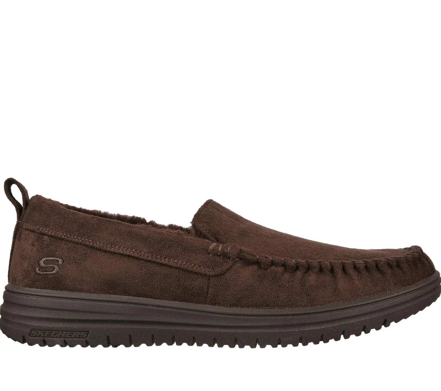 ENJOY THE COMFORT® Keep it cozy in laid-back comfort with Skechers Relaxed Fit®: Murette – Ghetti. This moc toe slip-on features a soft microfiber fabric upper with a faux-fur lined Luxe Foam® footbed.