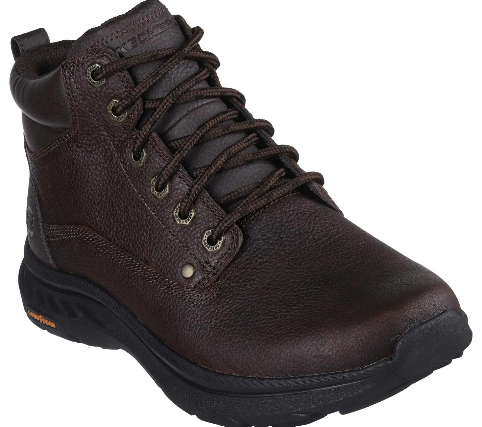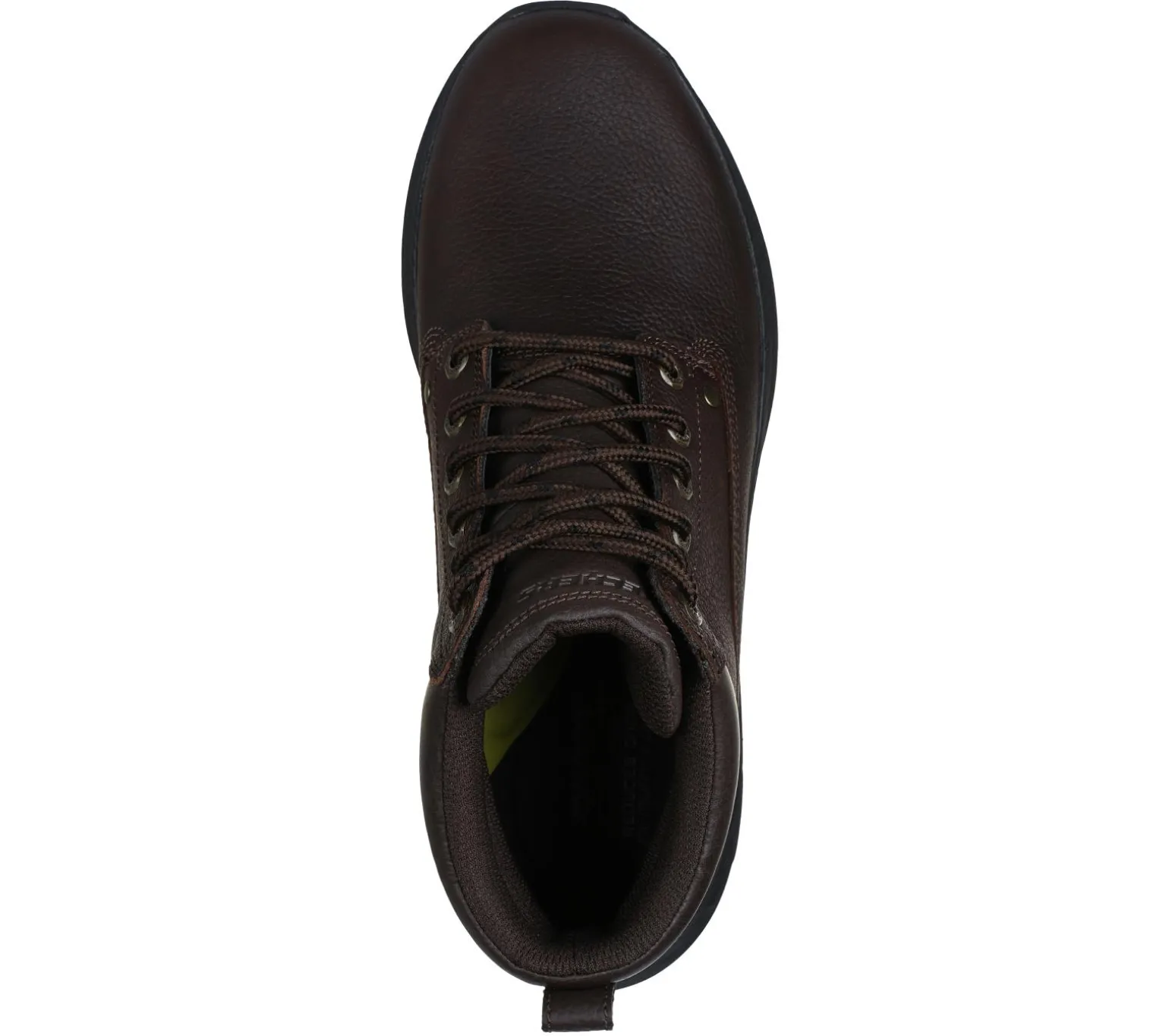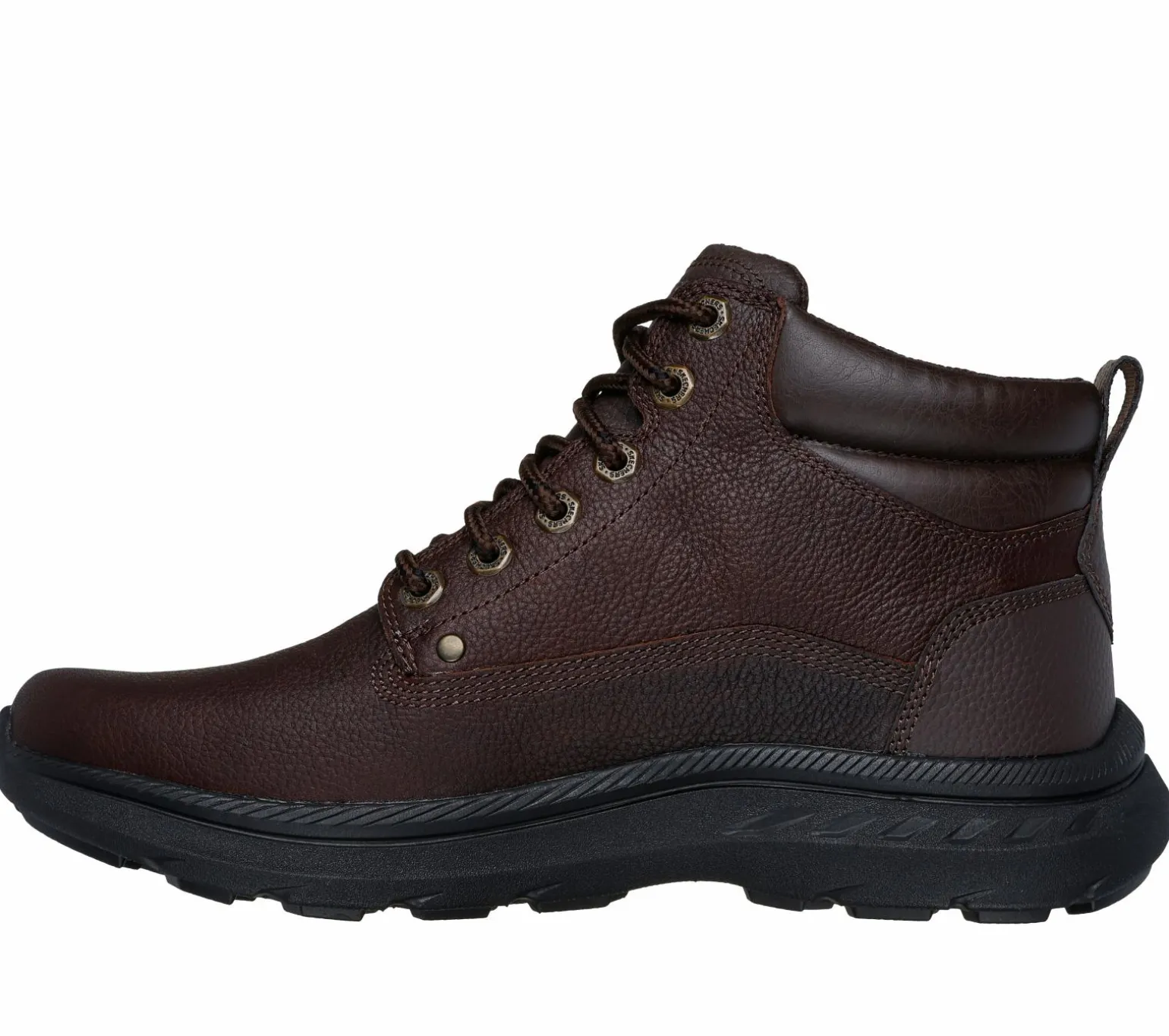 Casual style and durable comfort combine in Skechers Relaxed Fit® Pollard – Lanser. This mid-top trail-style boot features a leather upper with padded collar, charcoal-infused Skechers Air-Cooled Memory Foam® insole, and a Goodyear® Rubber Outsole.