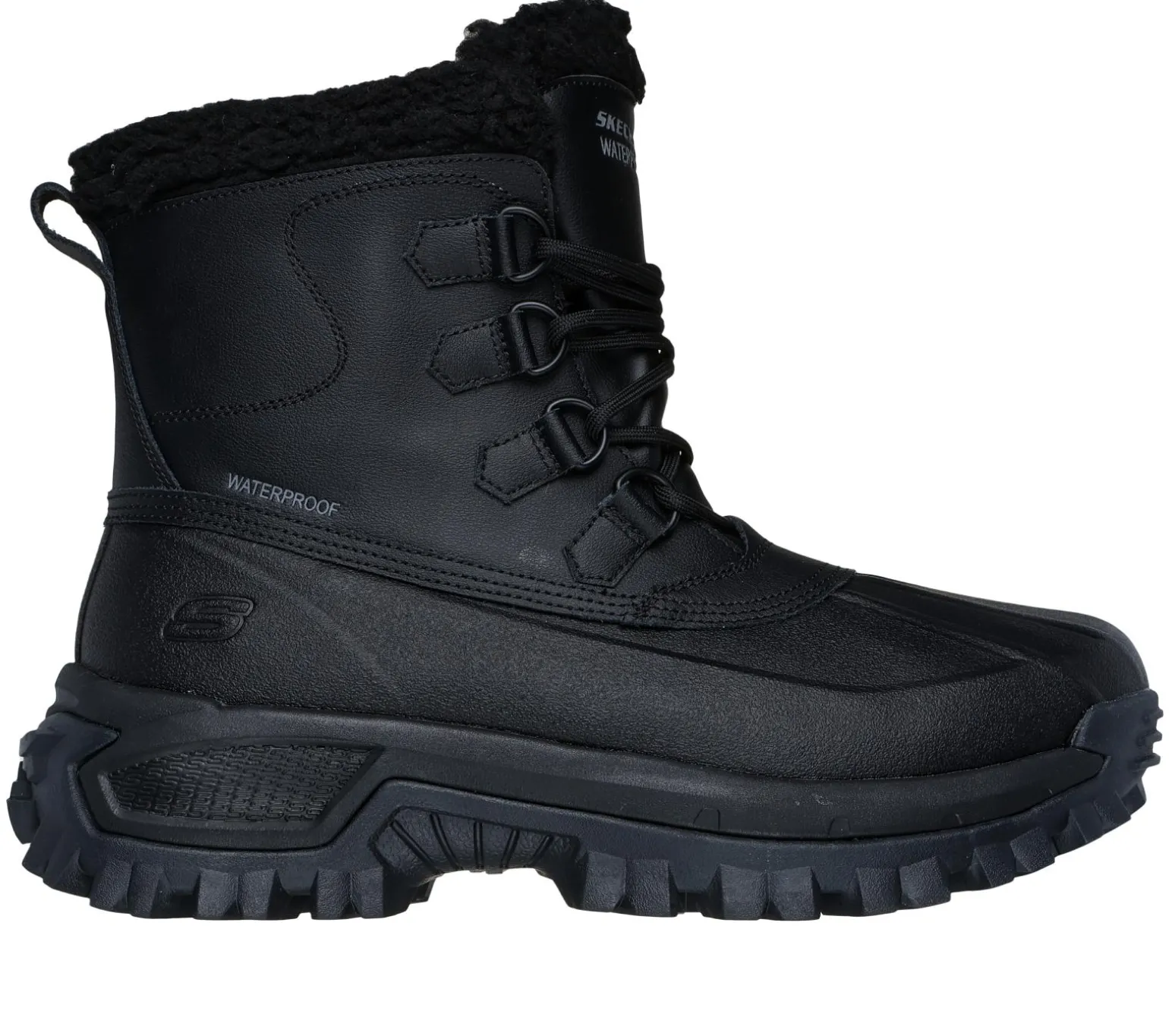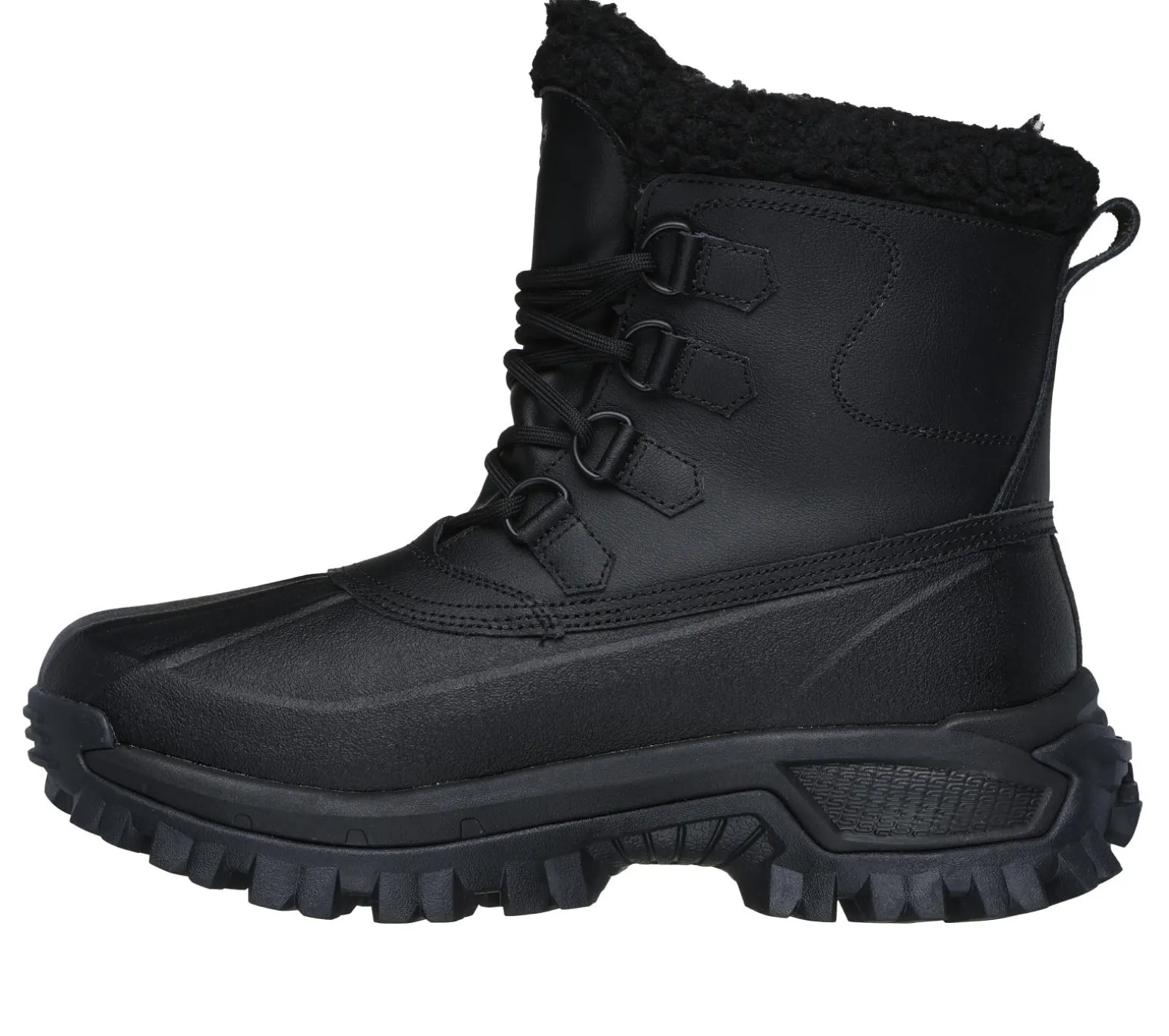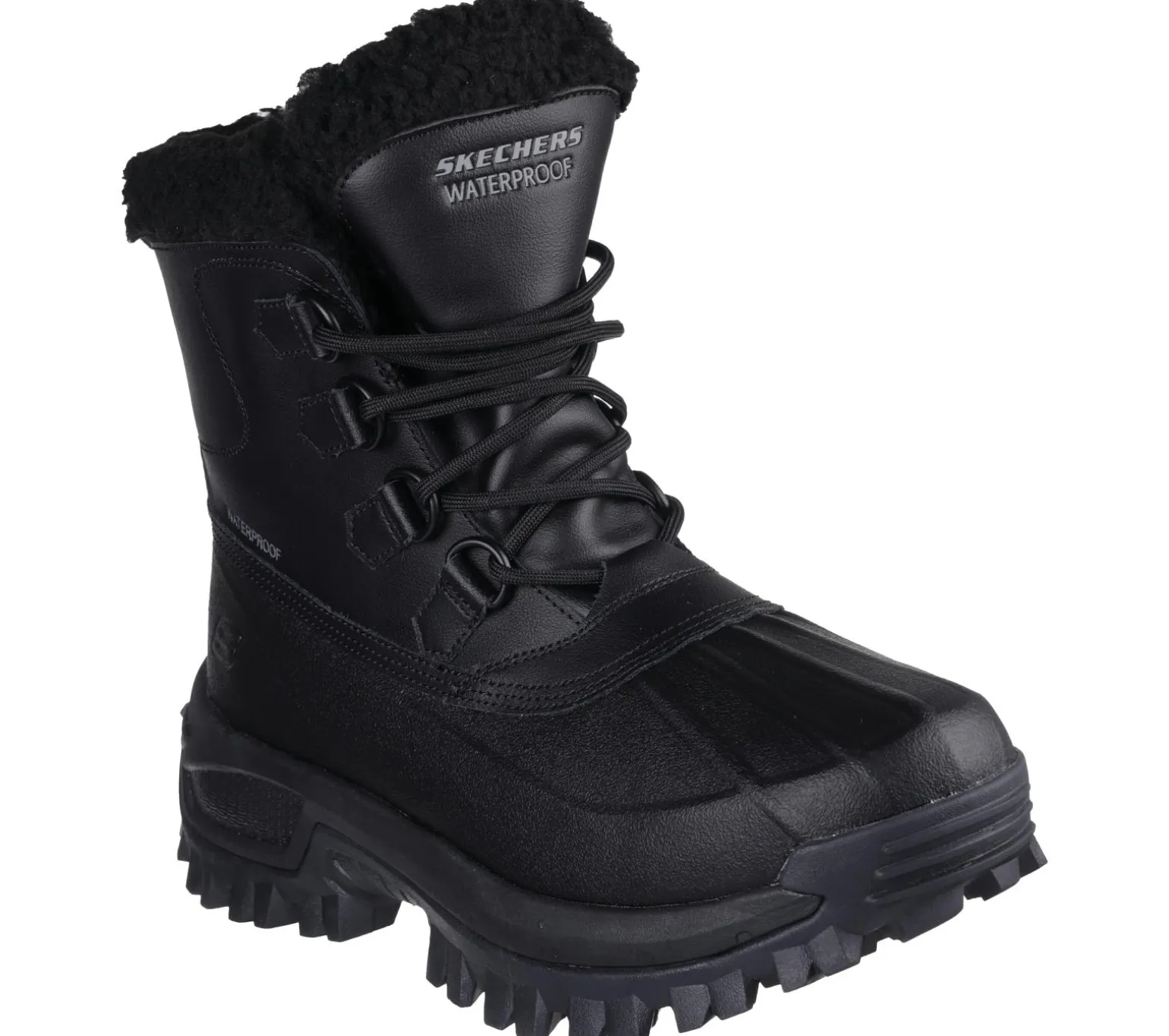 Tread through the elements in all-day comfort wearing Skechers Relaxed Fit®: Trekson – Wesley. This waterproof high-top duck boot features a leather and synthetic upper with faux-shearling trim and lining, a D-ring lace-up front, Skechers Air-Cooled Memory Foam® insole, and a durable ‘Steady Grip’ lug outsole.