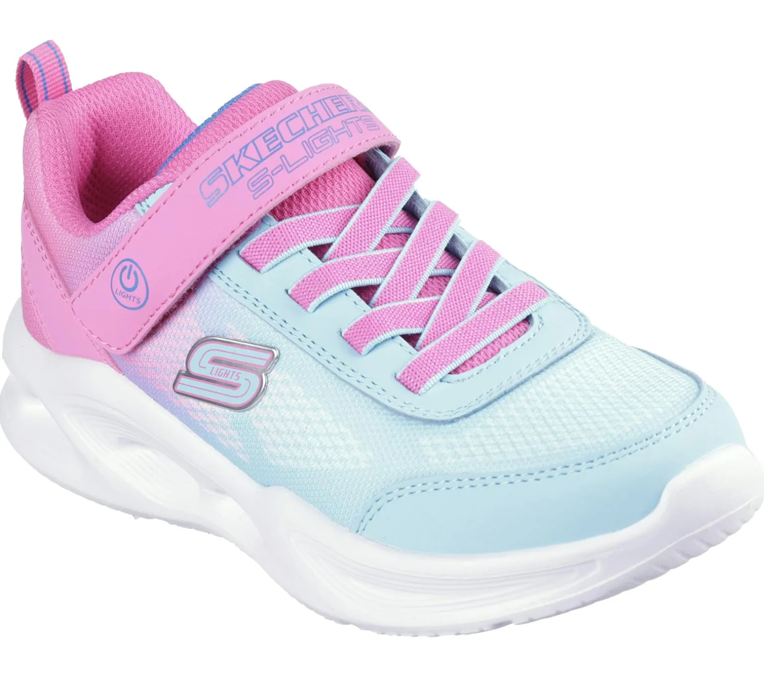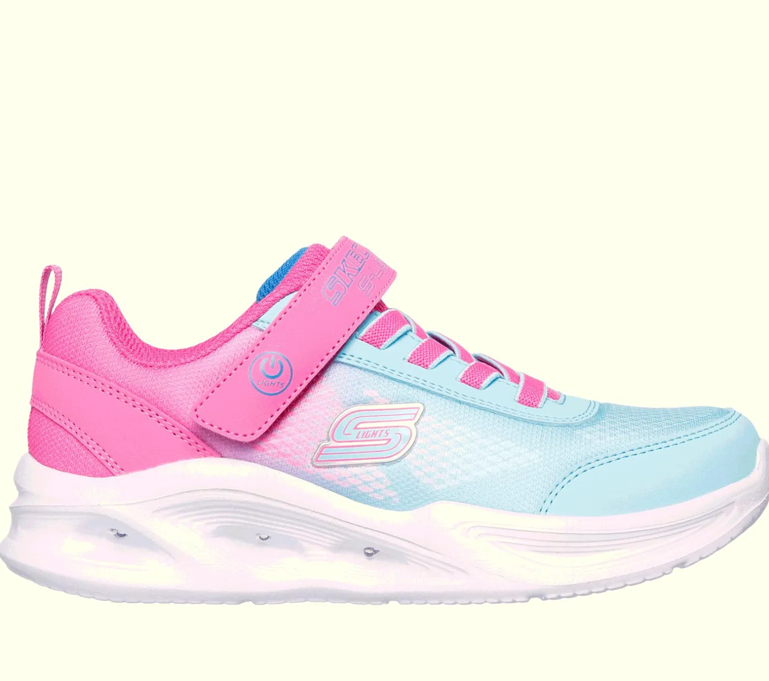 Bring the fun in sporty fashion wearing Skechers S-Lights®: Sola Glow – Ombre Deluxe. This active multi-colored lights design features an ombre mesh and synthetic upper with stretch laces, adjustable instep strap, and well-cushioned light-up midsole.