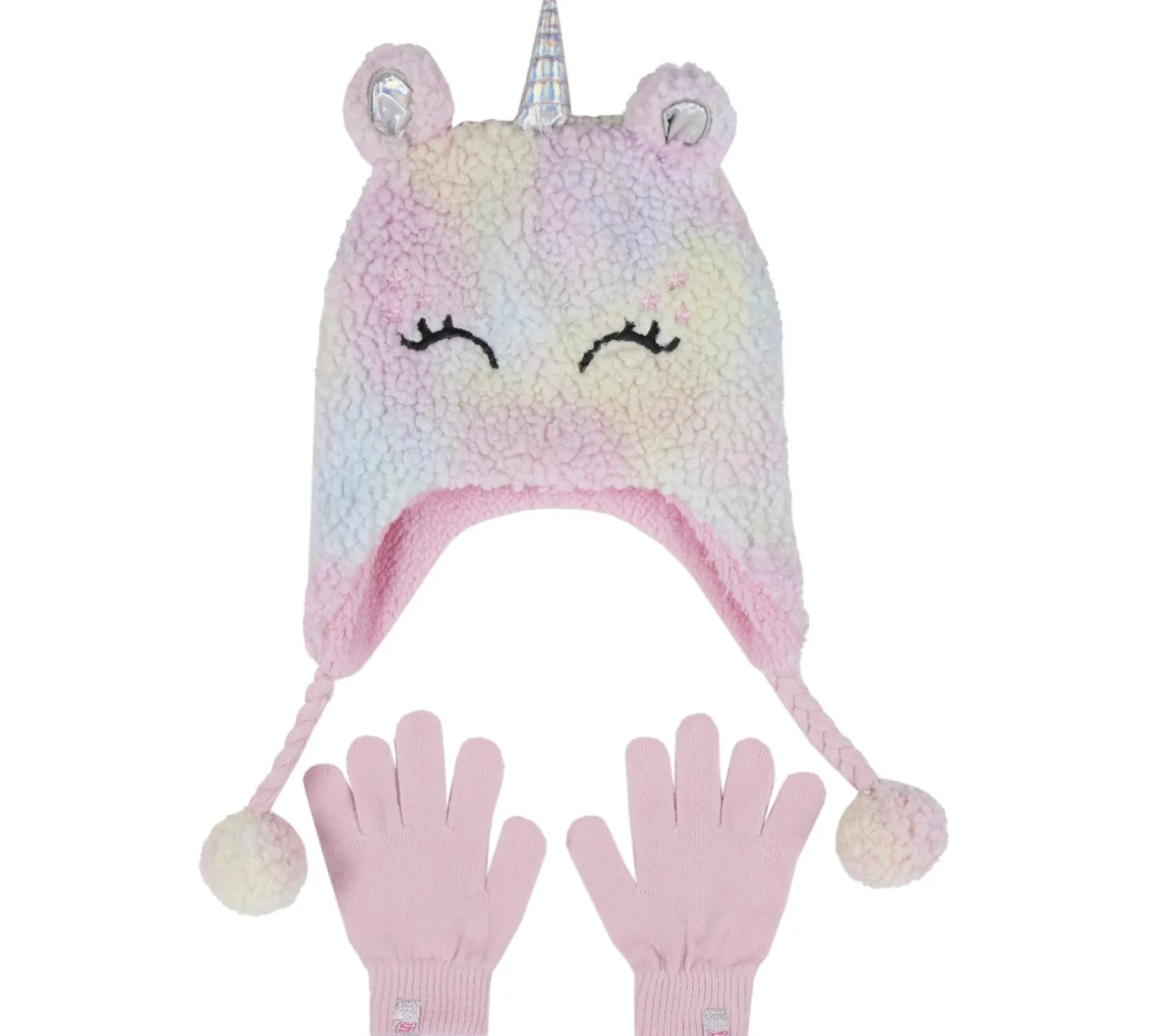Enjoy magical fuzzy warmth wearing Skechers Sherpa Unicorn Hat and Glove Set. This plush alpine style hat features pom-pom pulls with sleepy unicorn themed details, ear flaps, and a pair of coordinating solid color gloves.