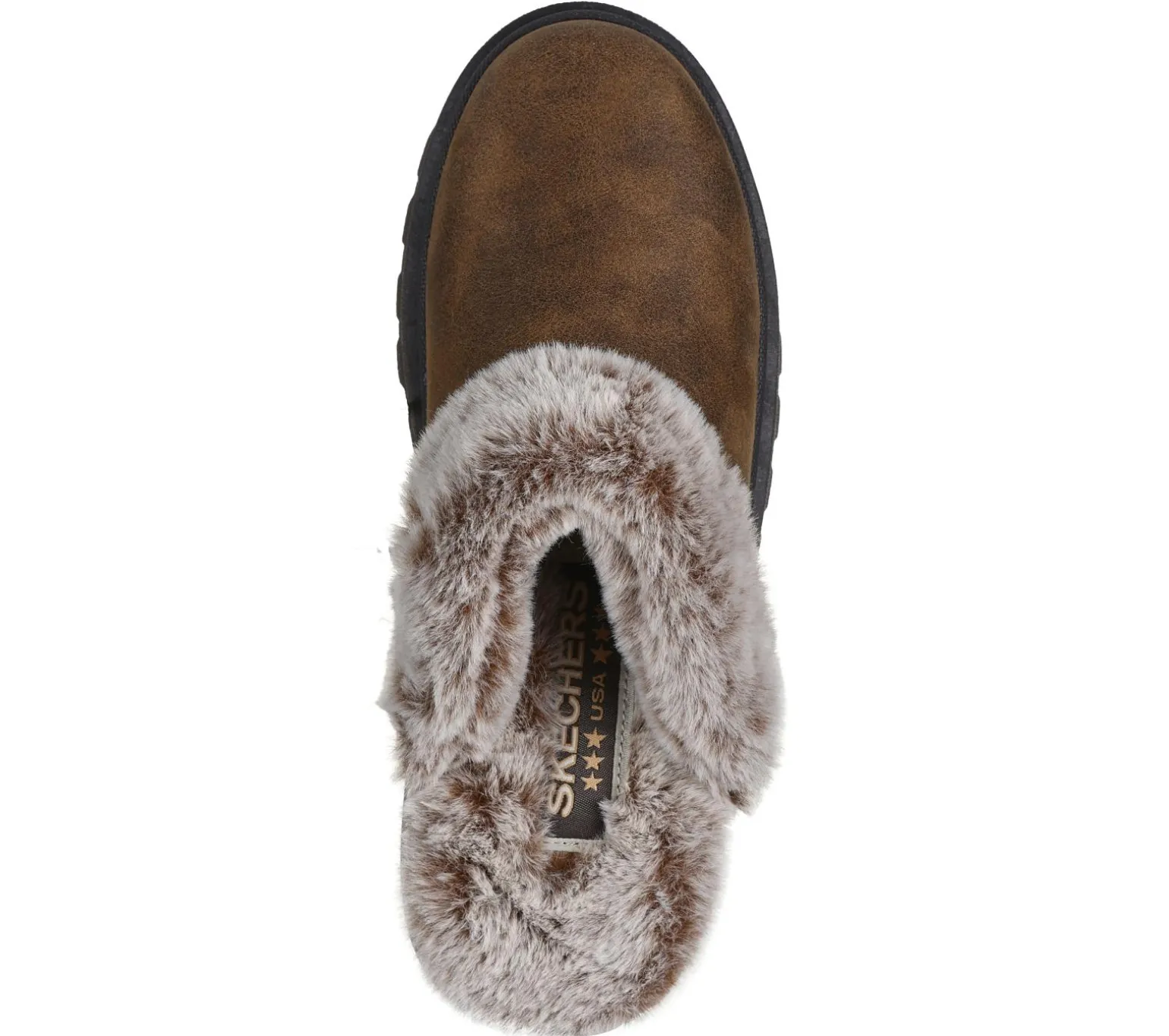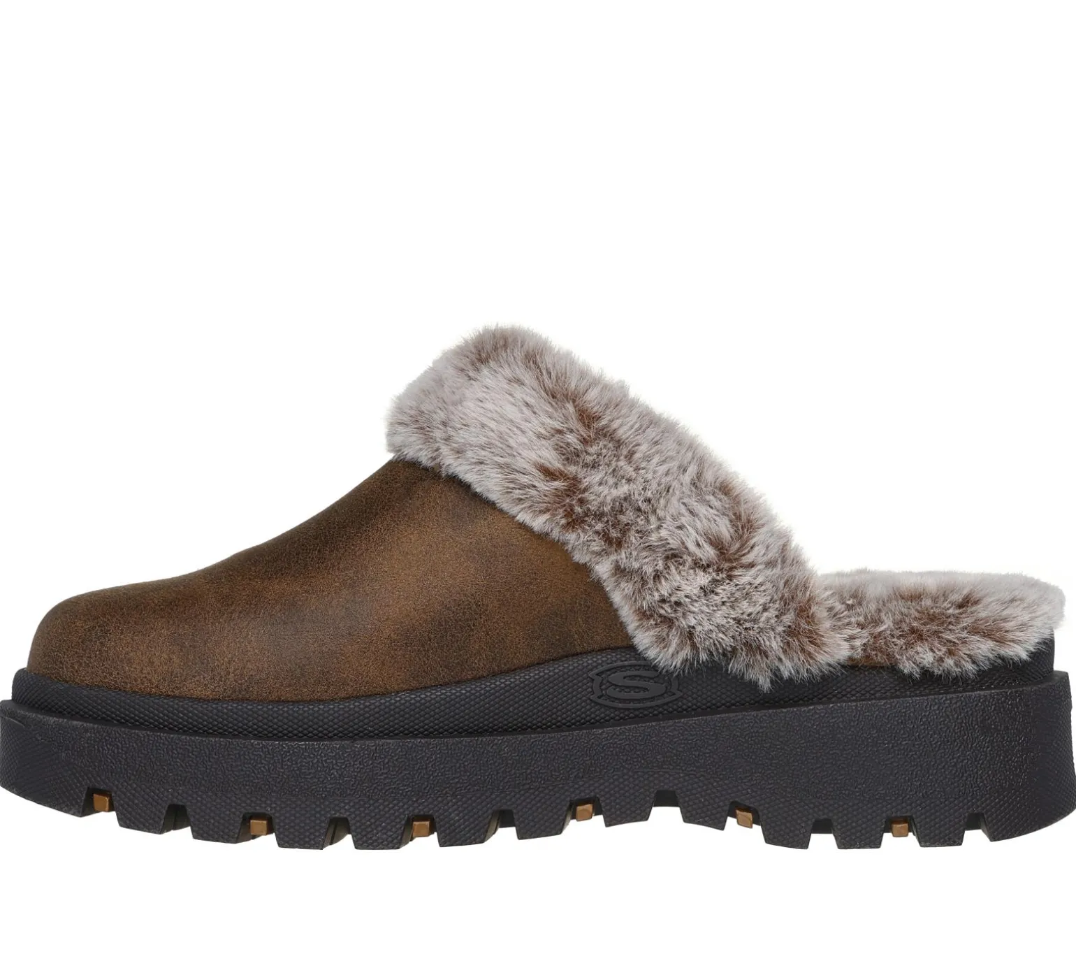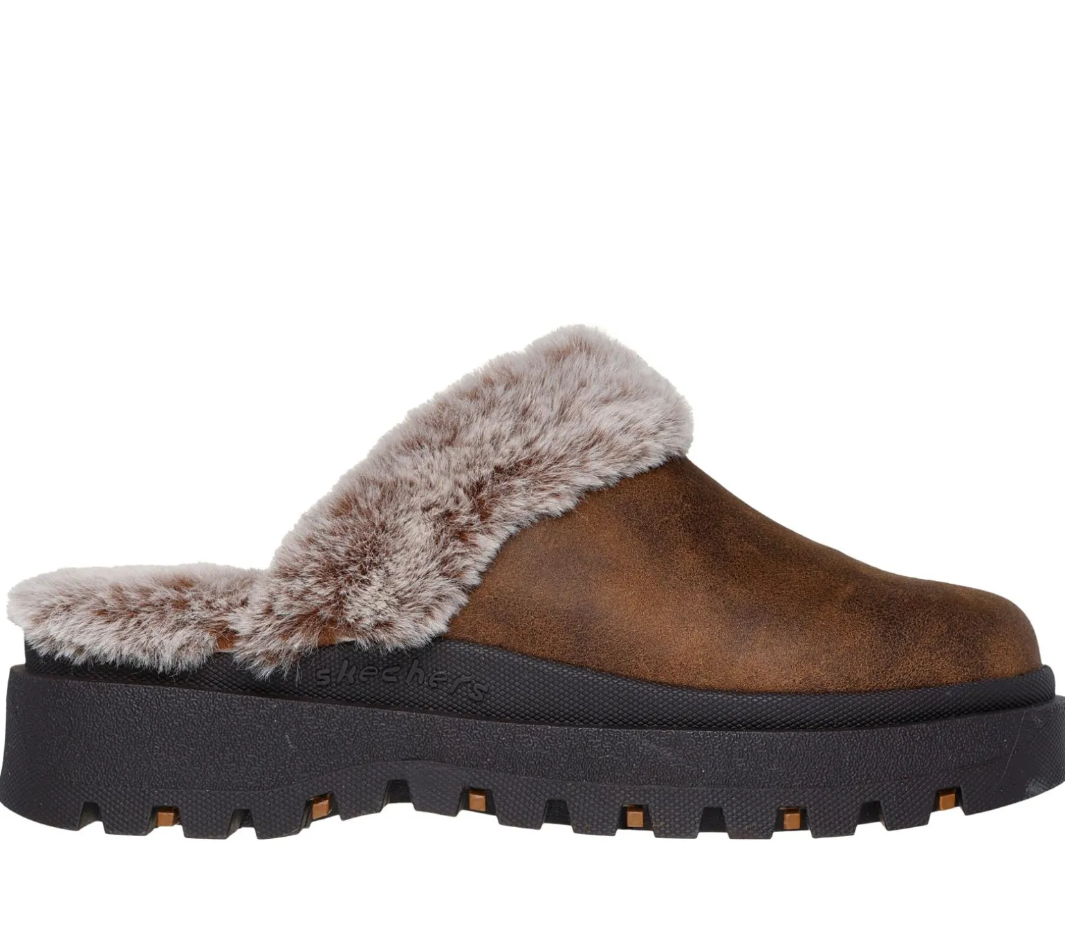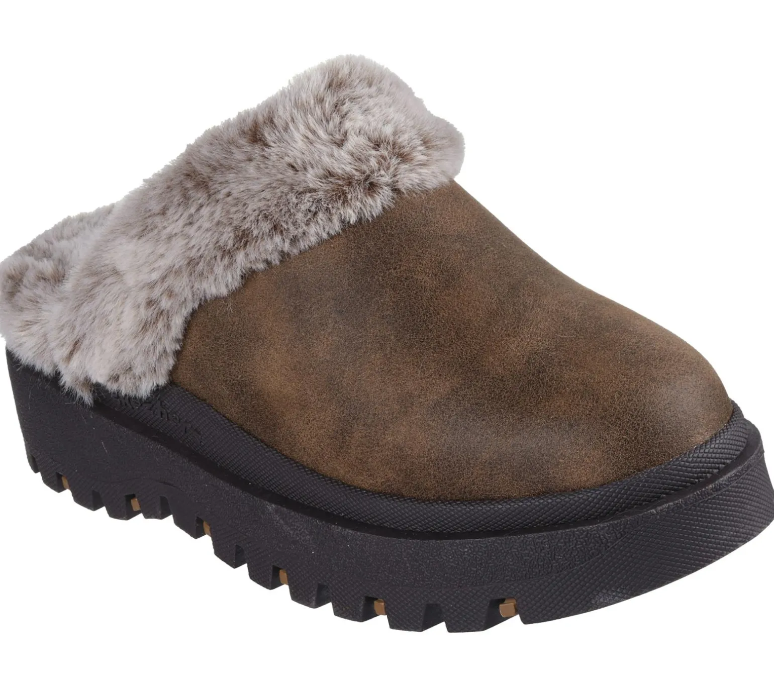 Stay cozy and comfortable all season in Skechers Shindigs – Comfyy! This vegan open-back clog design features a distressed leather-look textile upper with faux-fur trim and lining, platform midsole, and a cushioned Skechers Memory Foam insole.