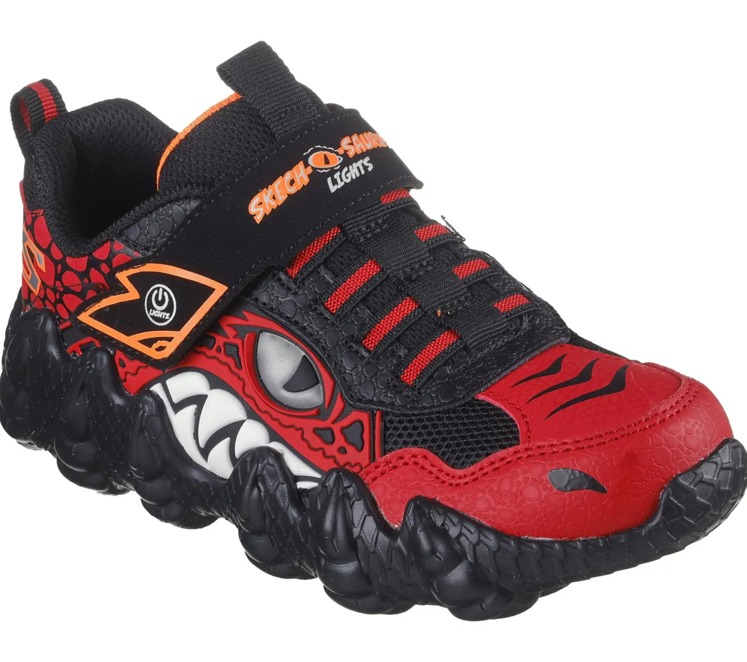Stomp in roar-some fun and comfort wearing Skechers Skech-O-Saurus – Rapid-Dino. This light-up dinosaur theme design features a reptilian style mesh and synthetic upper with stretch laces, Skechers Adaptive Closure and a T-Rex heeled midsole.
